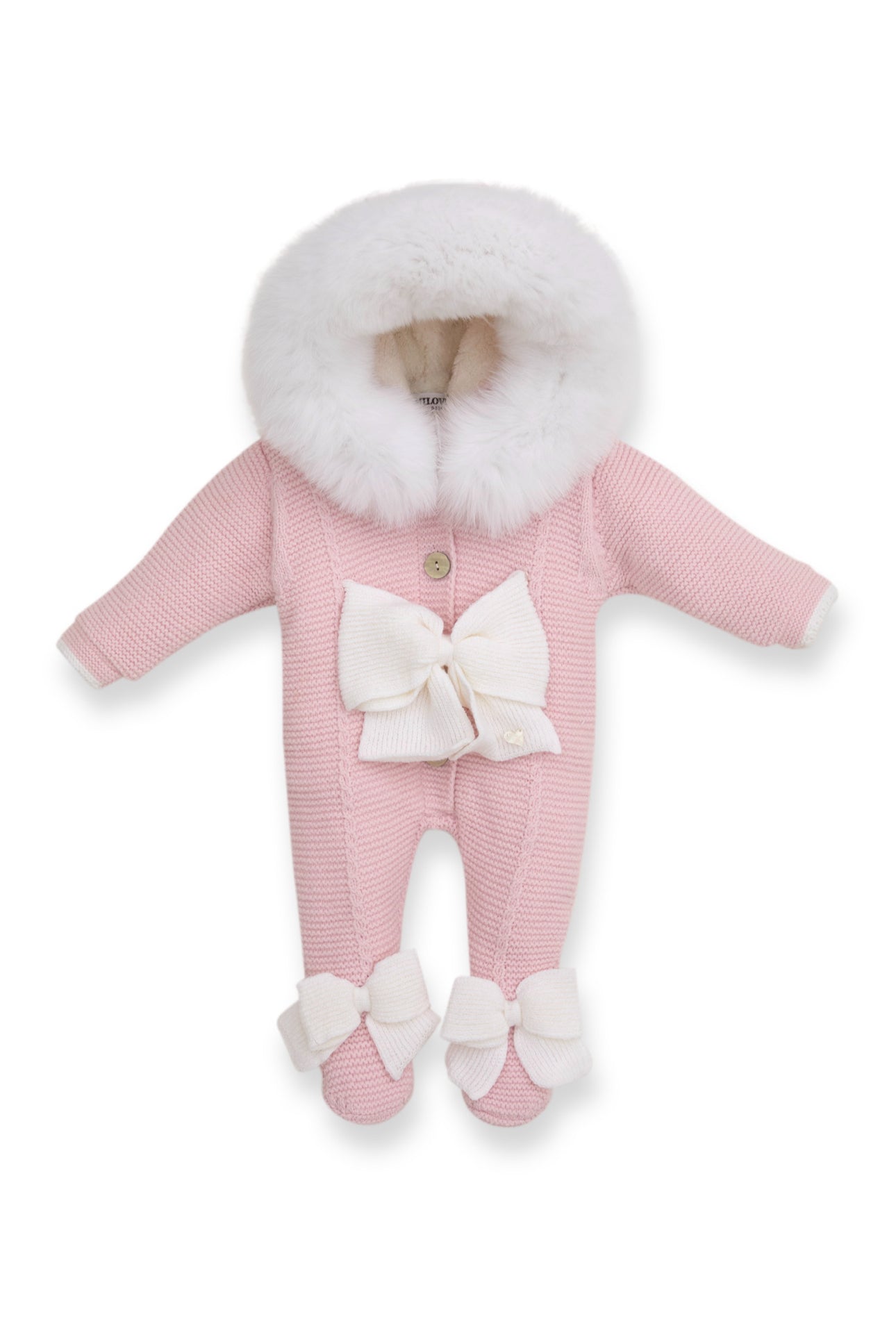 Pink MI LOVES SIGNATURE Little Doll Pramsuit with White/Ivory Fox fur trim and Bow details..Beautiful and Luxurious Pramsuit featuring detachable Fox fur trim on the hood and Beautiful Ivory Bow details.