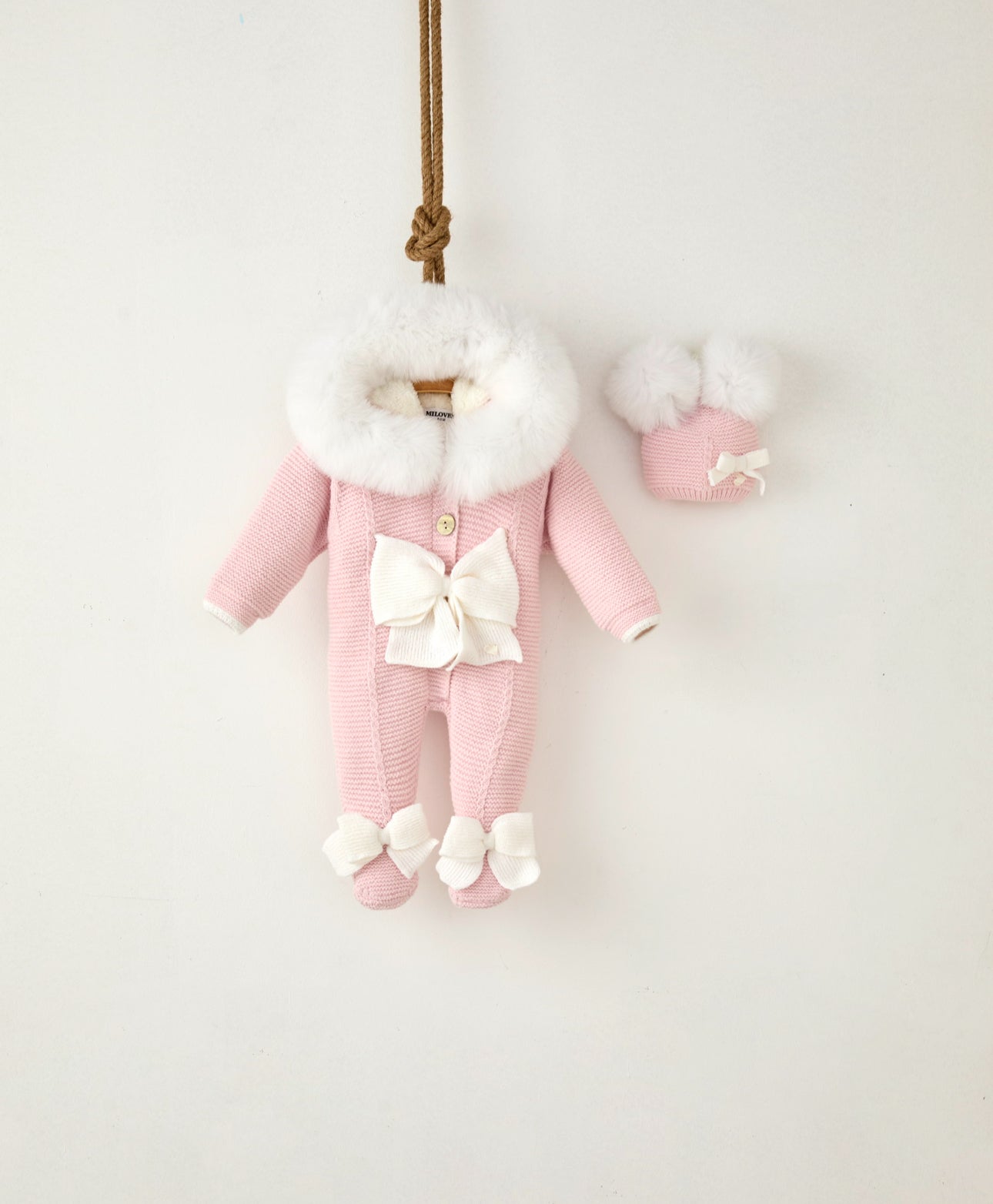 Pink MI LOVES SIGNATURE Little Doll Pramsuit with White/Ivory Fox fur trim and Bow details.