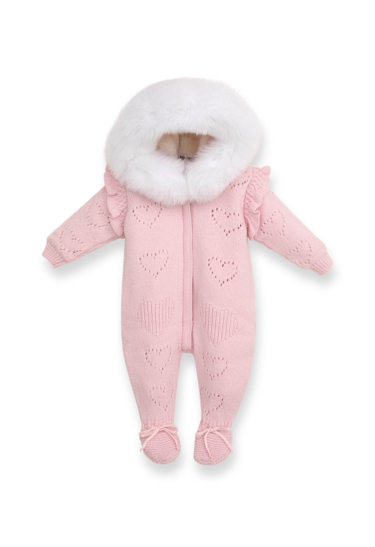 Pink MI LOVES SIGNATURE Little Hearts Pramsuit with White/Ivory Fox fur trim.