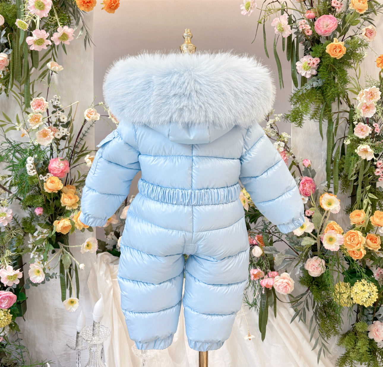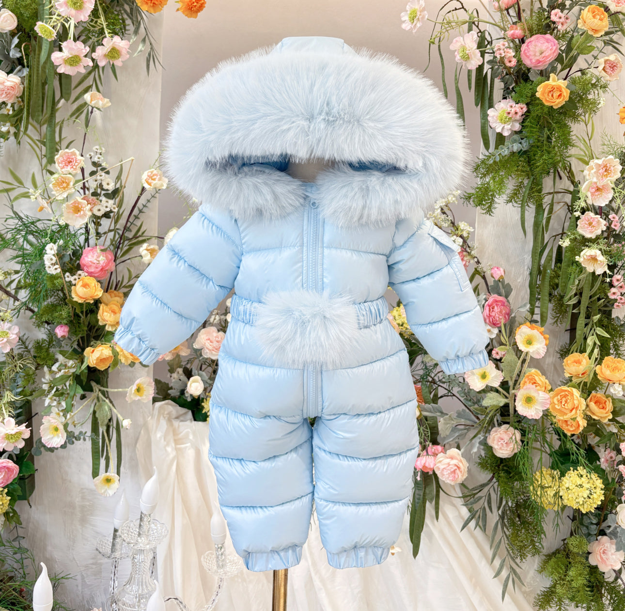 Signature Unisex winter Snowsuit with Synthetic fur trim in Baby Blue.