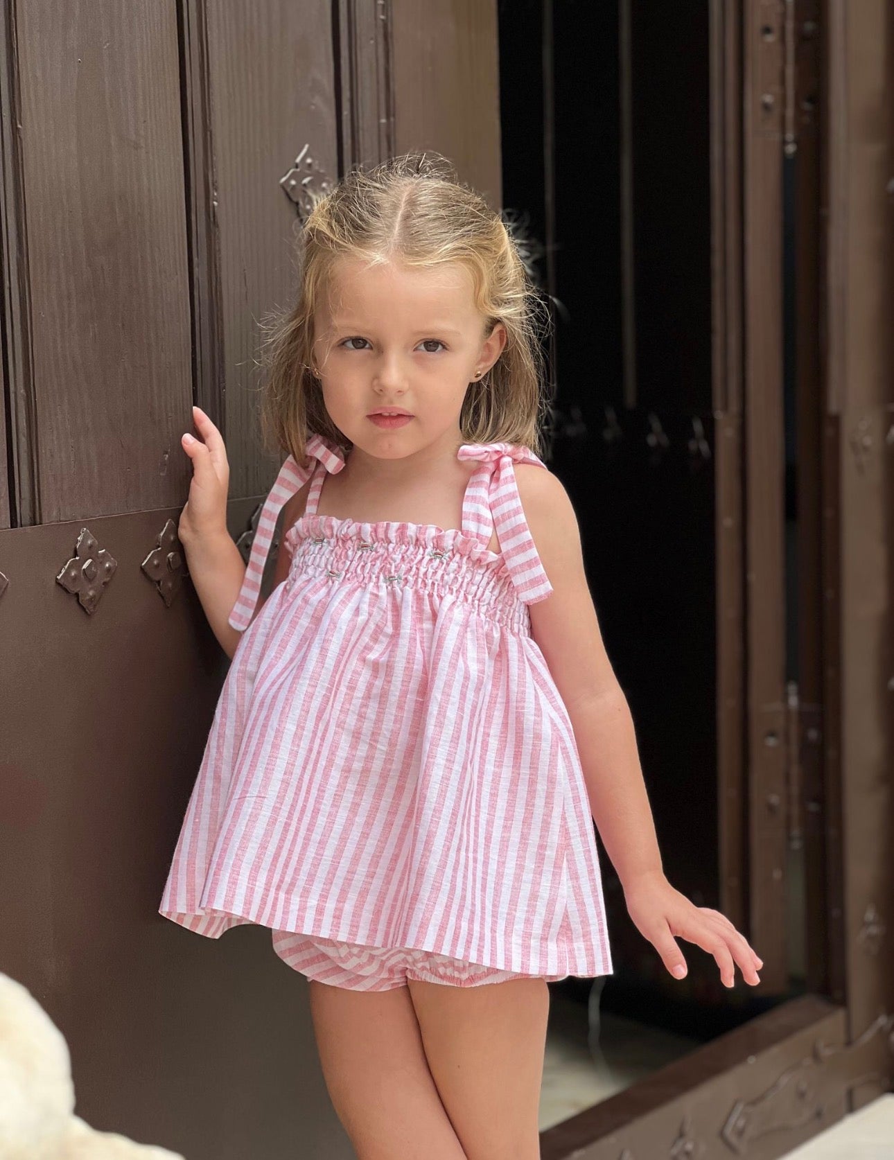 PRE ORDER(delivery at the end of February)MI LOVES SIGNATURE Stripe print Top/bloomers set with Beautiful Hand Smoked details.