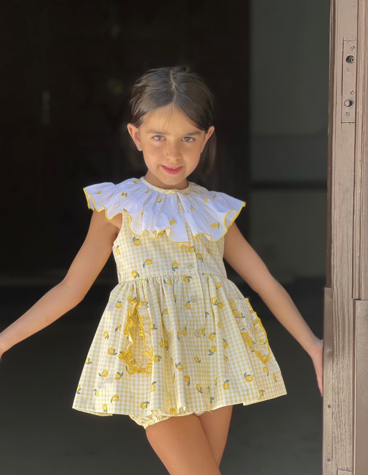 MI LOVES SIGNATURE Lemon print Dress/Bloomers set with Beautiful smoke details.