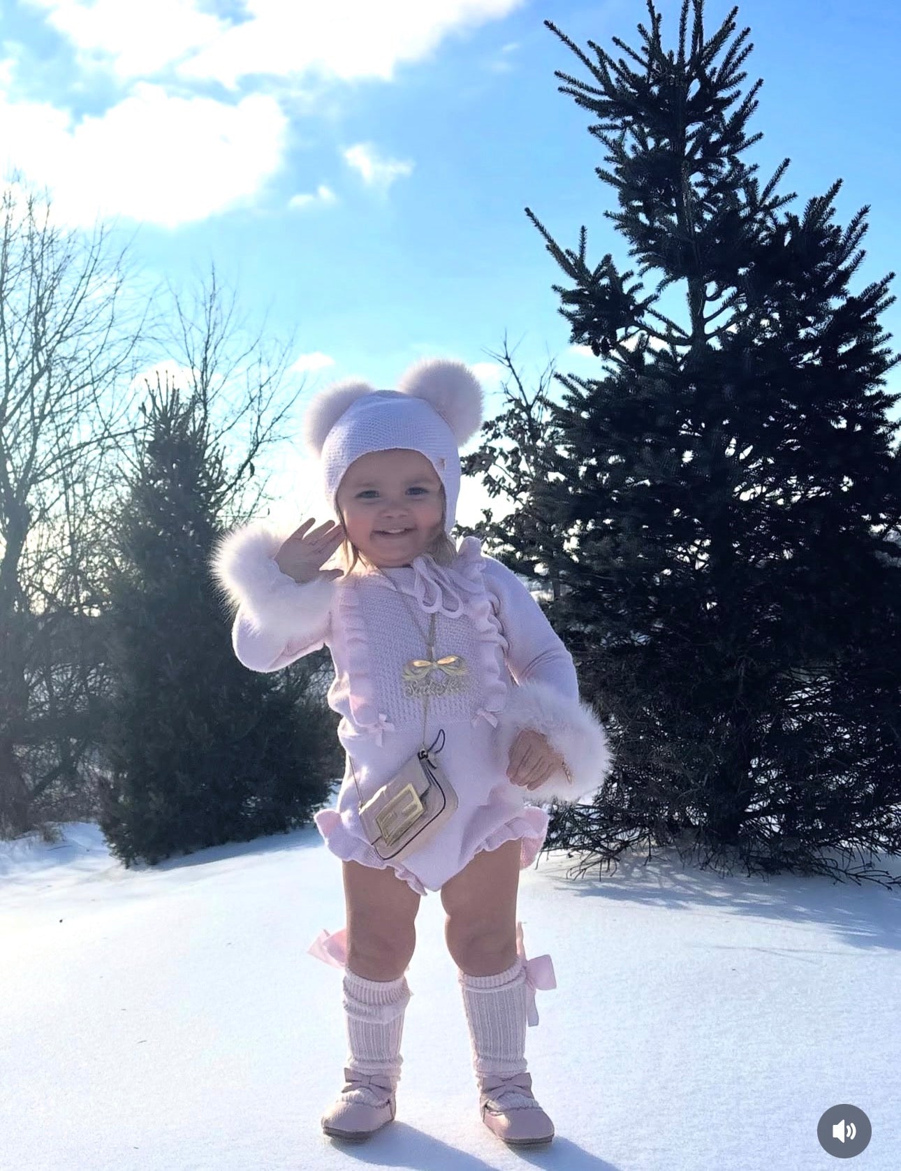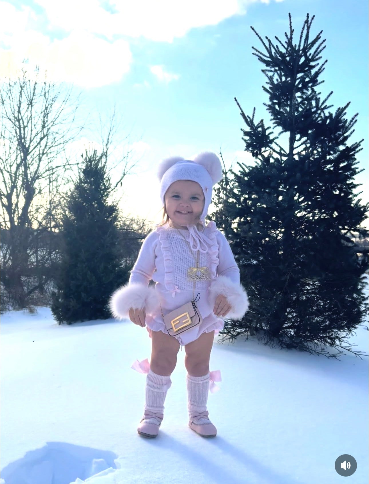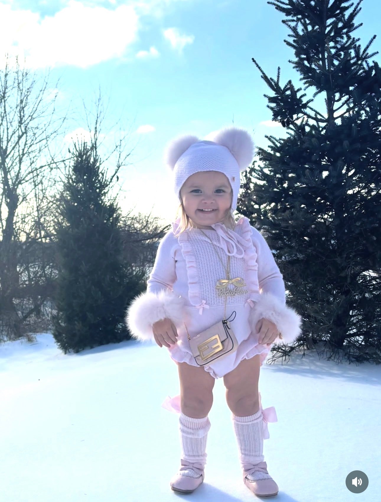 Baby pink Knitted Romper with fox fur trim on the sleeves.