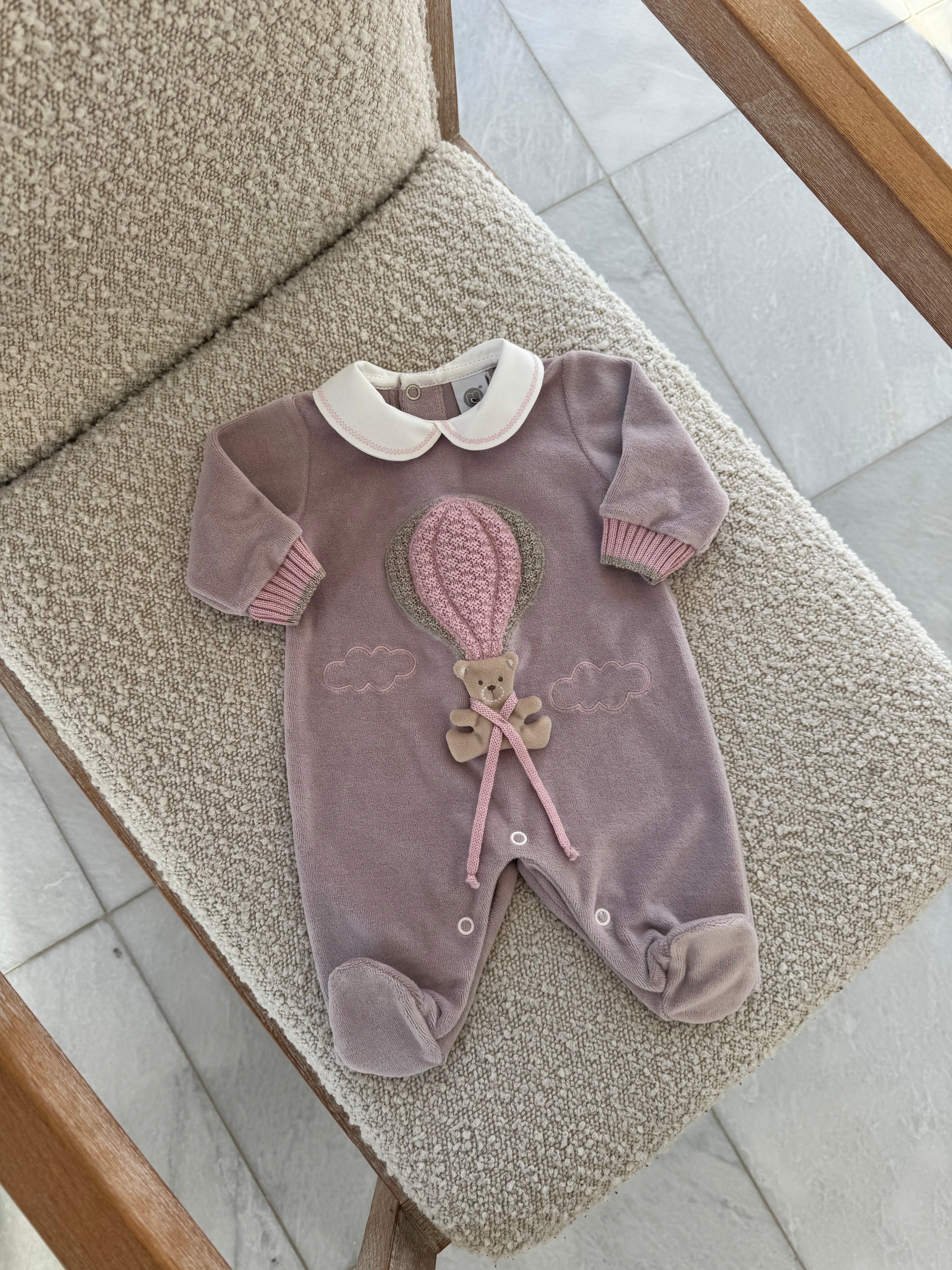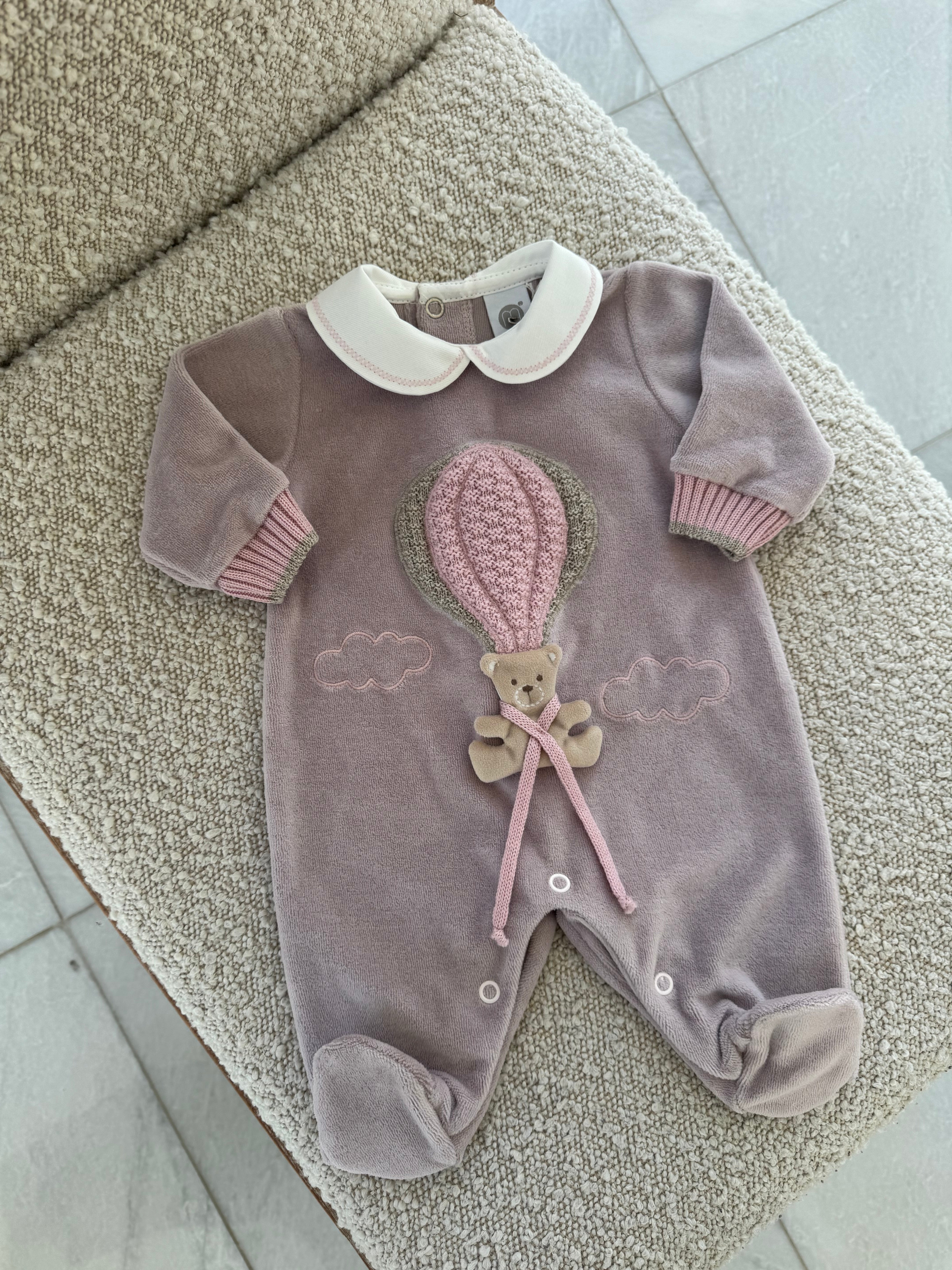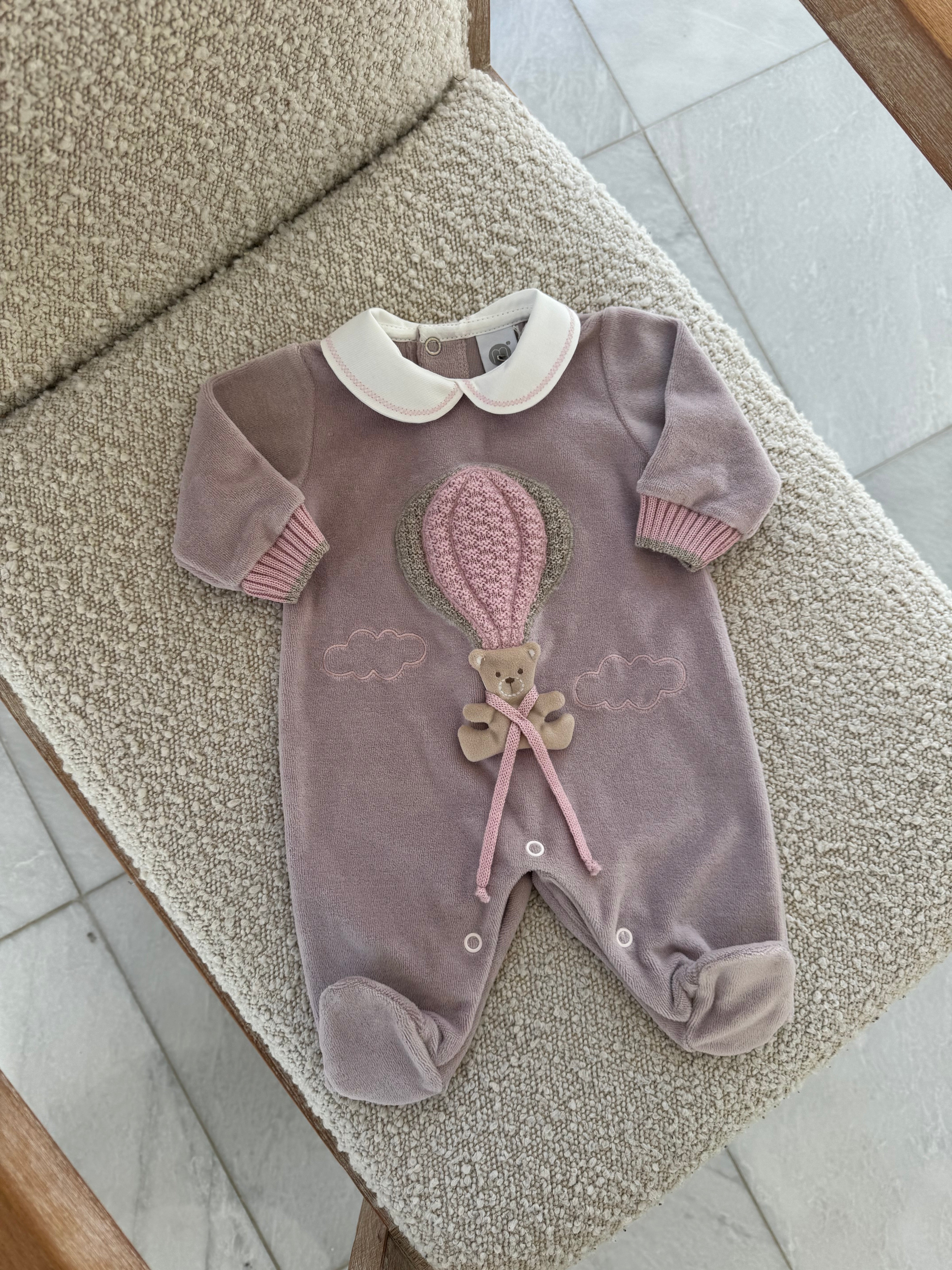 Beautiful Dusty Pink Velure Baby grow with Bear/Air Balloon details.