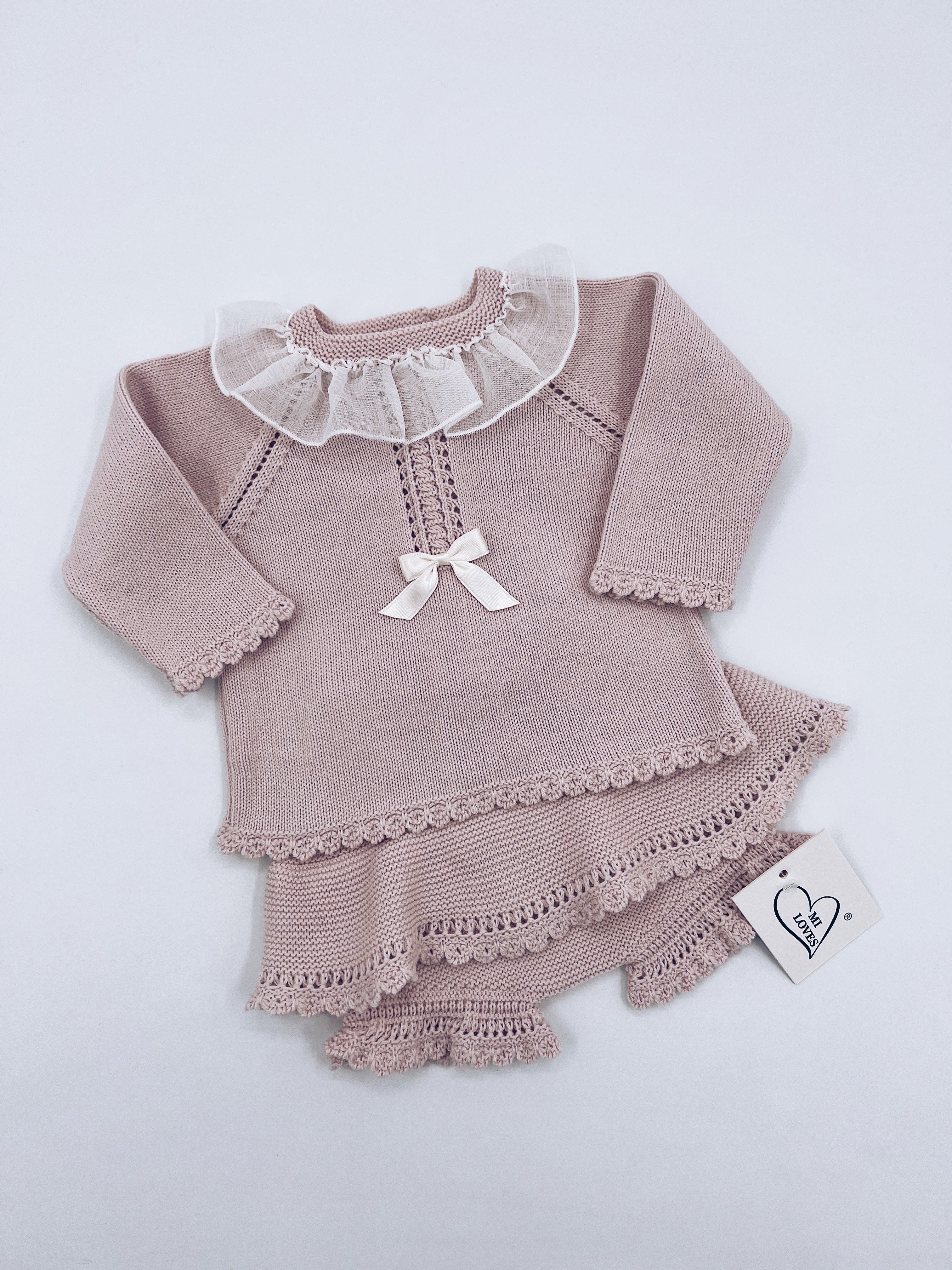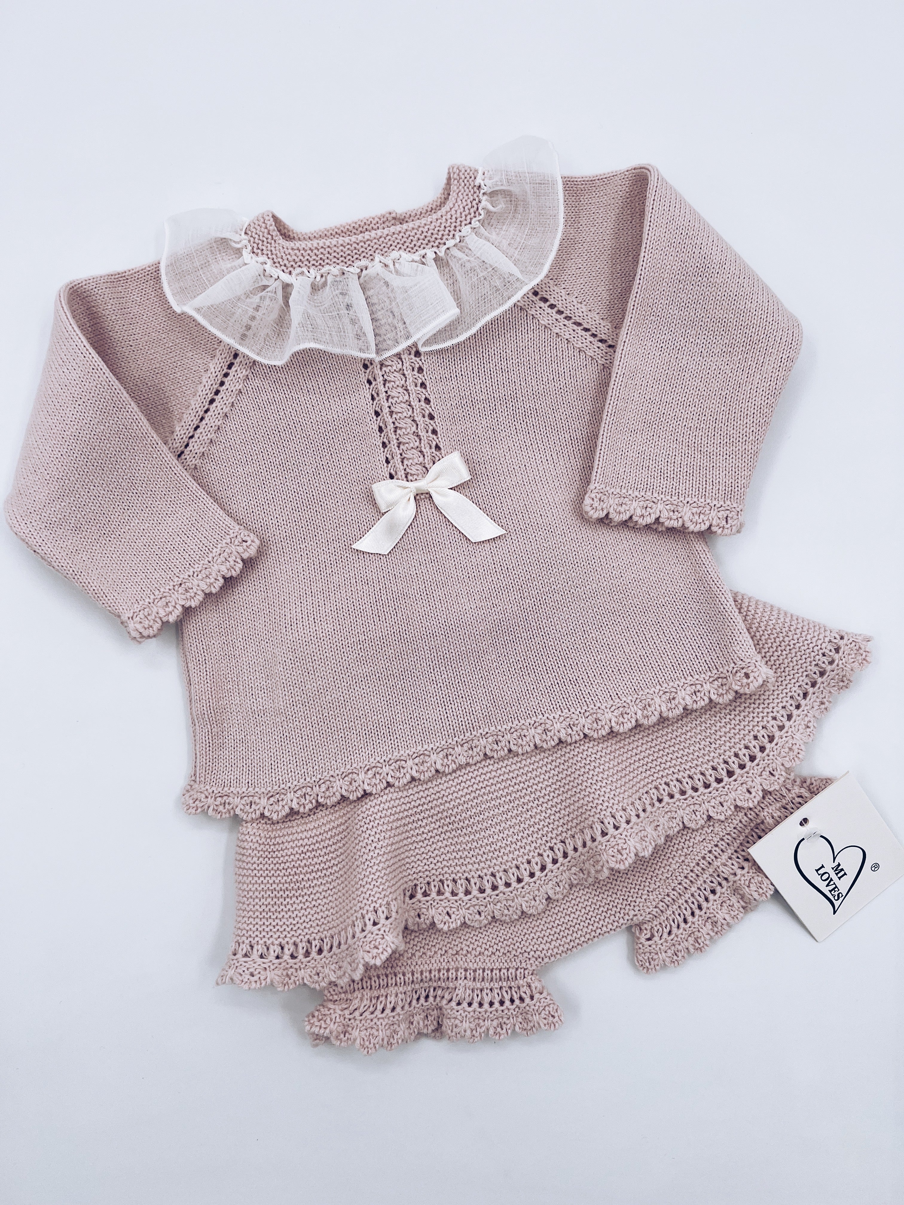 Beautiful Dusty pink 2 piece baby set with pretty frill details on the bloomers.