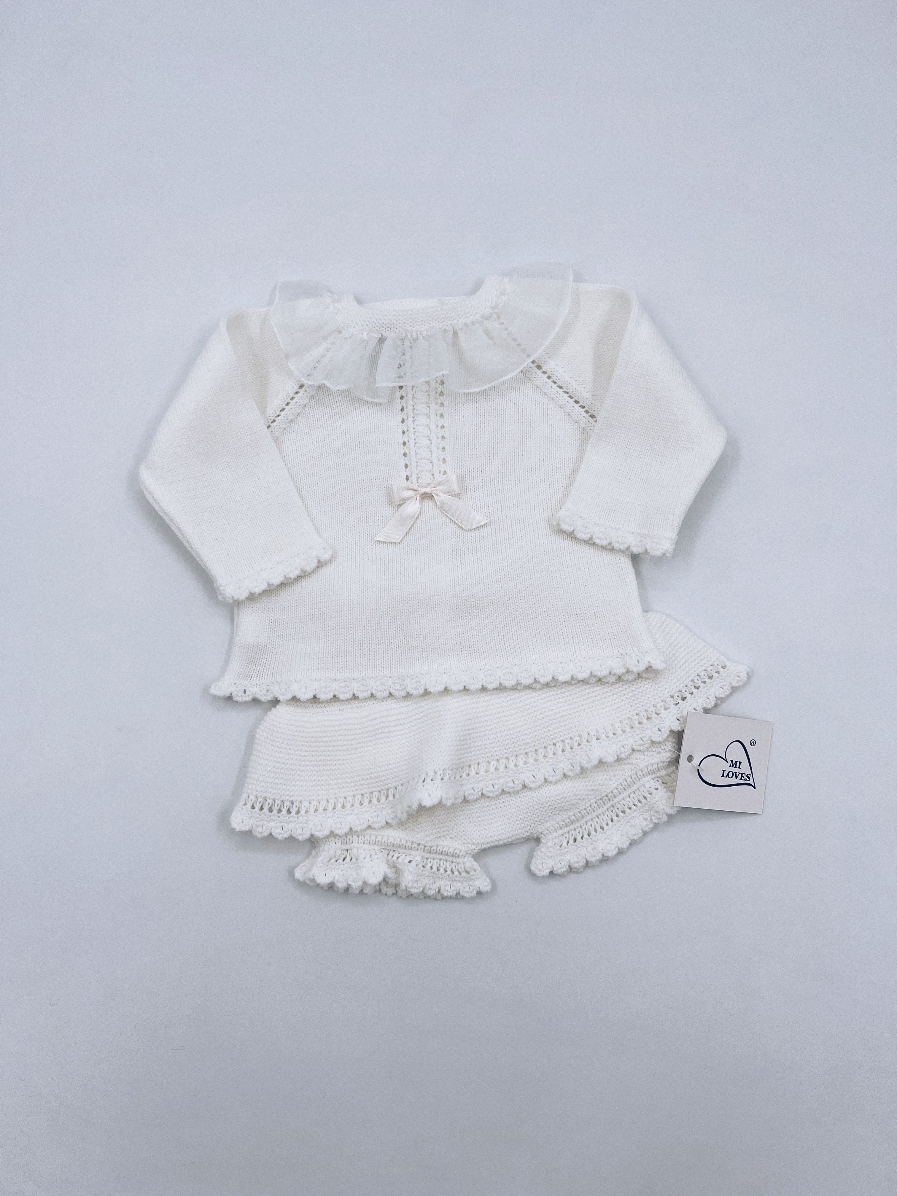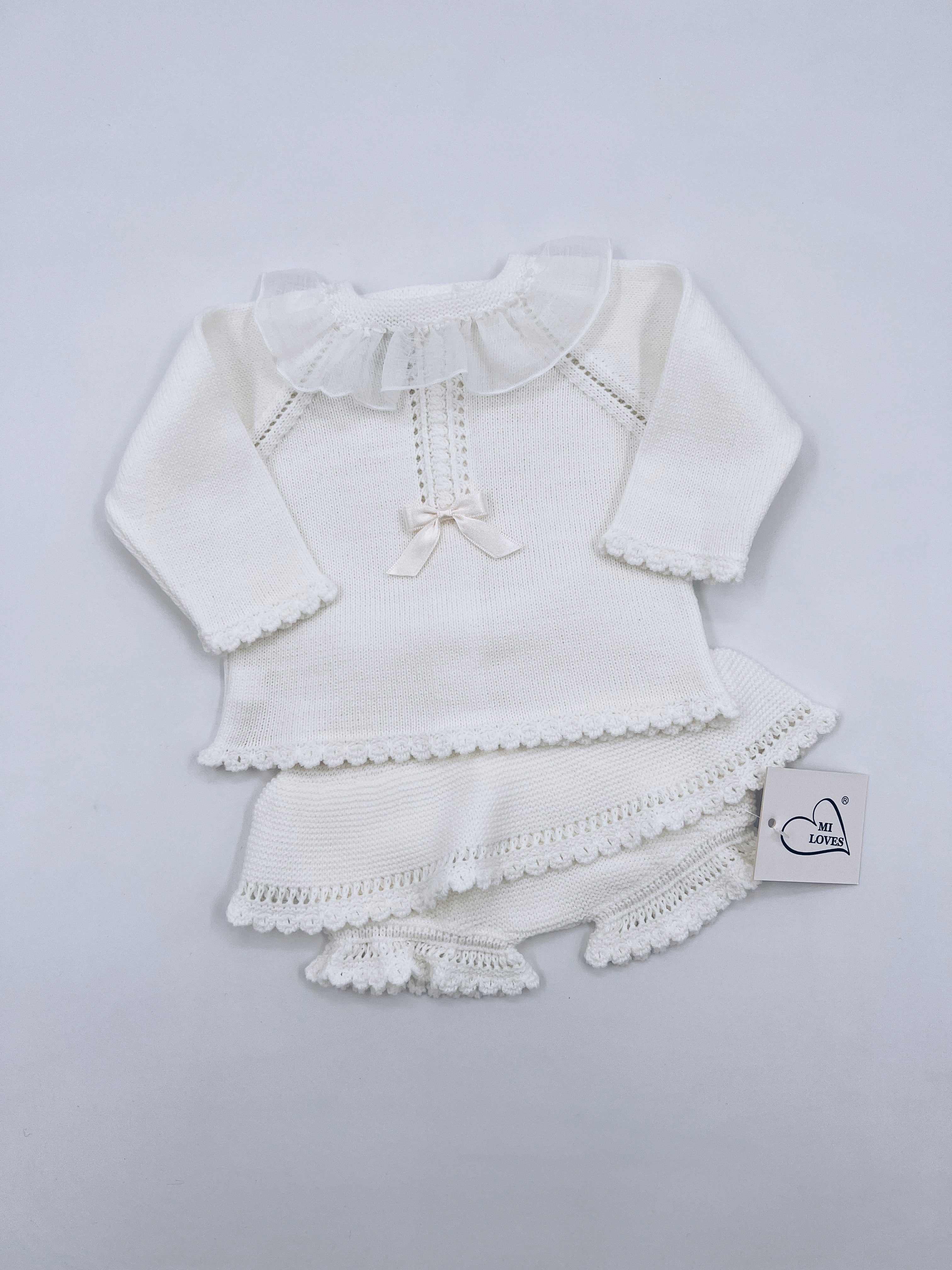 Beautiful Ivory 2 piece baby set with pretty frill details on the bloomers.
