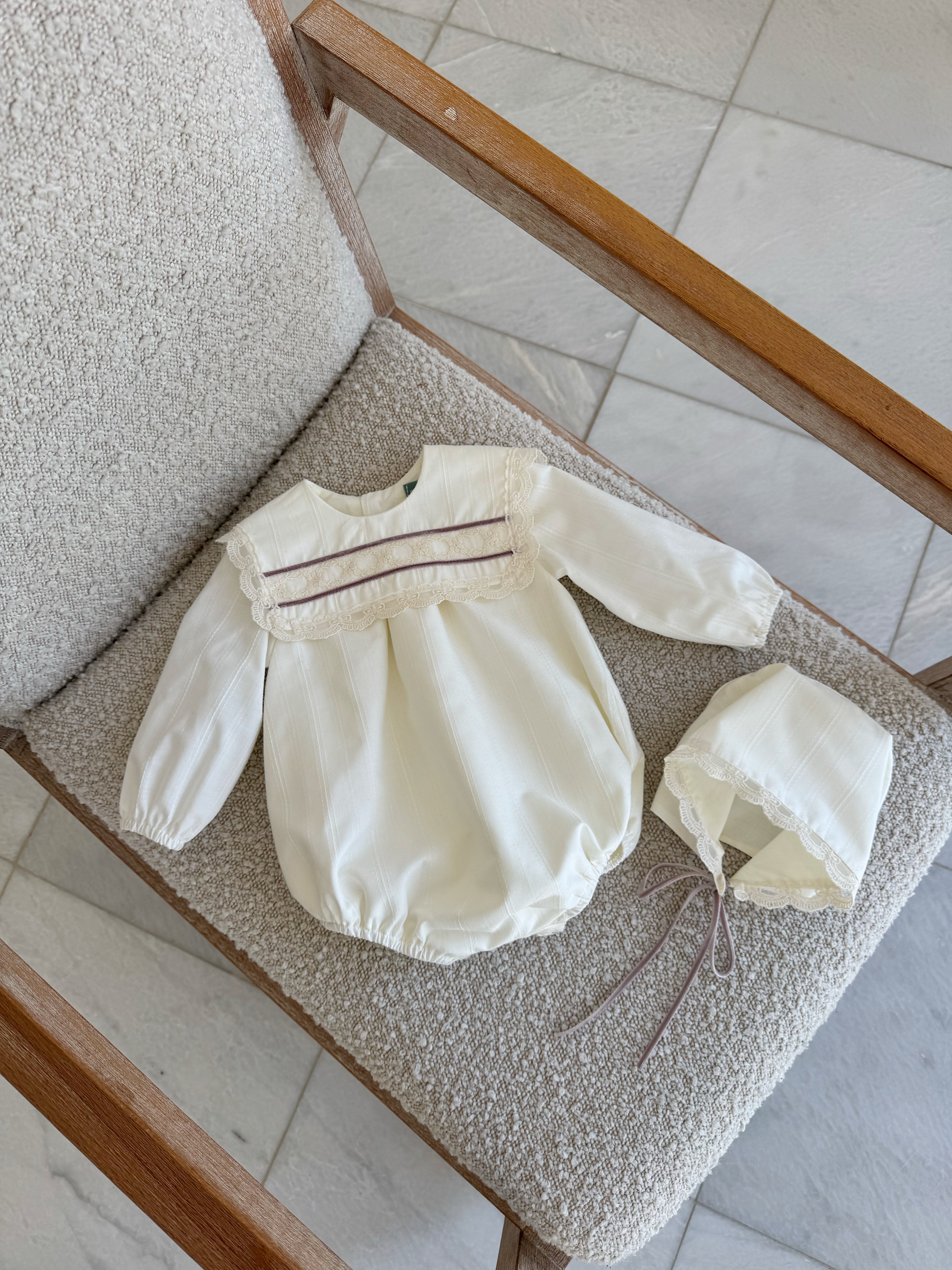 Beautiful Ivory Romper/Bonnet 2 piece set with Dusty pink details.