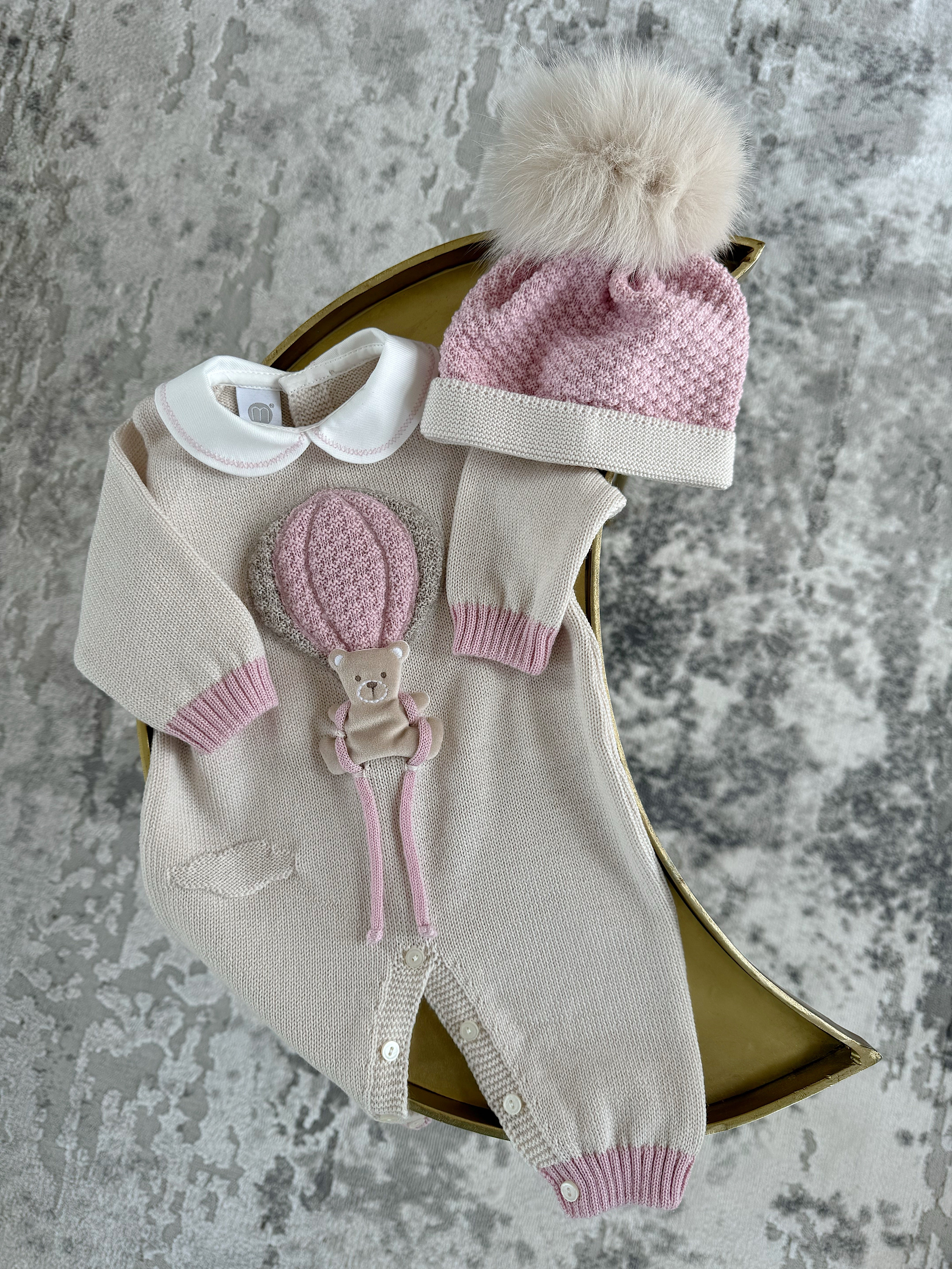 Beautiful knitted Merino Wool Cream/Pink Baby Romper with Bear/Air Balloon details.