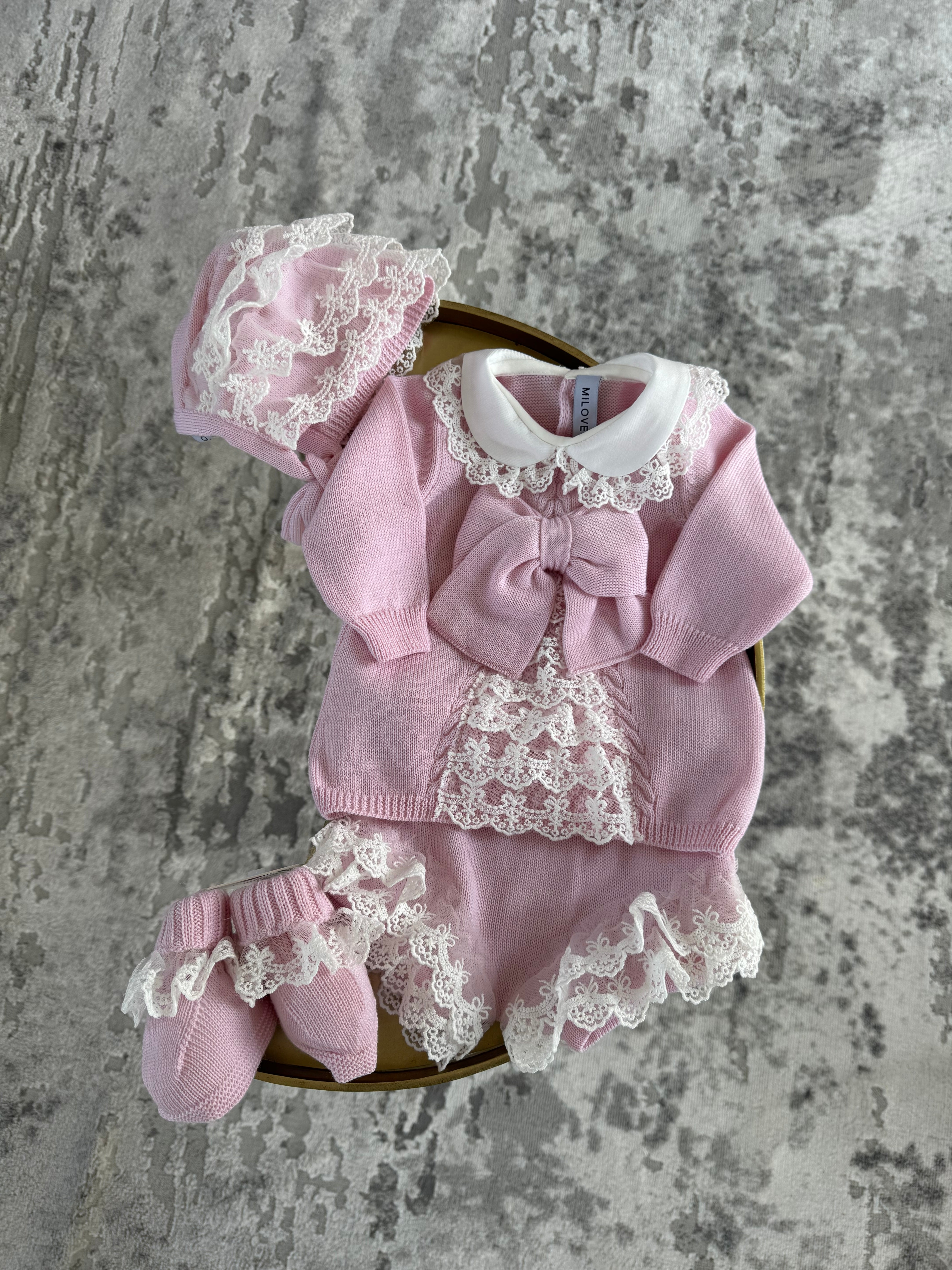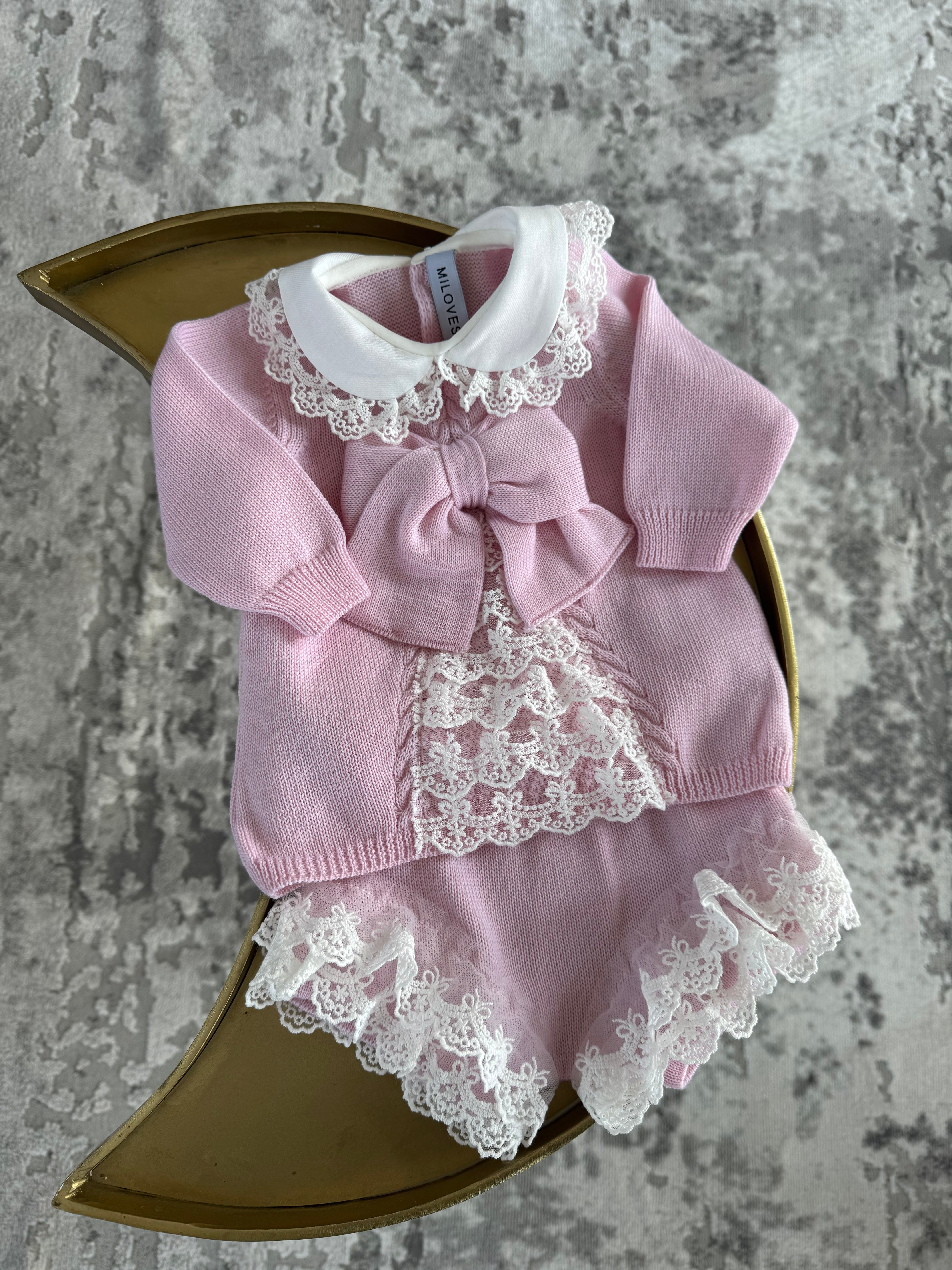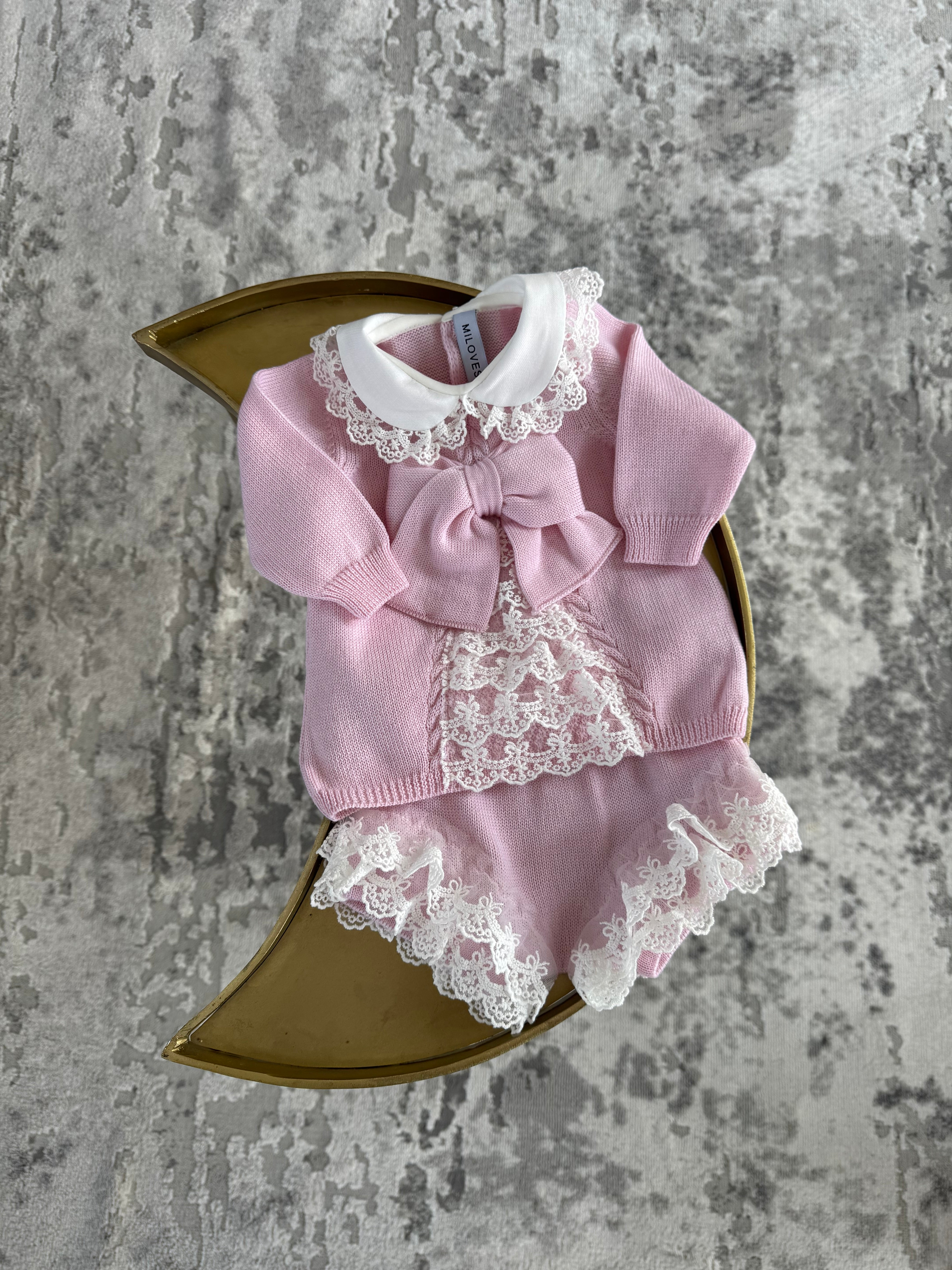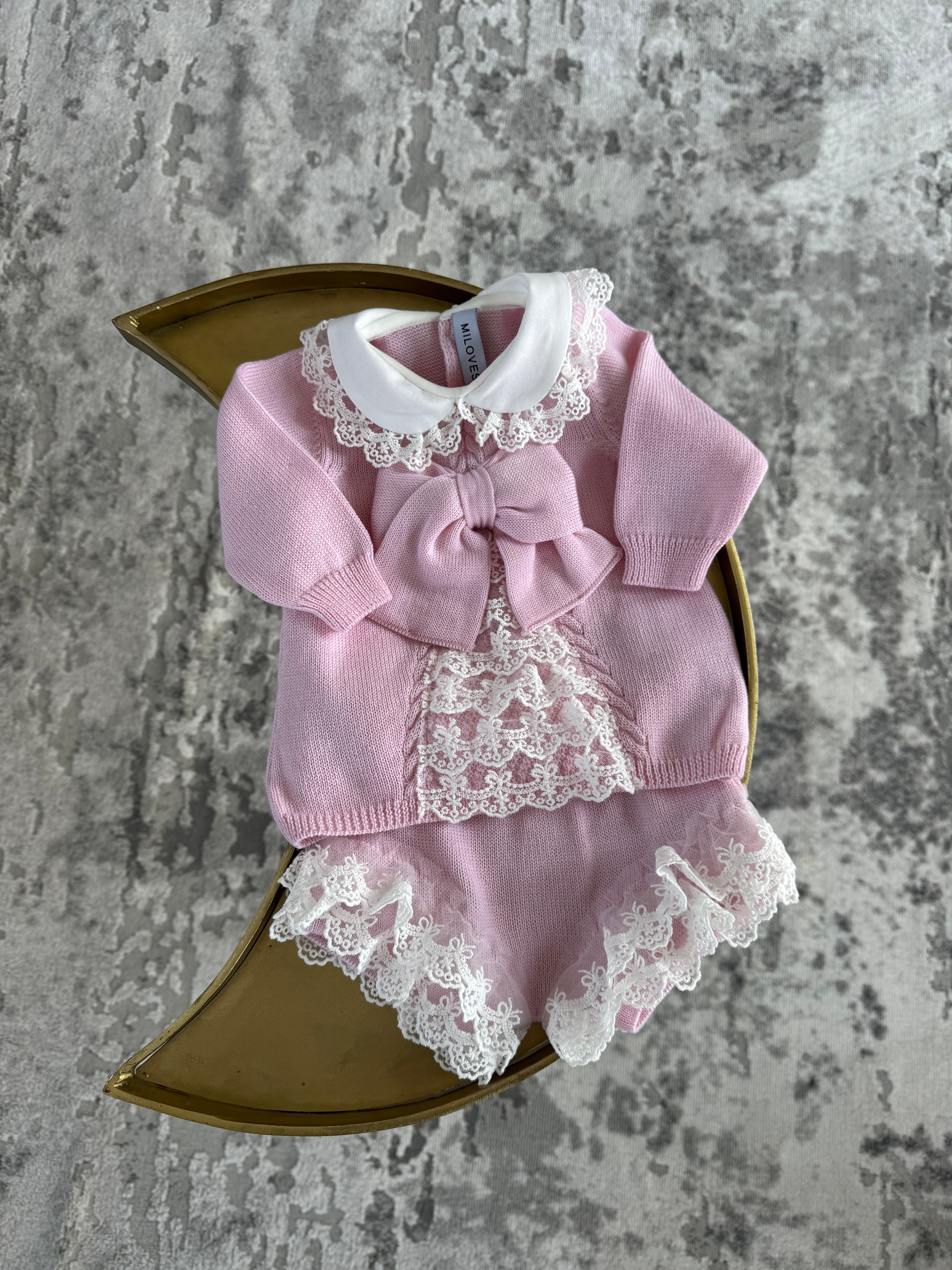 Beautiful knitted Merino Wool Pink Baby Girl Top/Shorts 2 piece set with lace details.