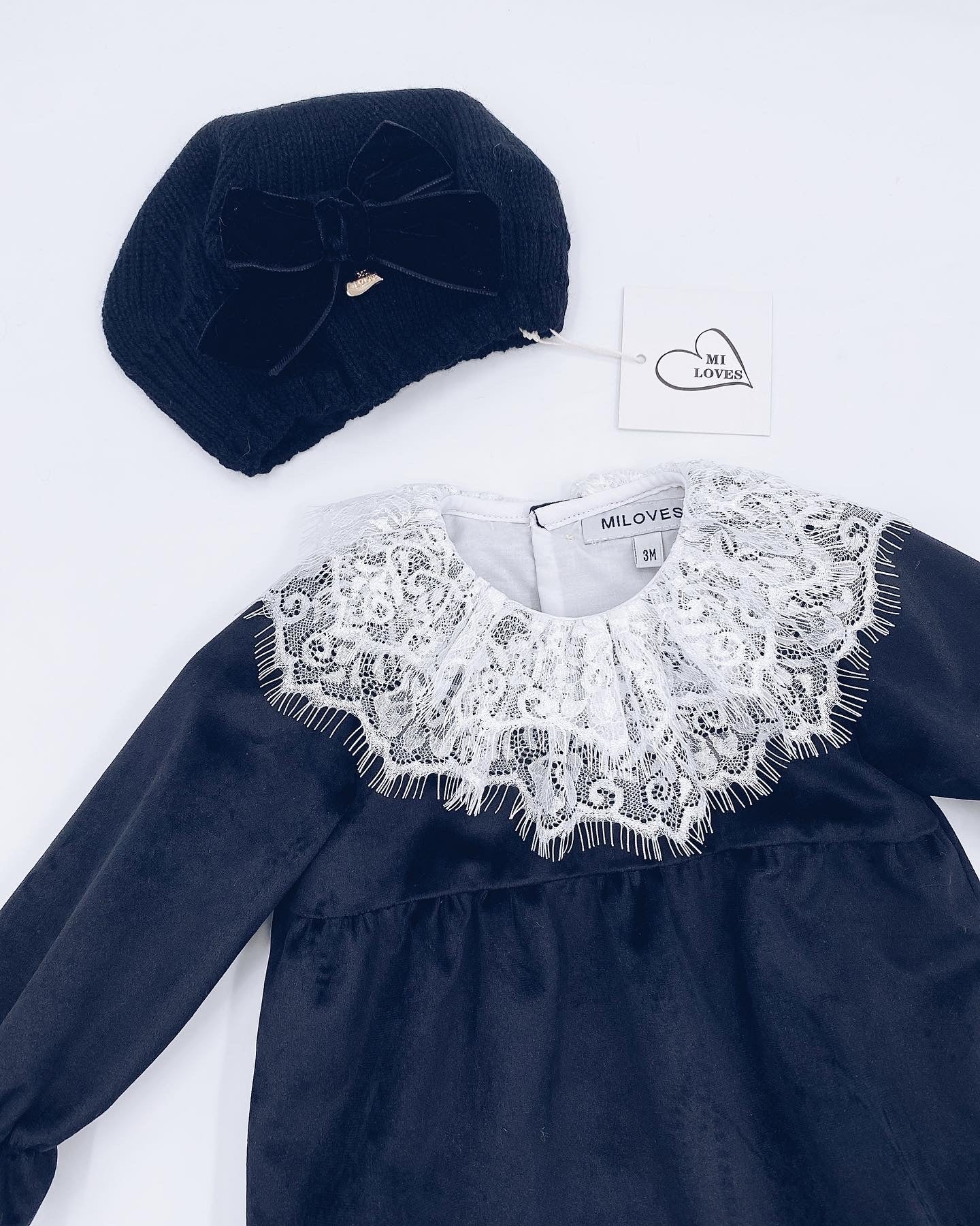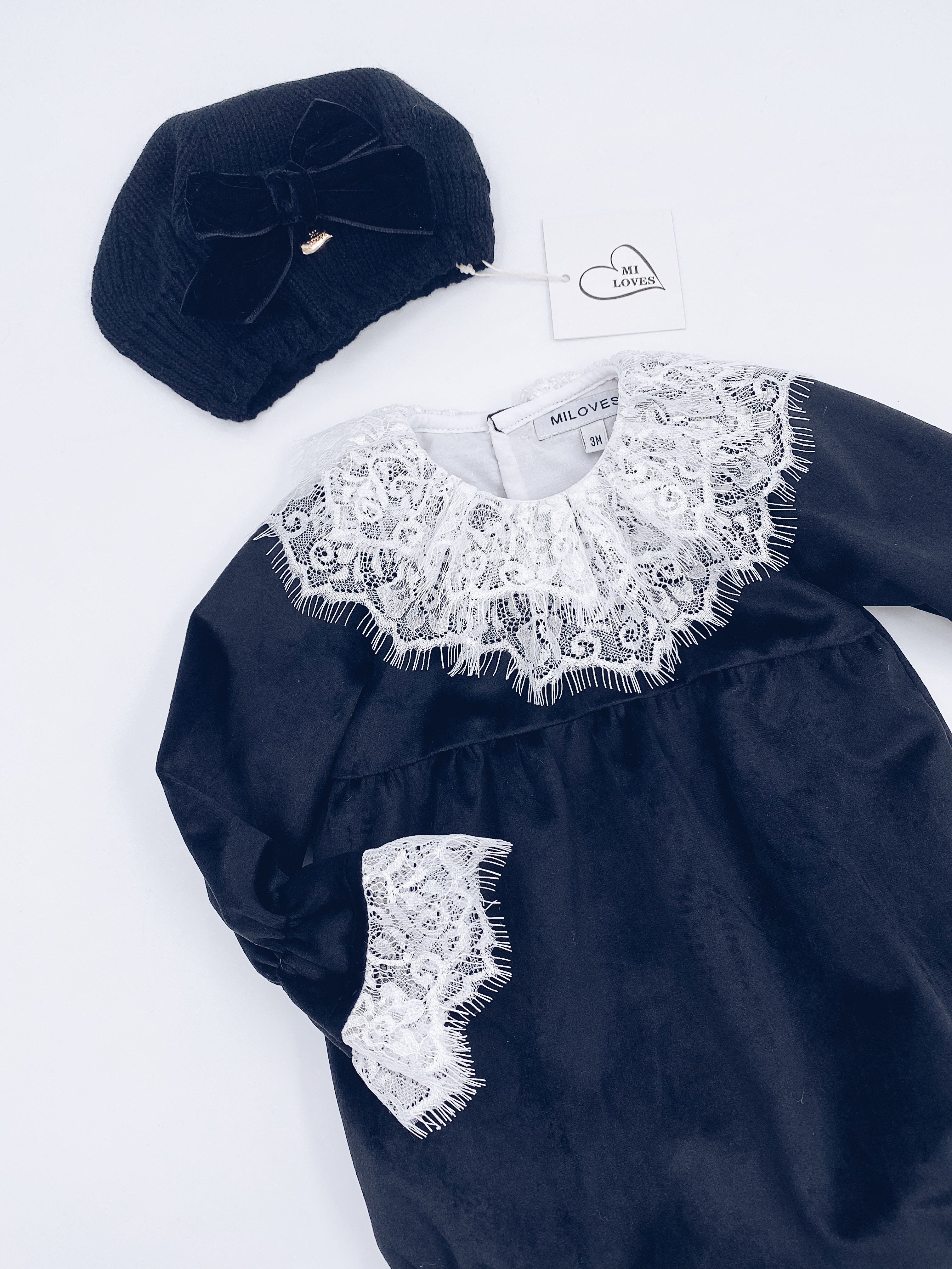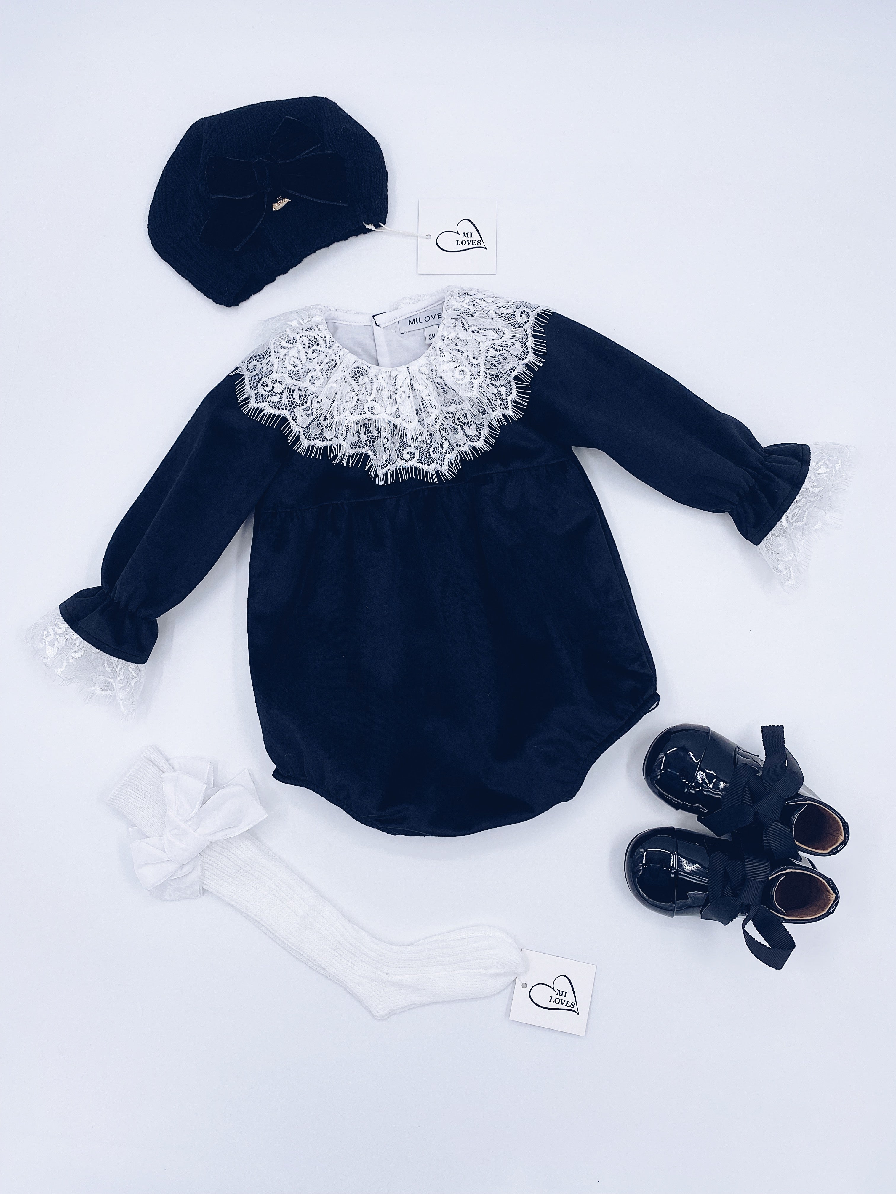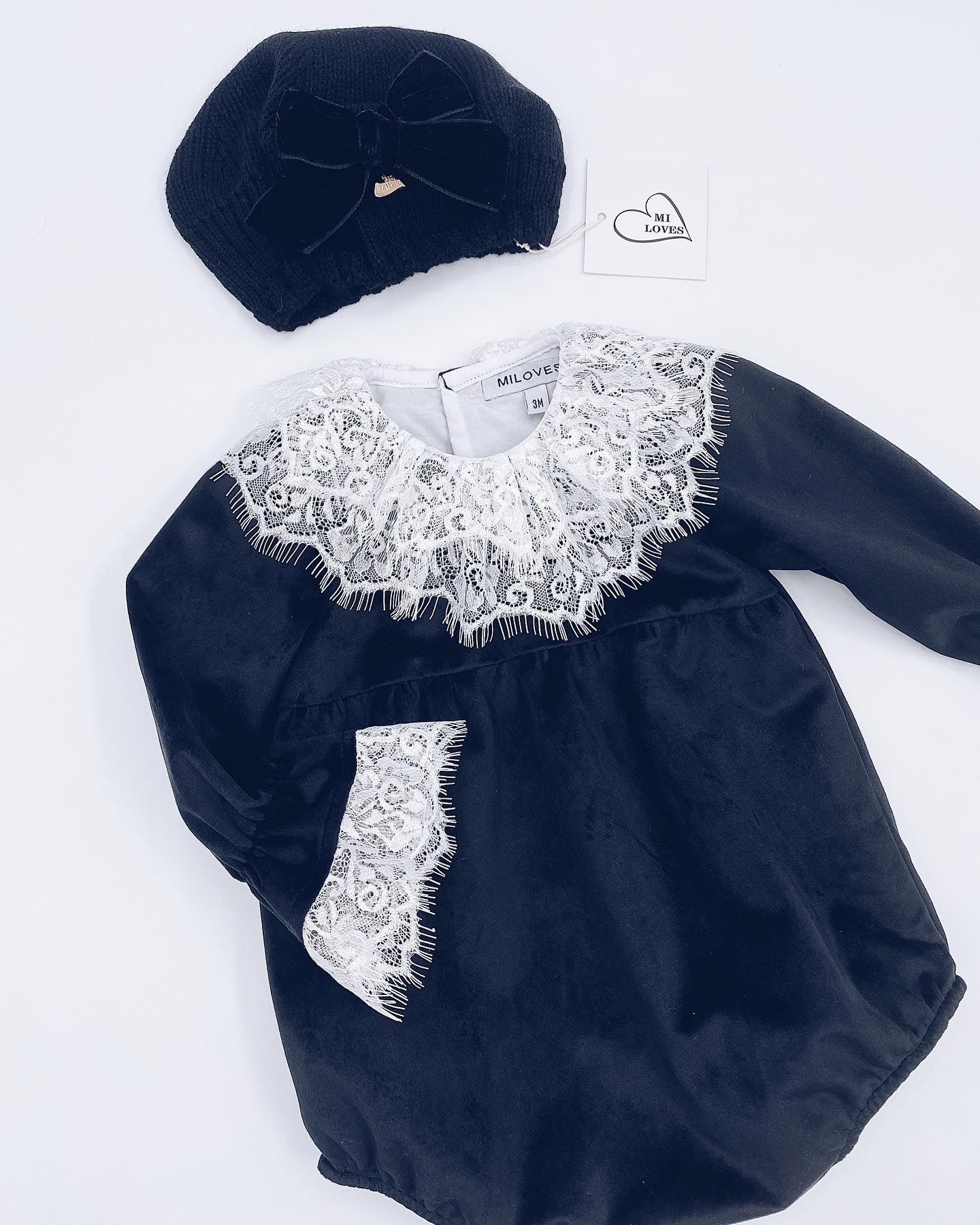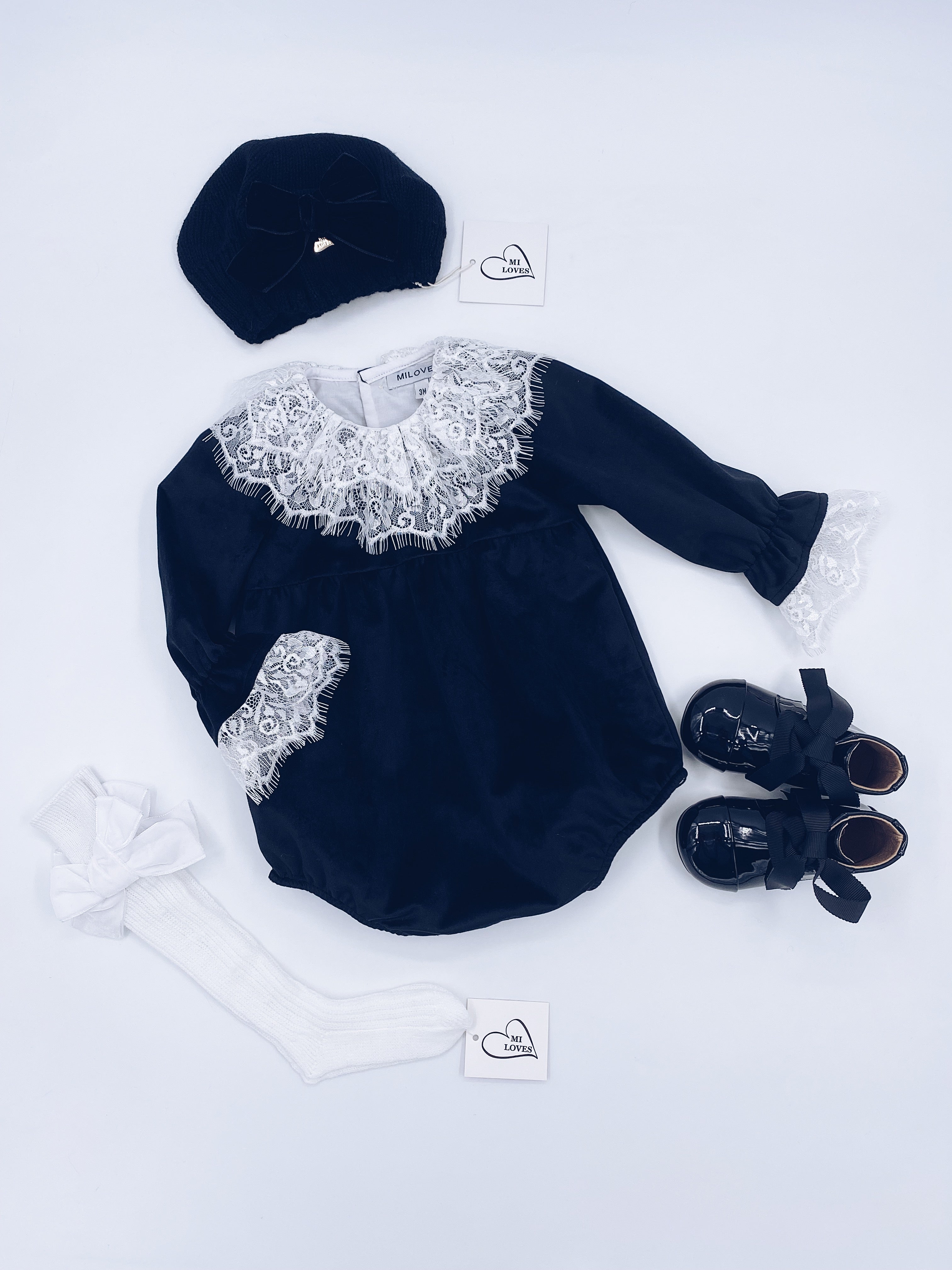 MI LOVES Beautiful Black Velvet romper with White Lace details.