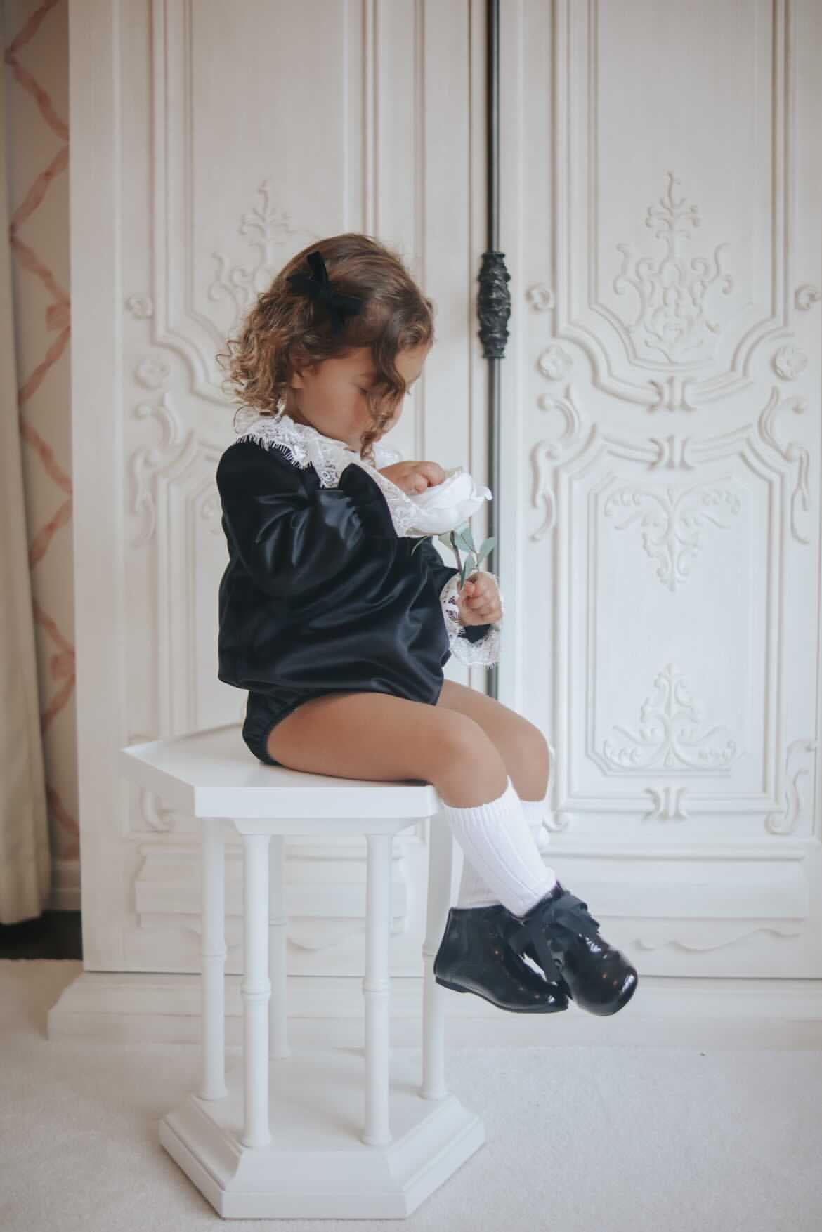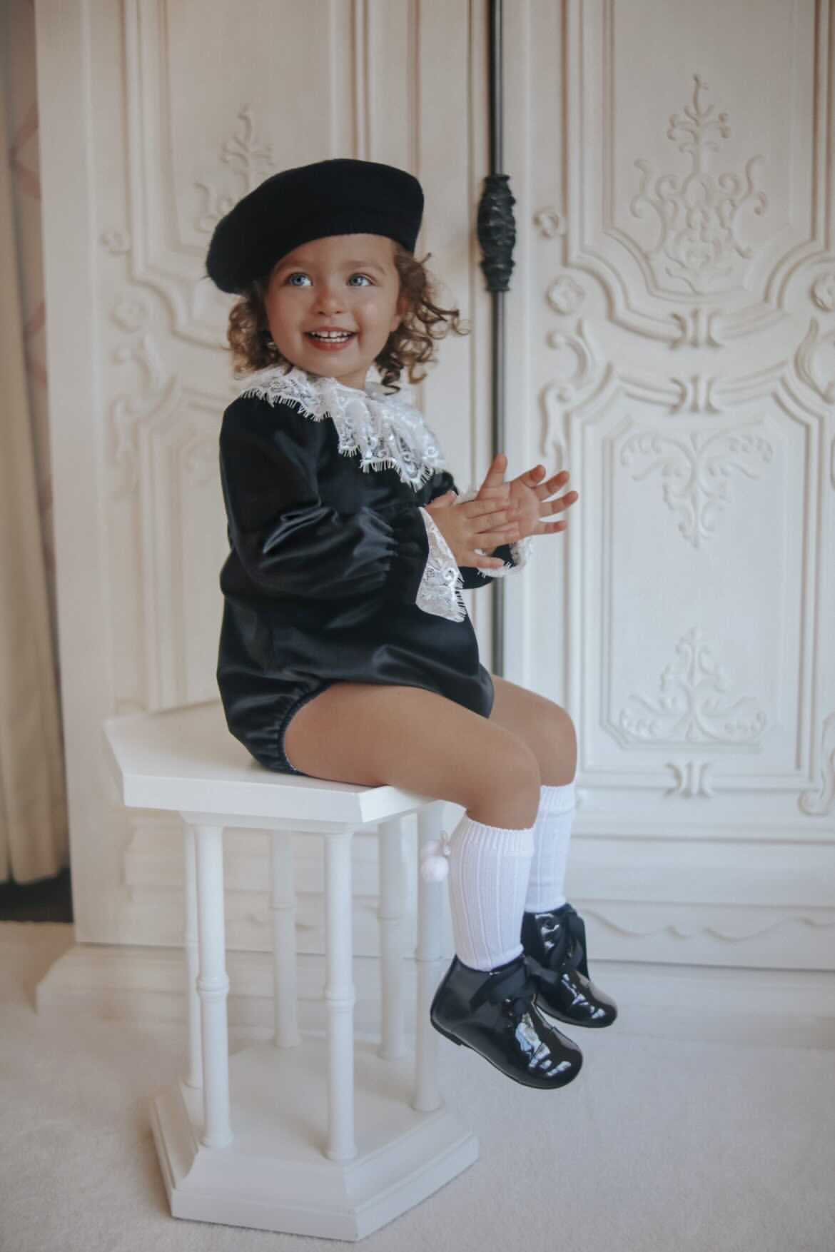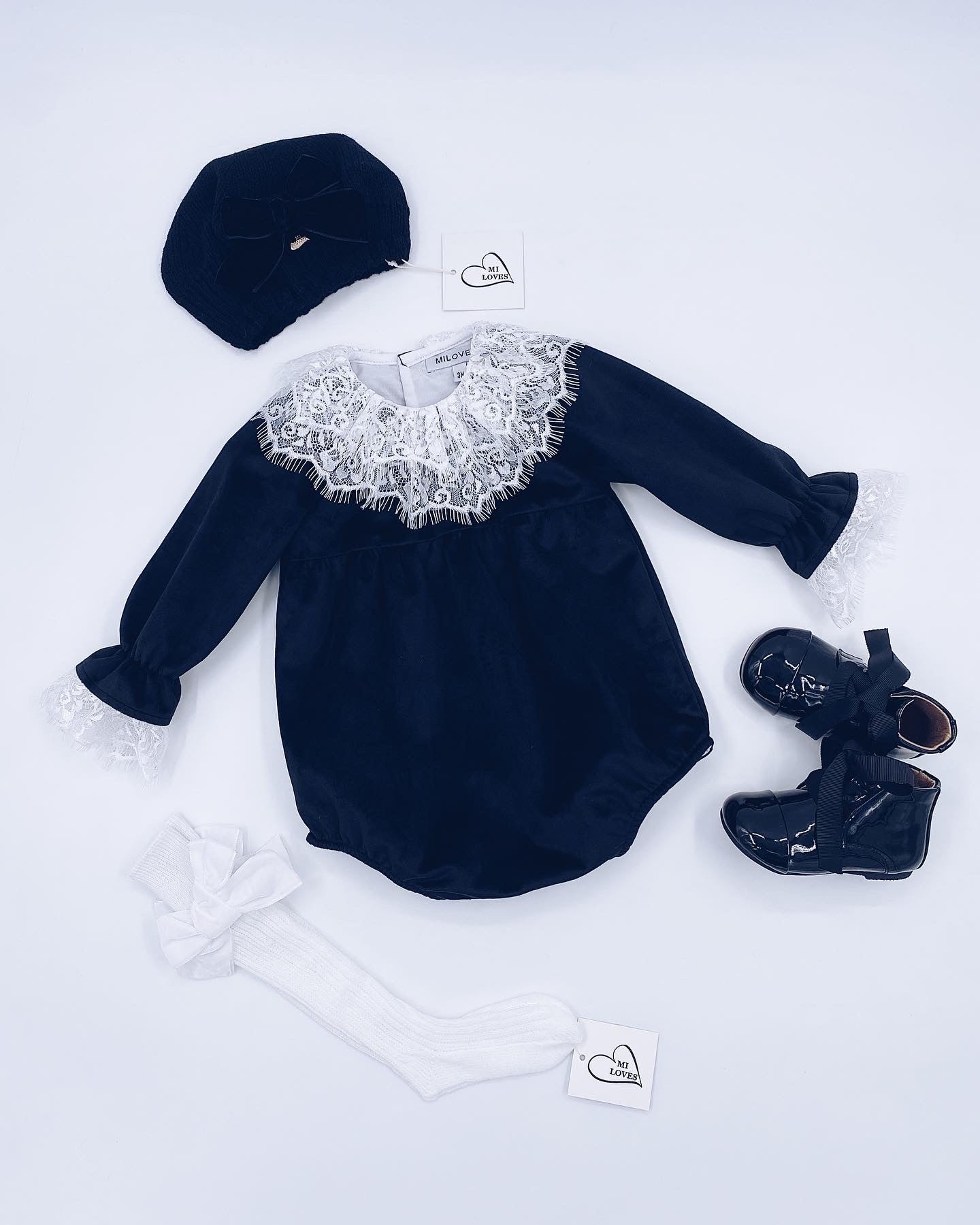 MI LOVES Beautiful Black Velvet romper with White Lace details on the neck and sleeves.