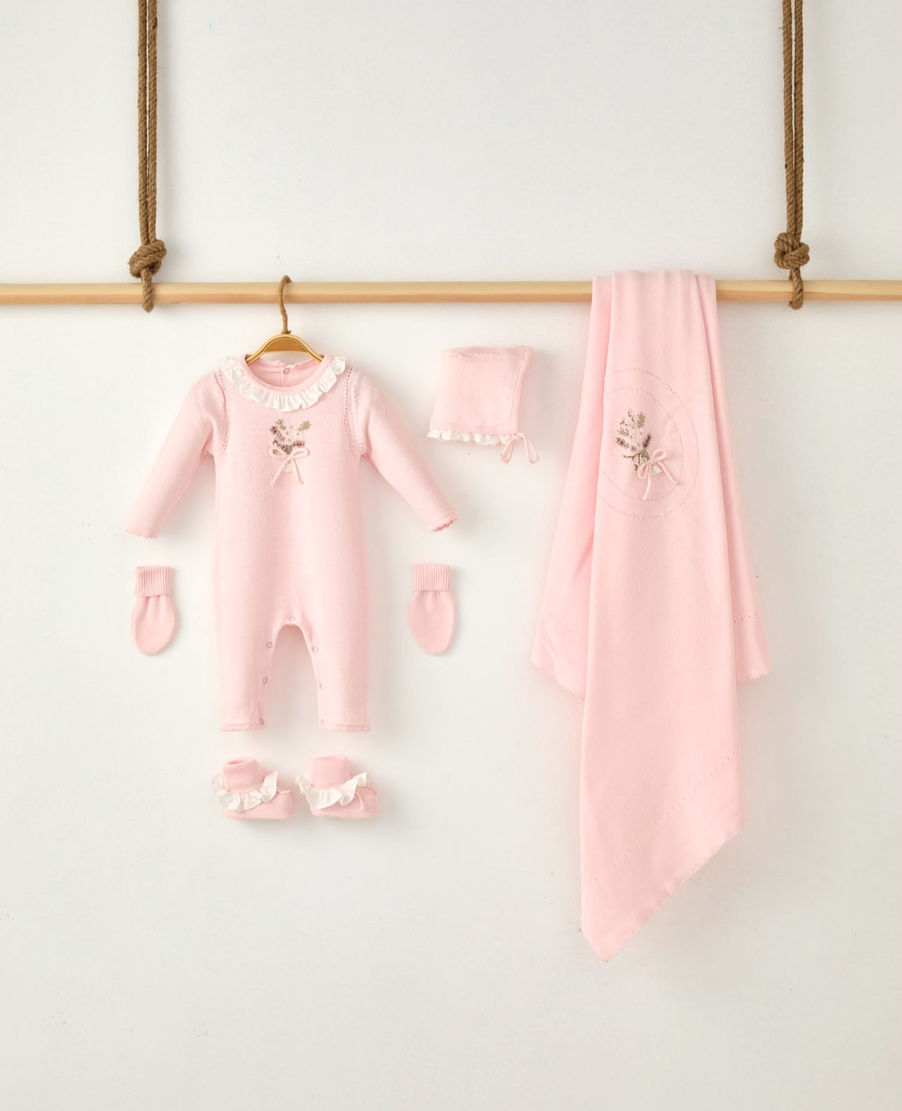 MI LOVES SIGNATURE Beautiful Baby Pink 5 piece Hospital/Coming home set with Hand Embroidery and frill details(including Blanket/Romper/Mittens/Booties/Hat)