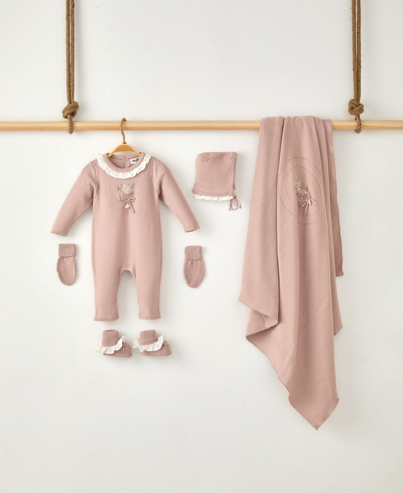 MI LOVES SIGNATURE Beautiful Dusty PInk 5 piece Hospital/Coming home set with Hand Embroidery and frill details(including Blanket/Romper/Mittens/Booties/Hat)