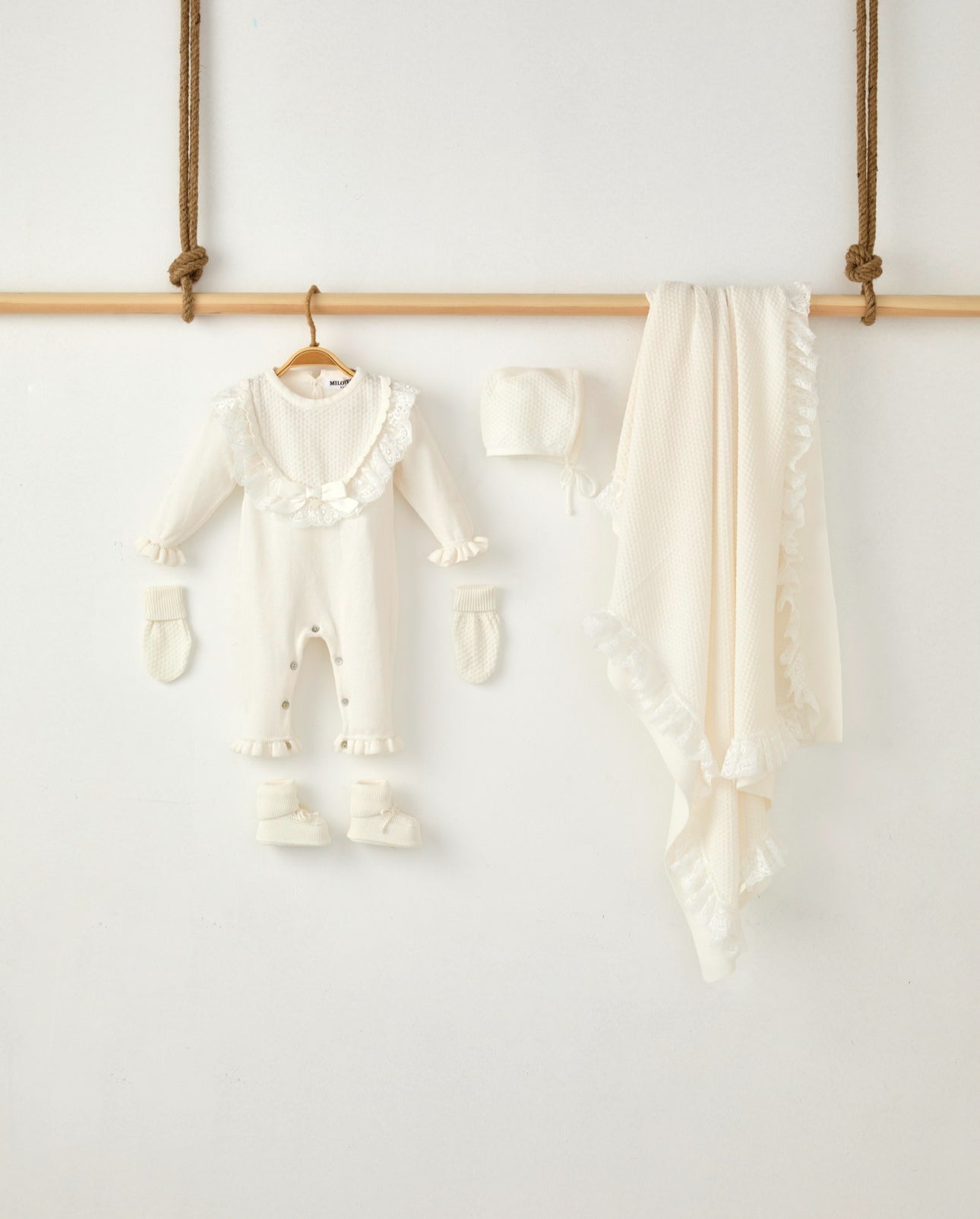 MI LOVES SIGNATURE Beautiful Ivory 5 piece Hospital/Coming home set with Lace frill details(including Blanket/Romper/Mittens/Booties/Hat)