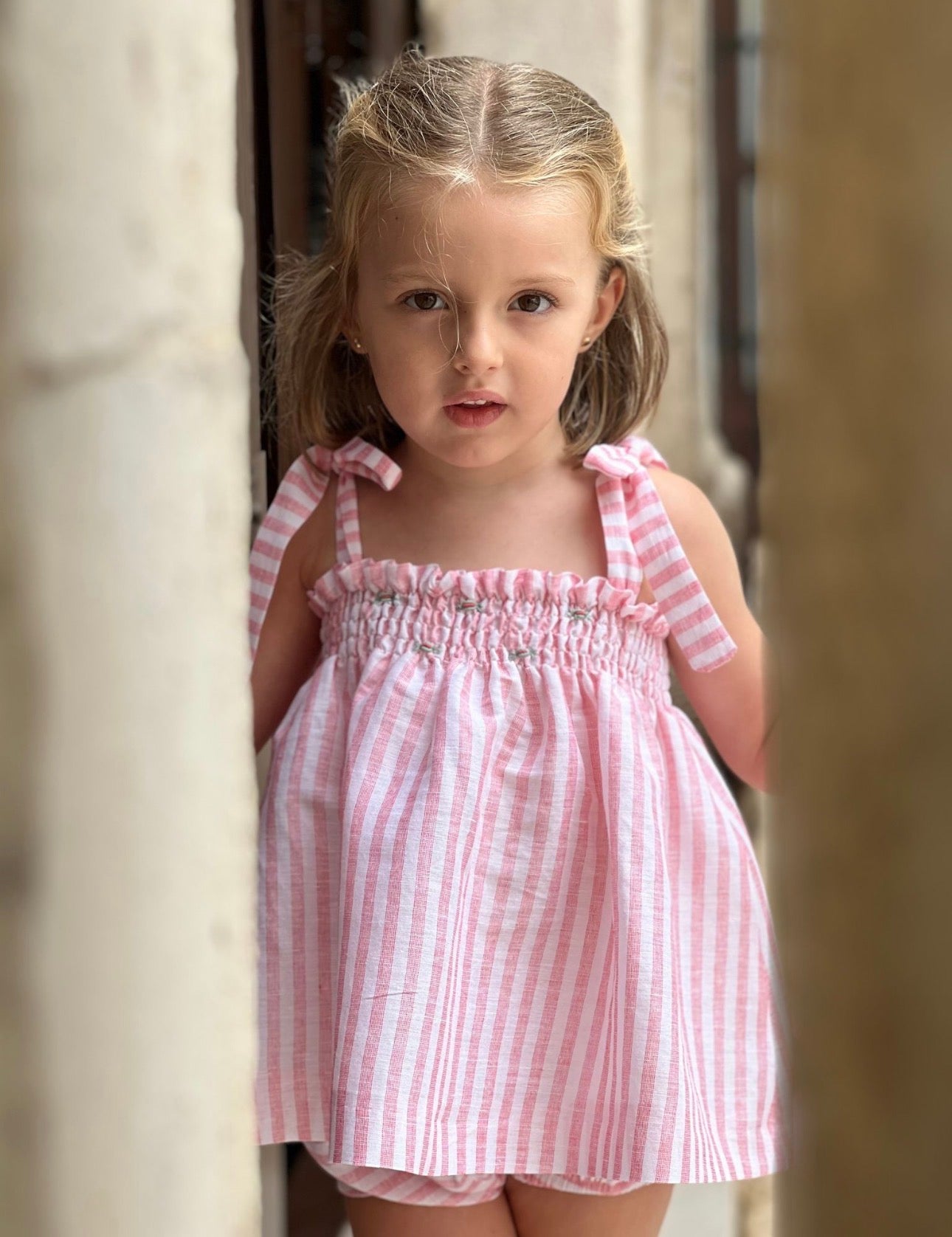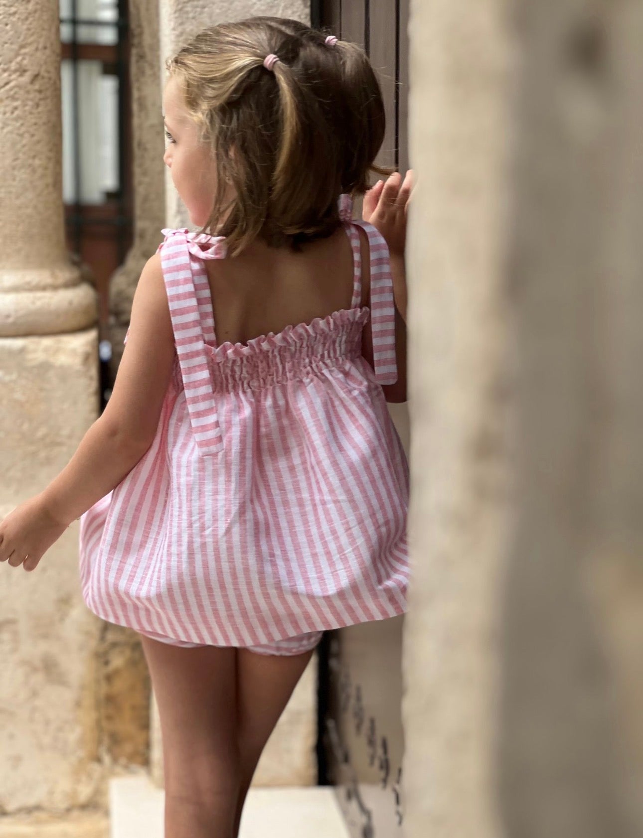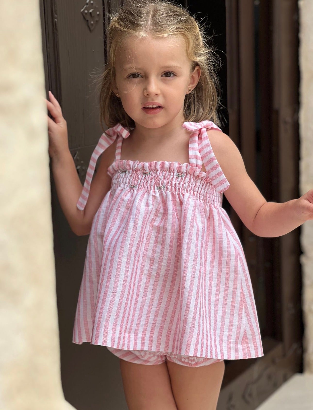 PRE ORDER(delivery at the end of February)MI LOVES SIGNATURE Stripe print Top/bloomers set with Beautiful Hand Smoked details.