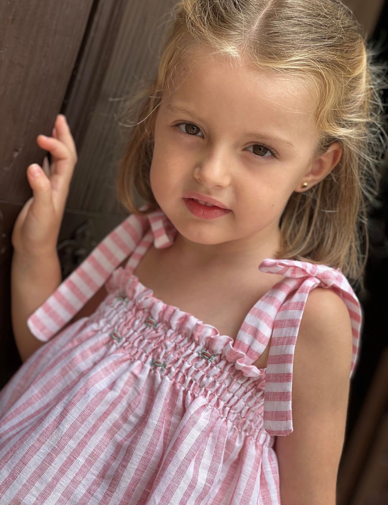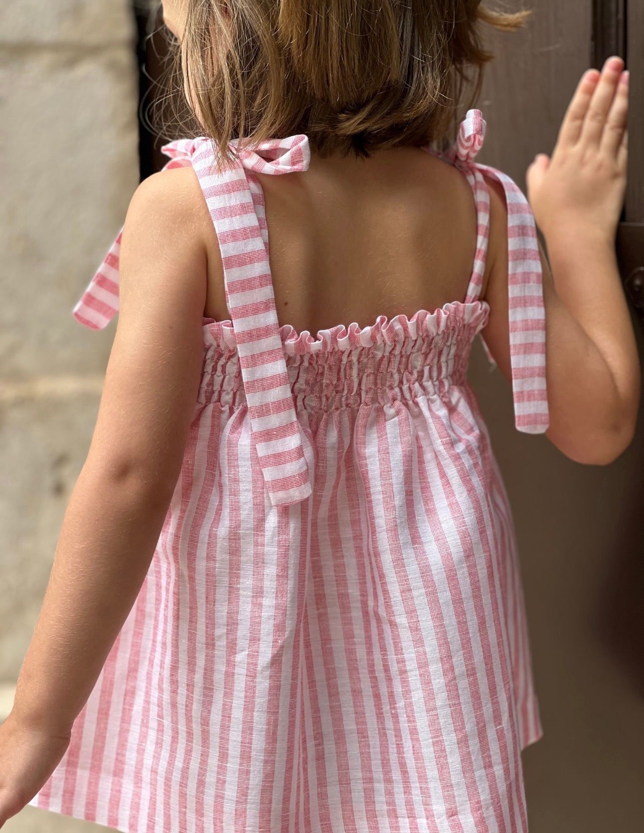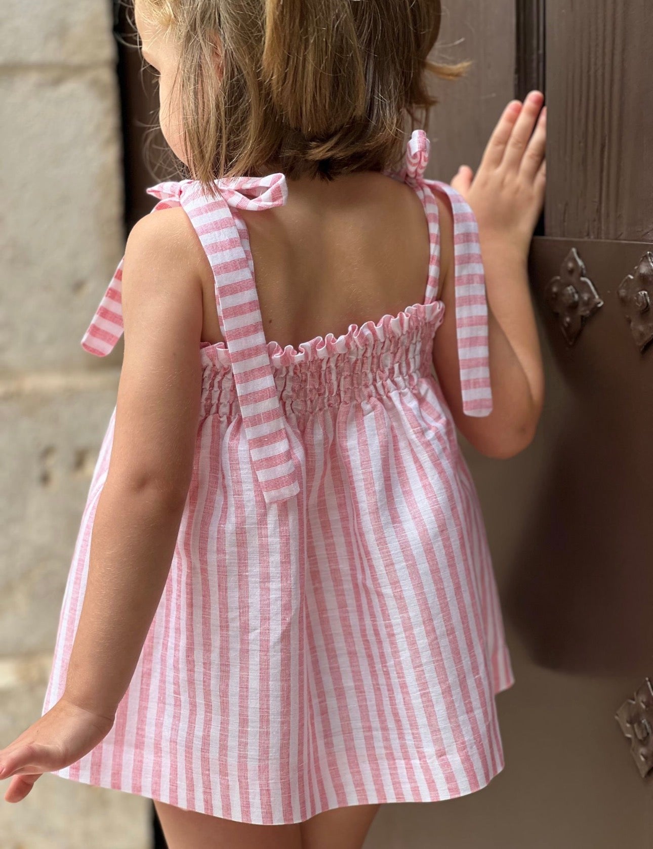 PRE ORDER(delivery at the end of February)MI LOVES SIGNATURE Stripe print Top/bloomers set with Beautiful Hand Smoked details.