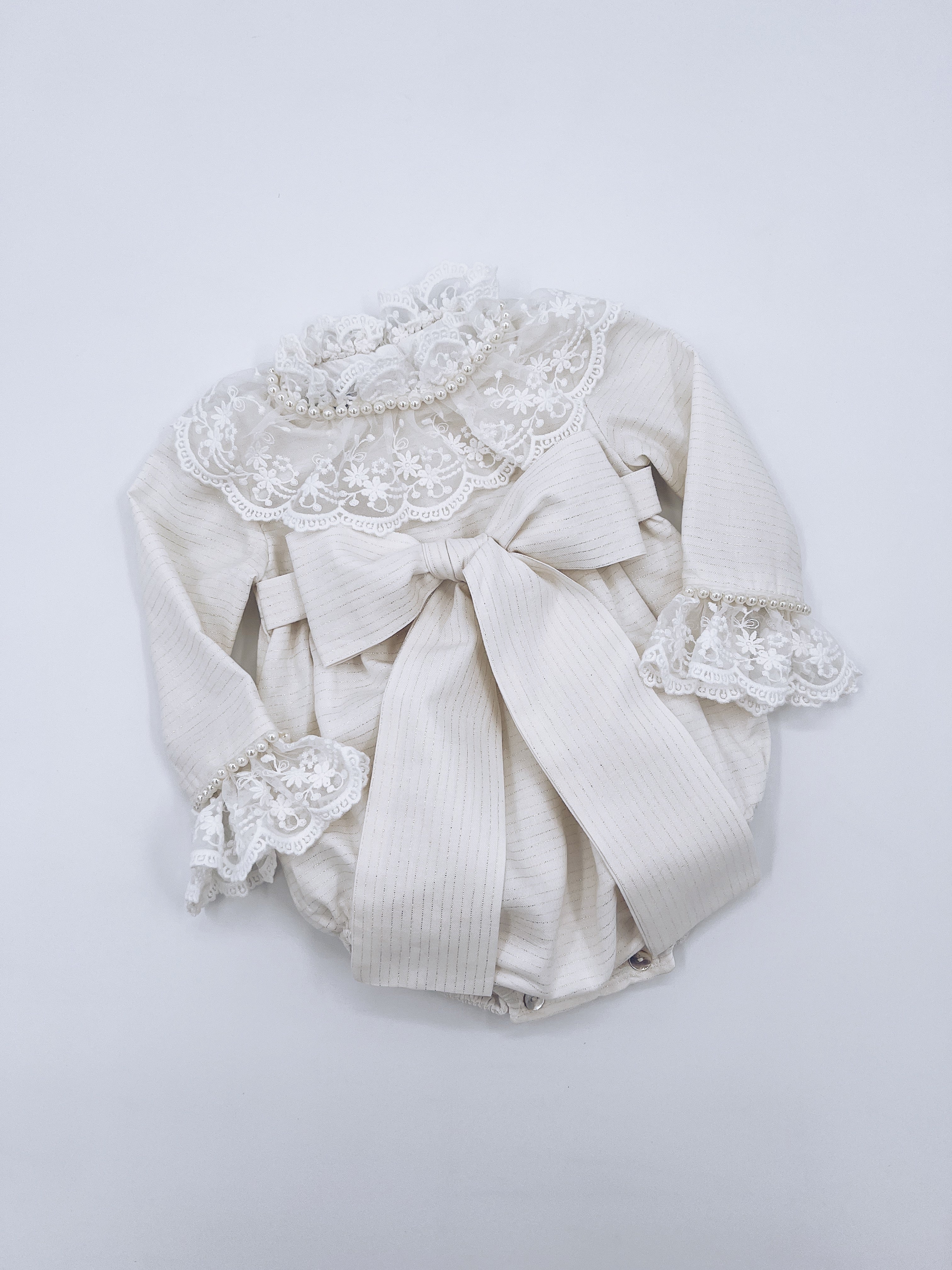 Beautiful Romper with Lovely Bow ,Faux Pearls and Lace details.