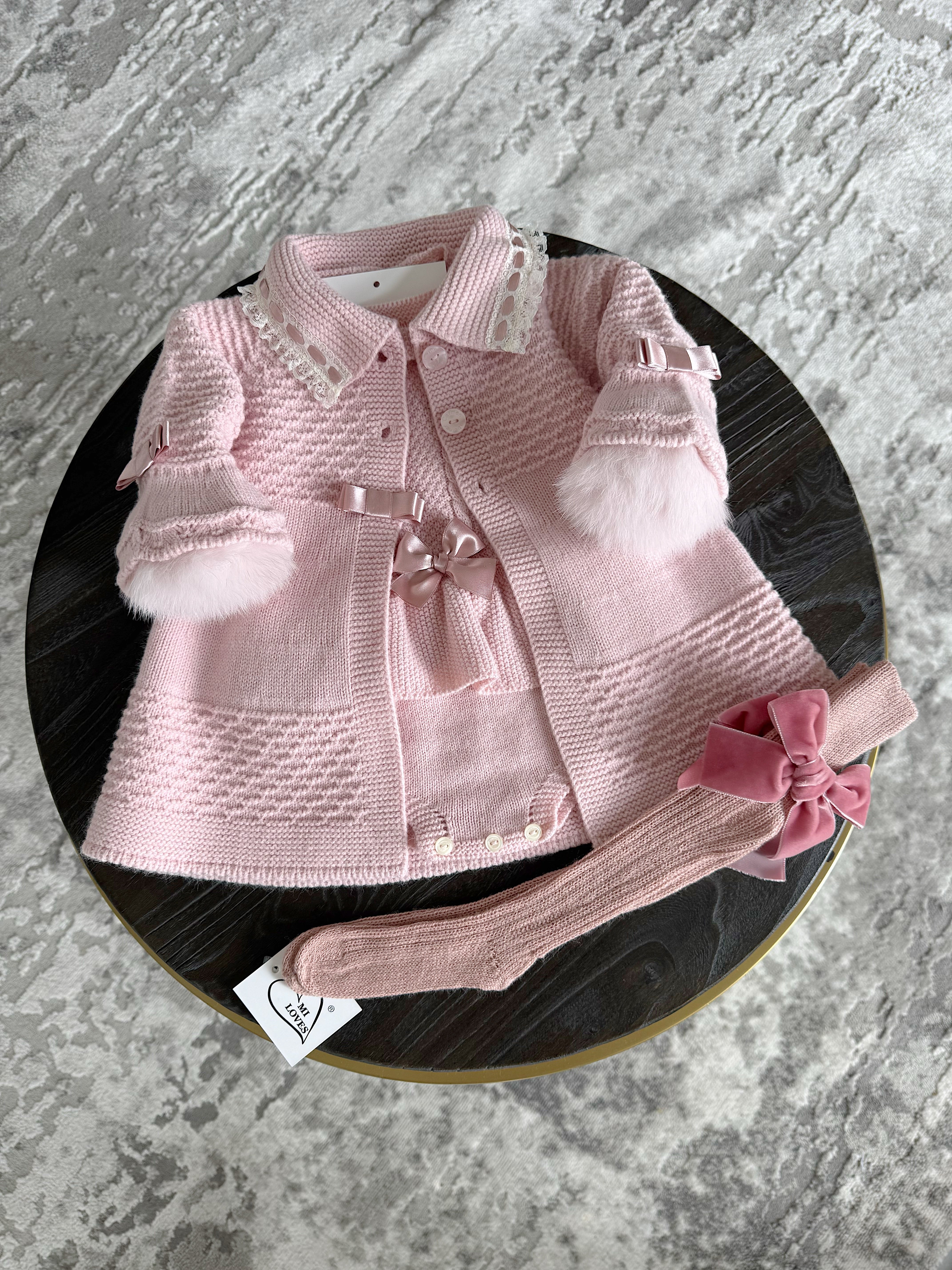 Baby pink Knitted Romper with fox fur trim on the sleeves.