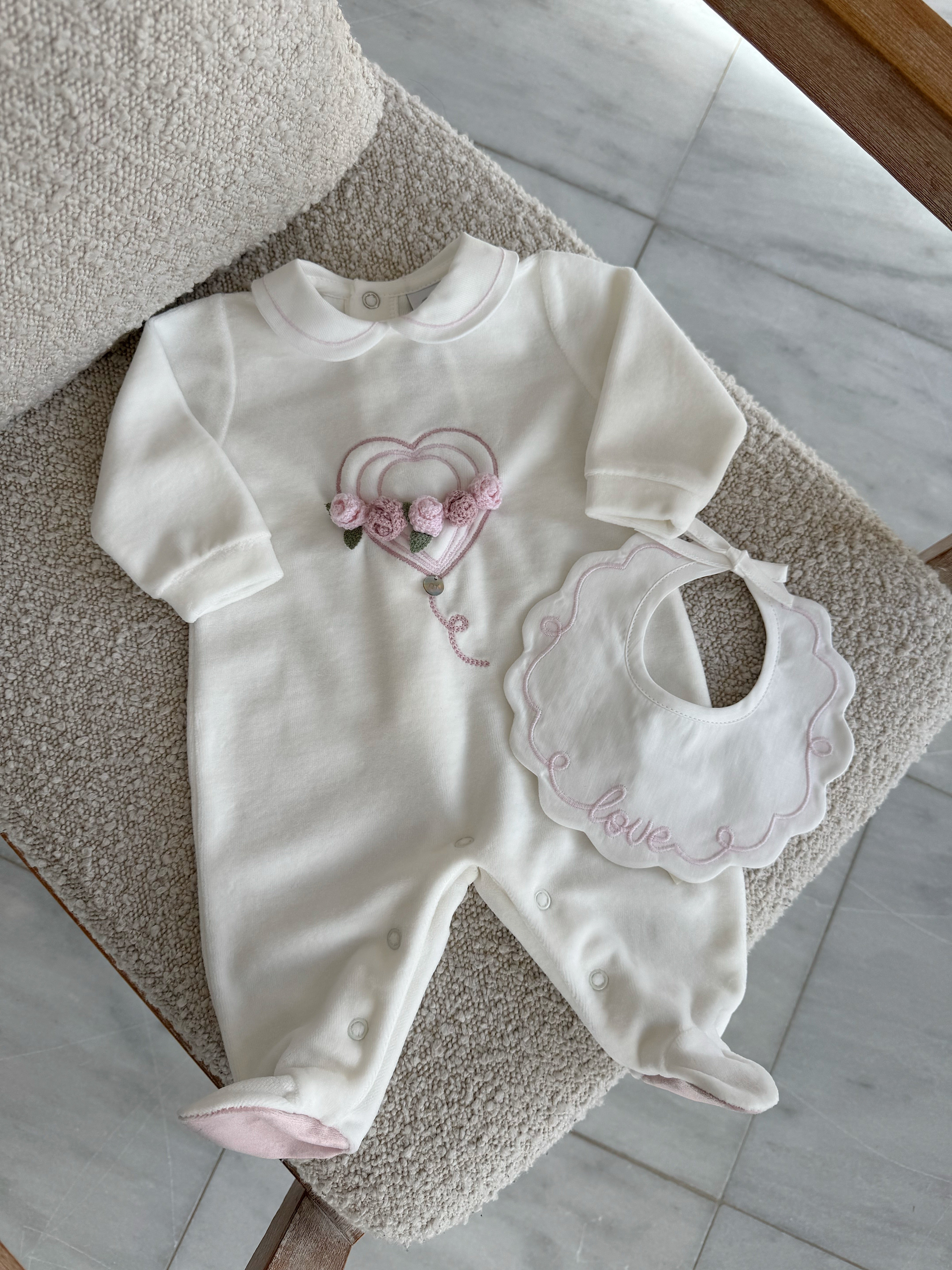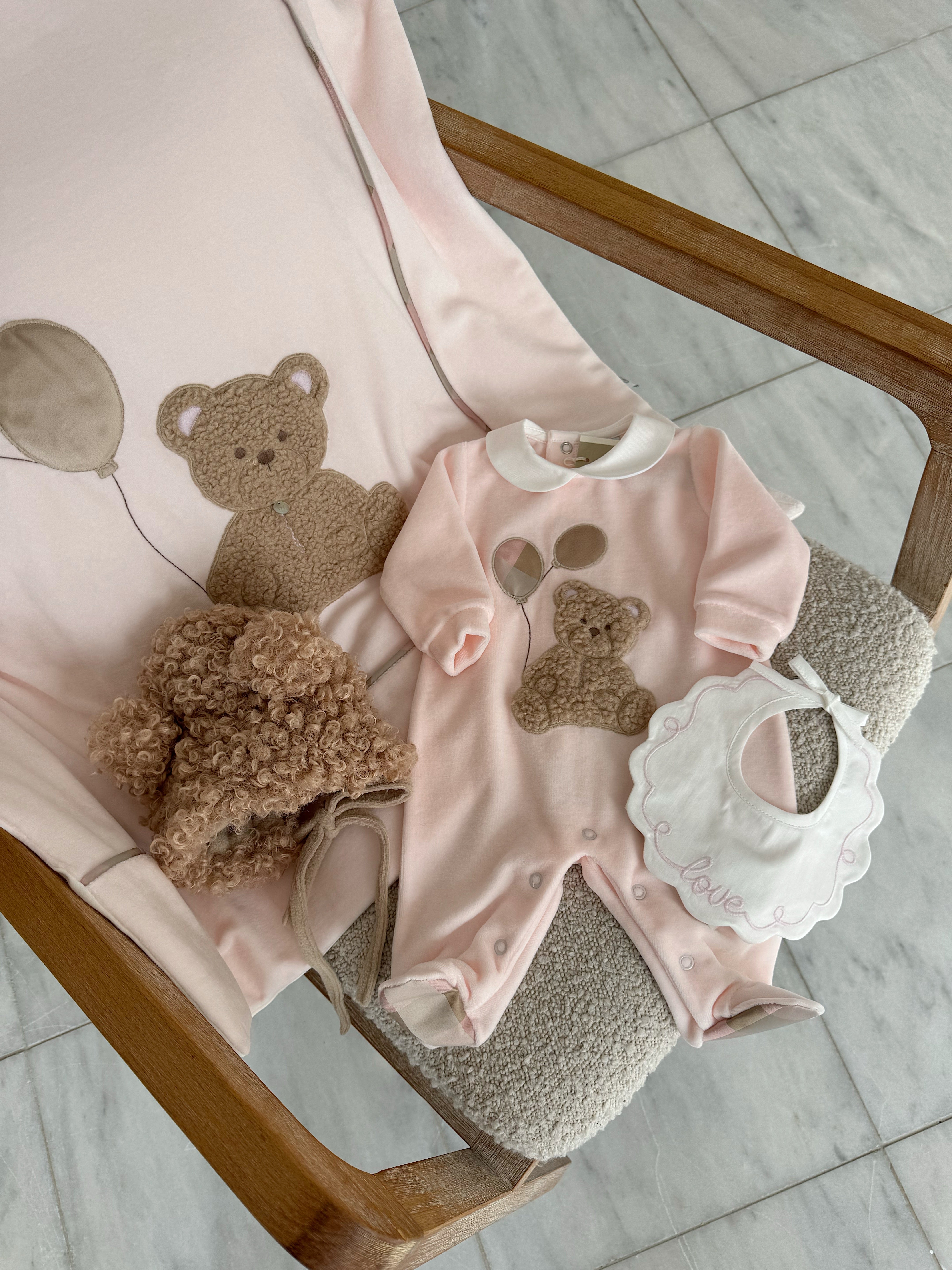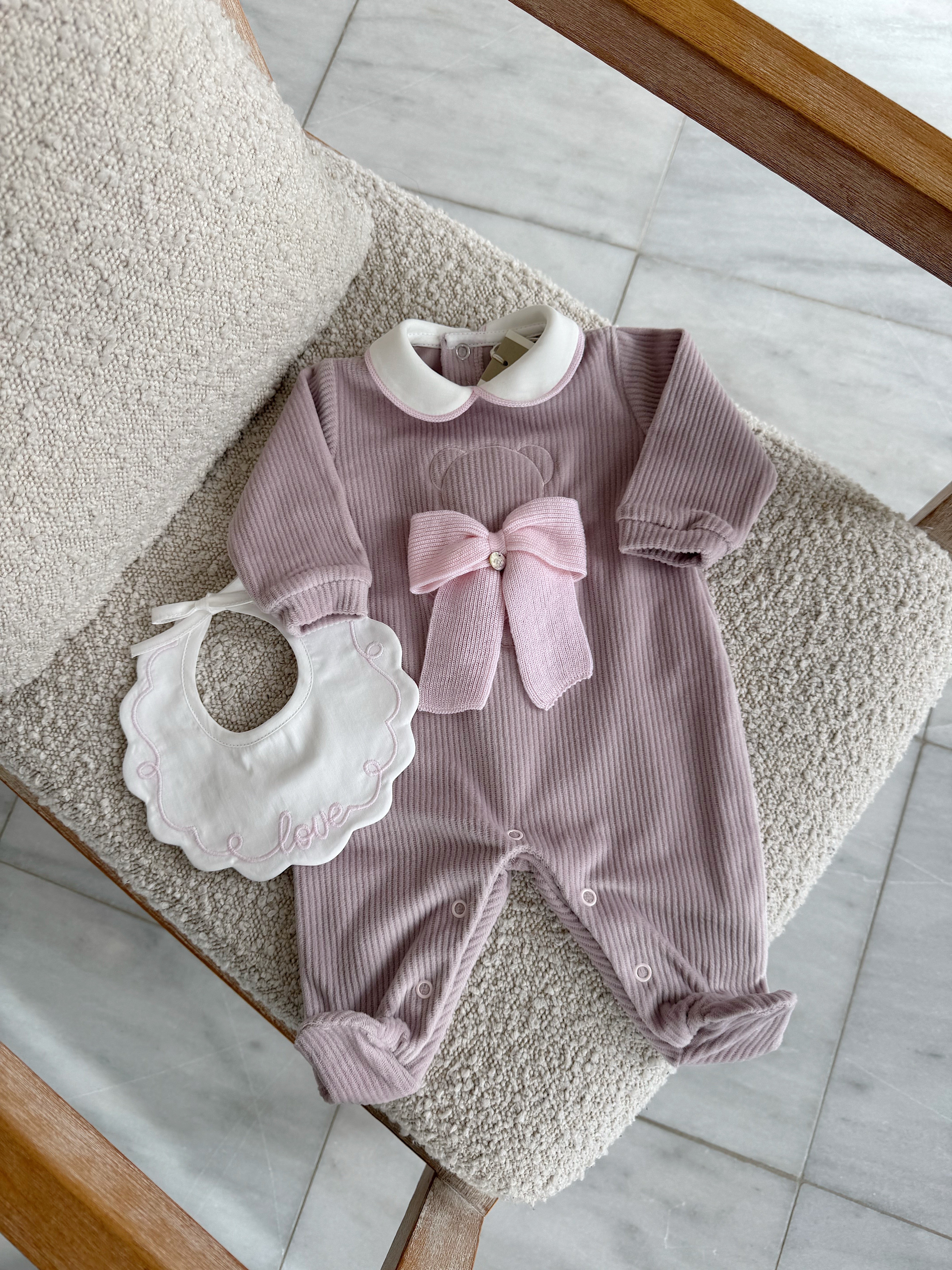 Beautiful Pink Velure Baby grow with Bear and Bow details.