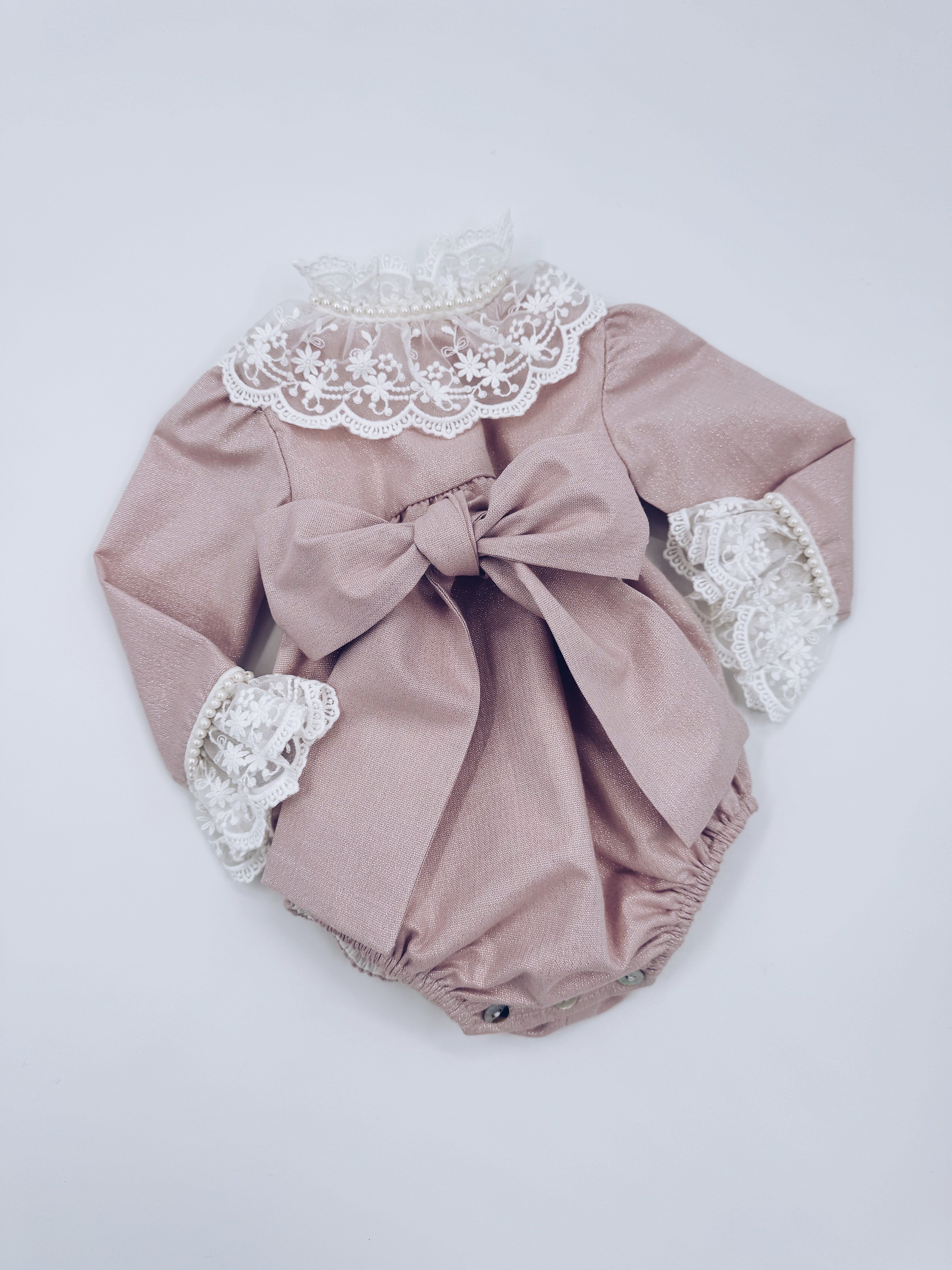 Beautiful Dusty pink Romper with Lovely Bow ,Faux Pearls and Lace details.