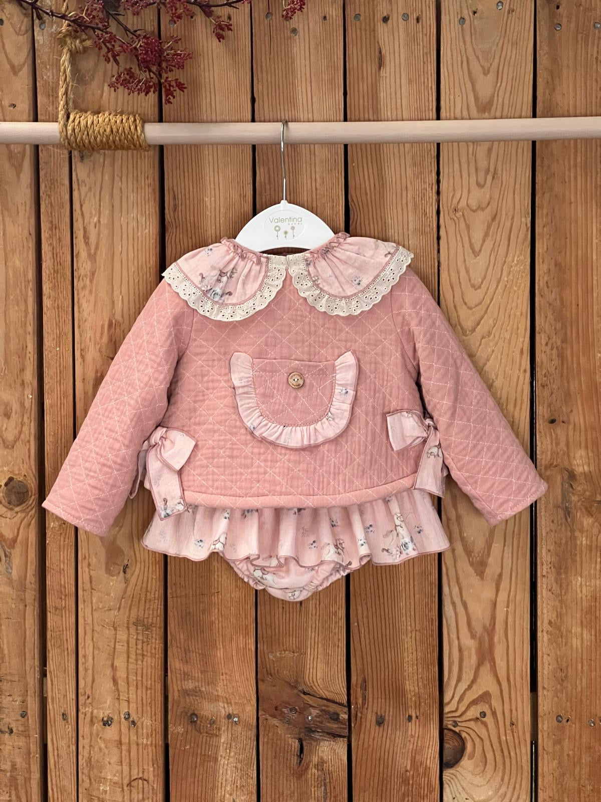Pink knitted romper and matching blanket hospital set.