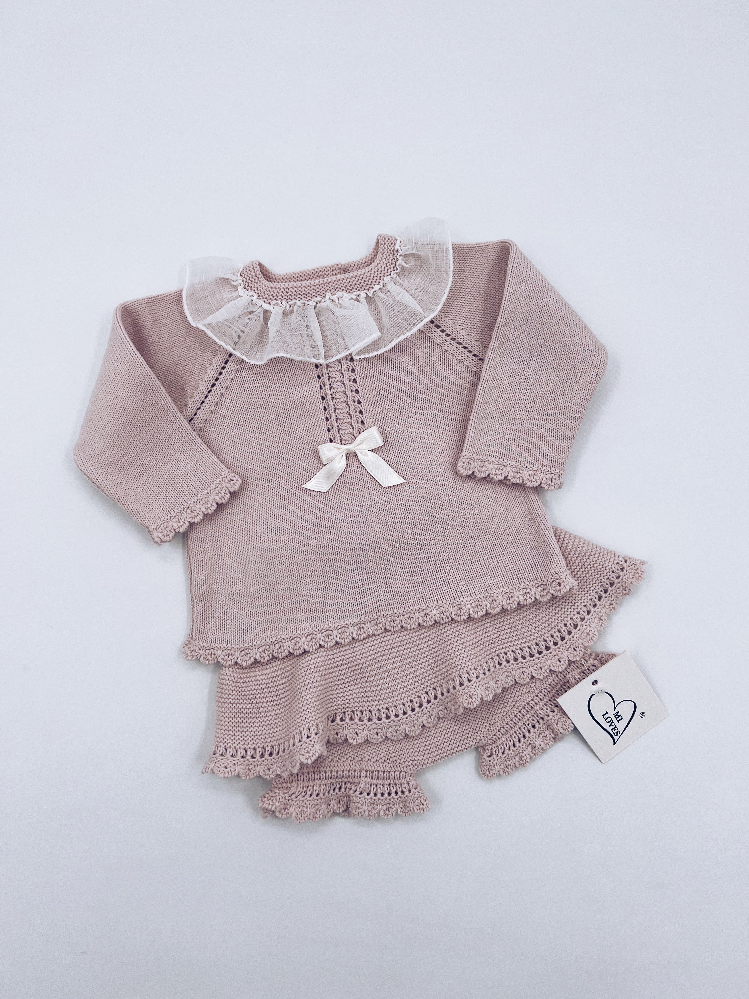 MI LOVES Ivory knitted 2 piece MIA set with Beautiful Dusty Pink Bow and Lace details.