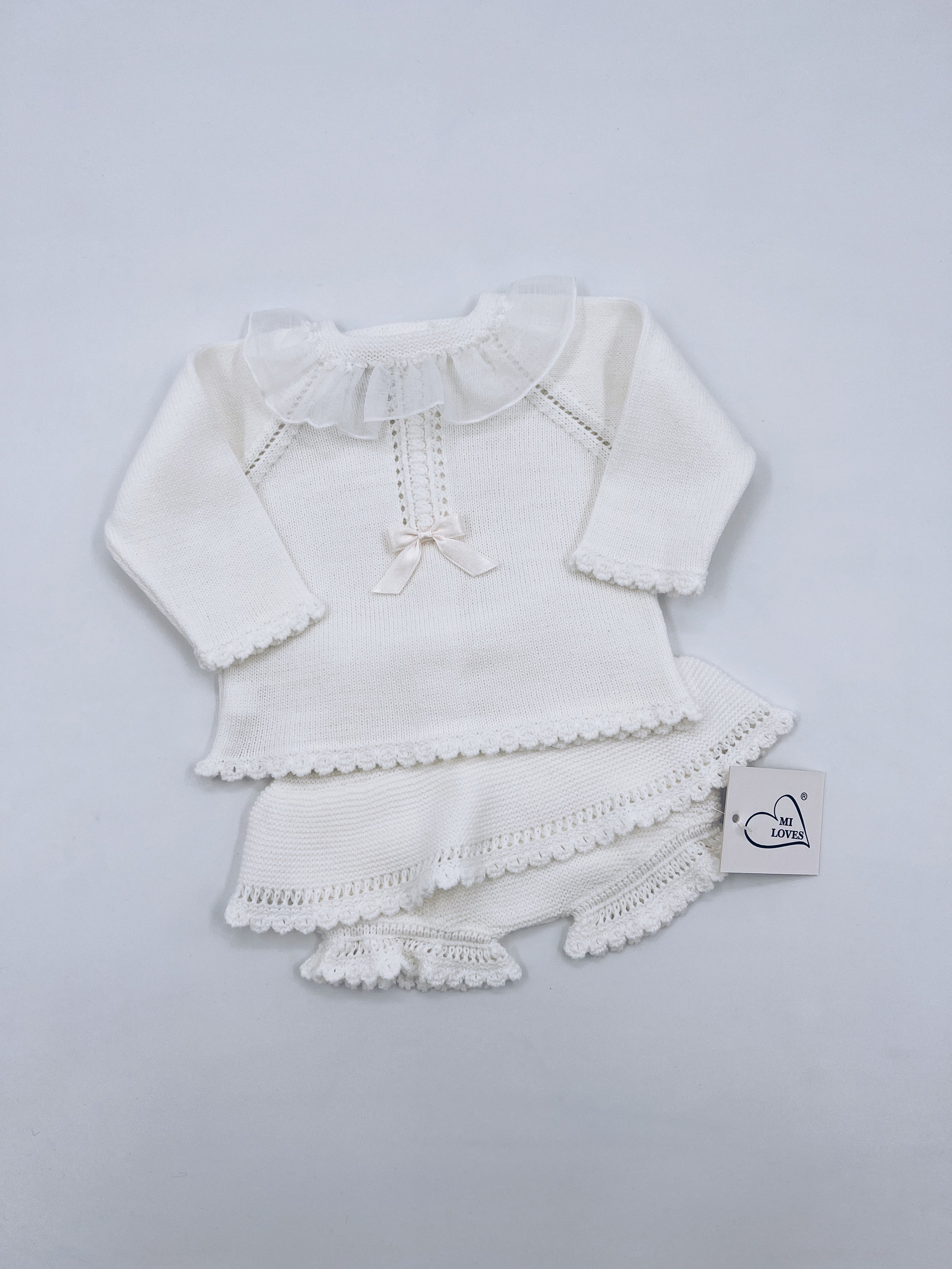 MI LOVES Ivory knitted 2 piece set(top/bottoms)with Beautiful Ivory Bow and Lace details.
