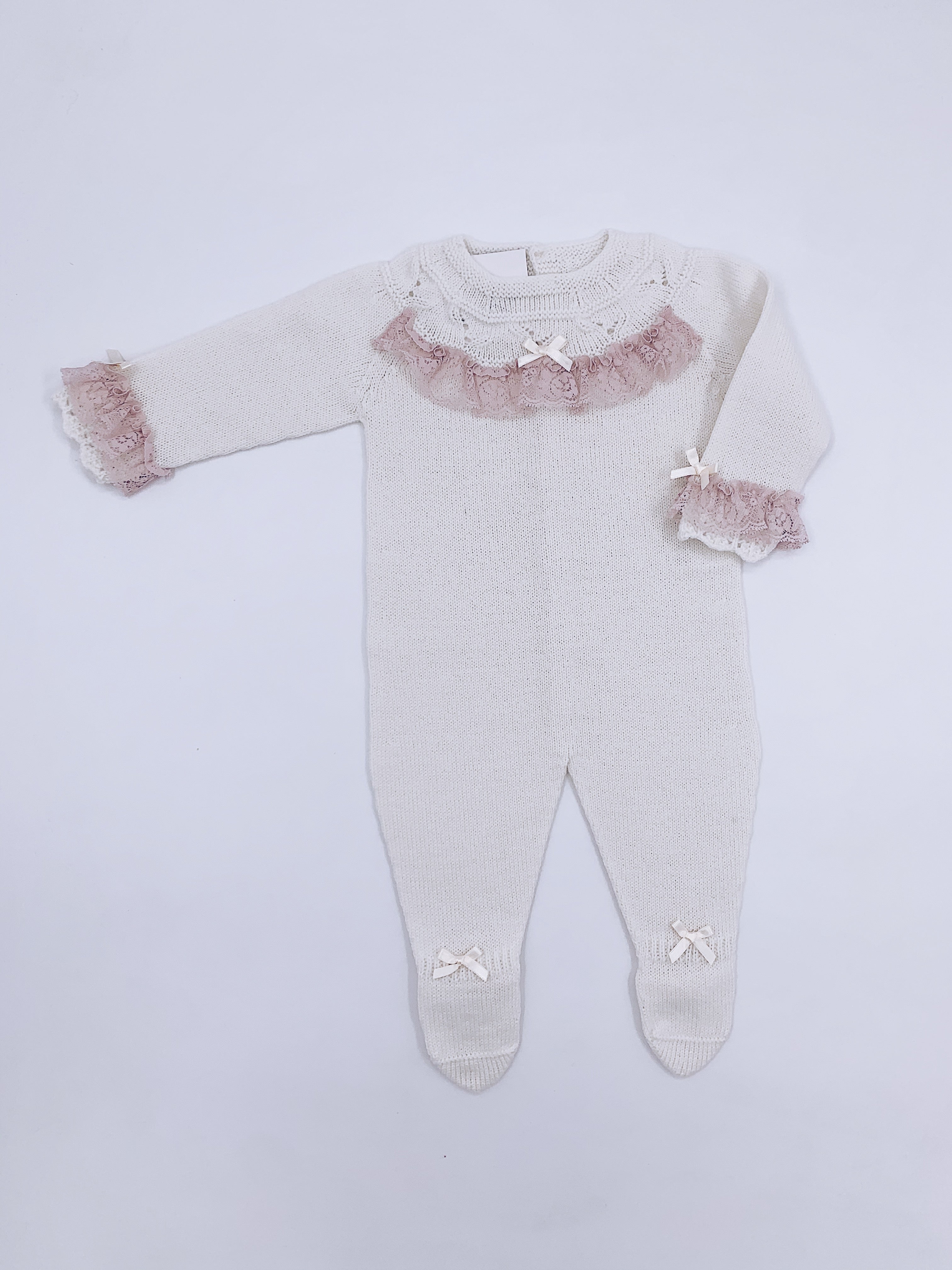 Beautiful Ivory knitted babygrow with Dusty pink lace details