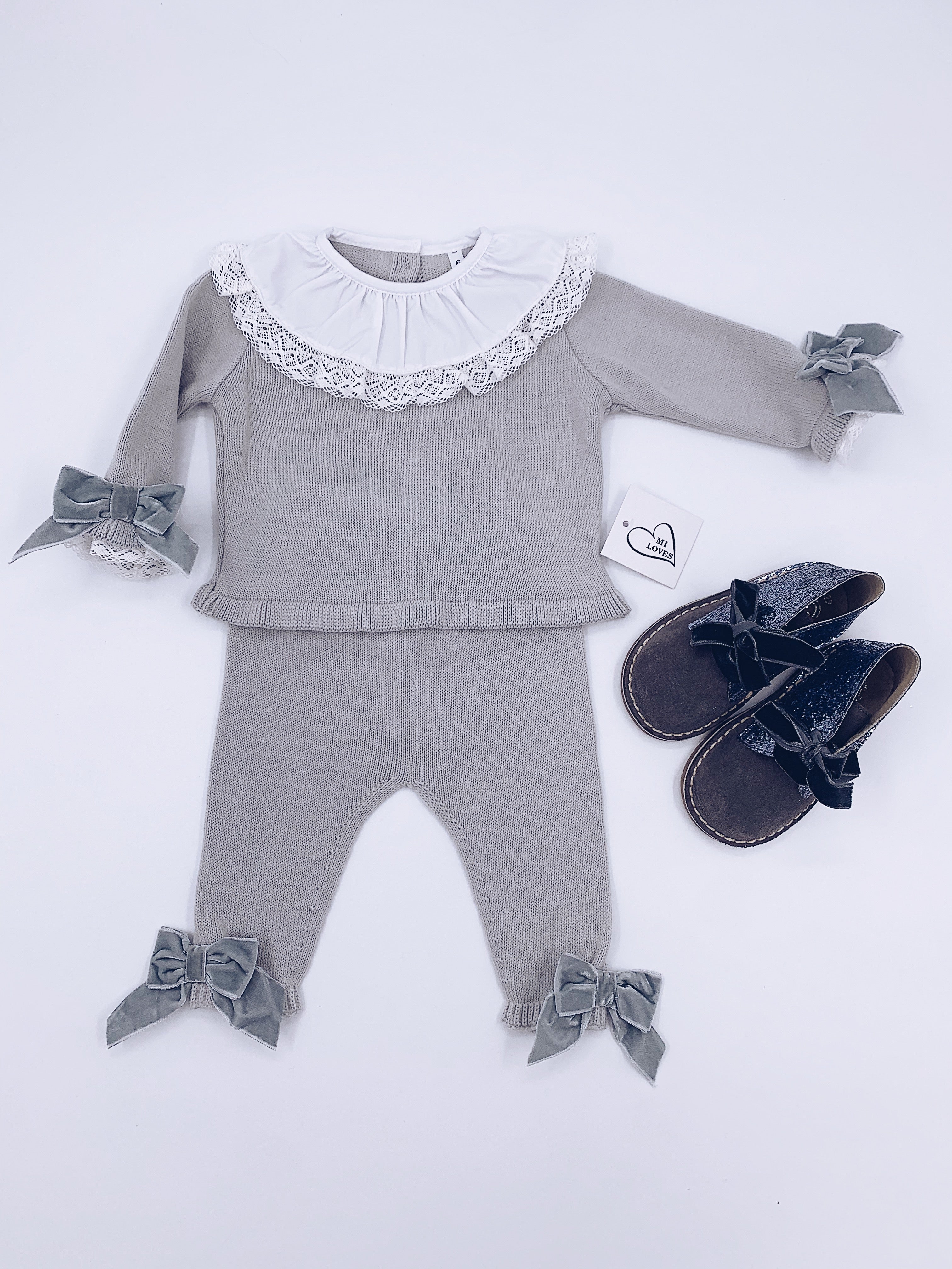 Rahigo Knitted 2 piece set with lace/bow details in Grey