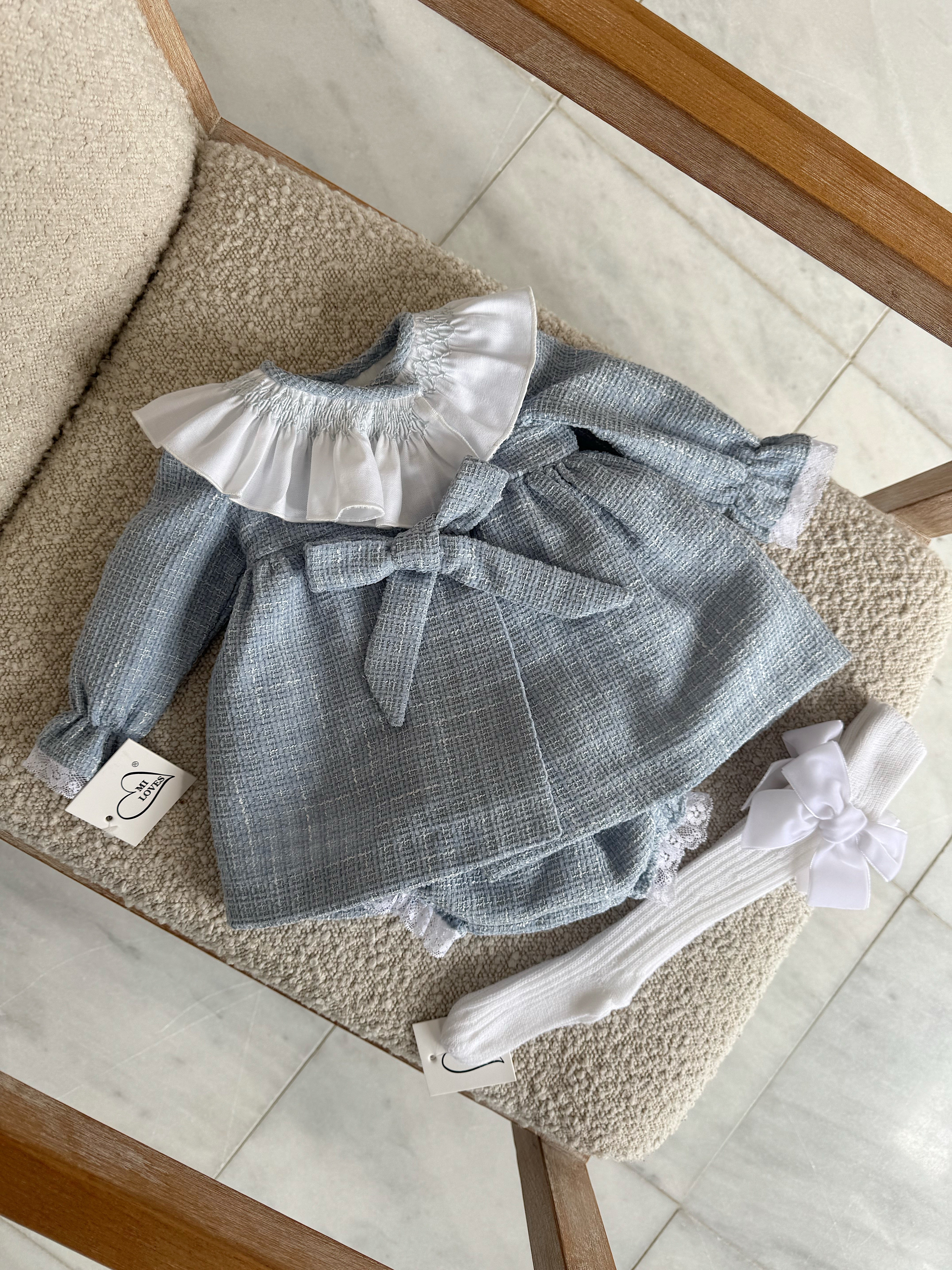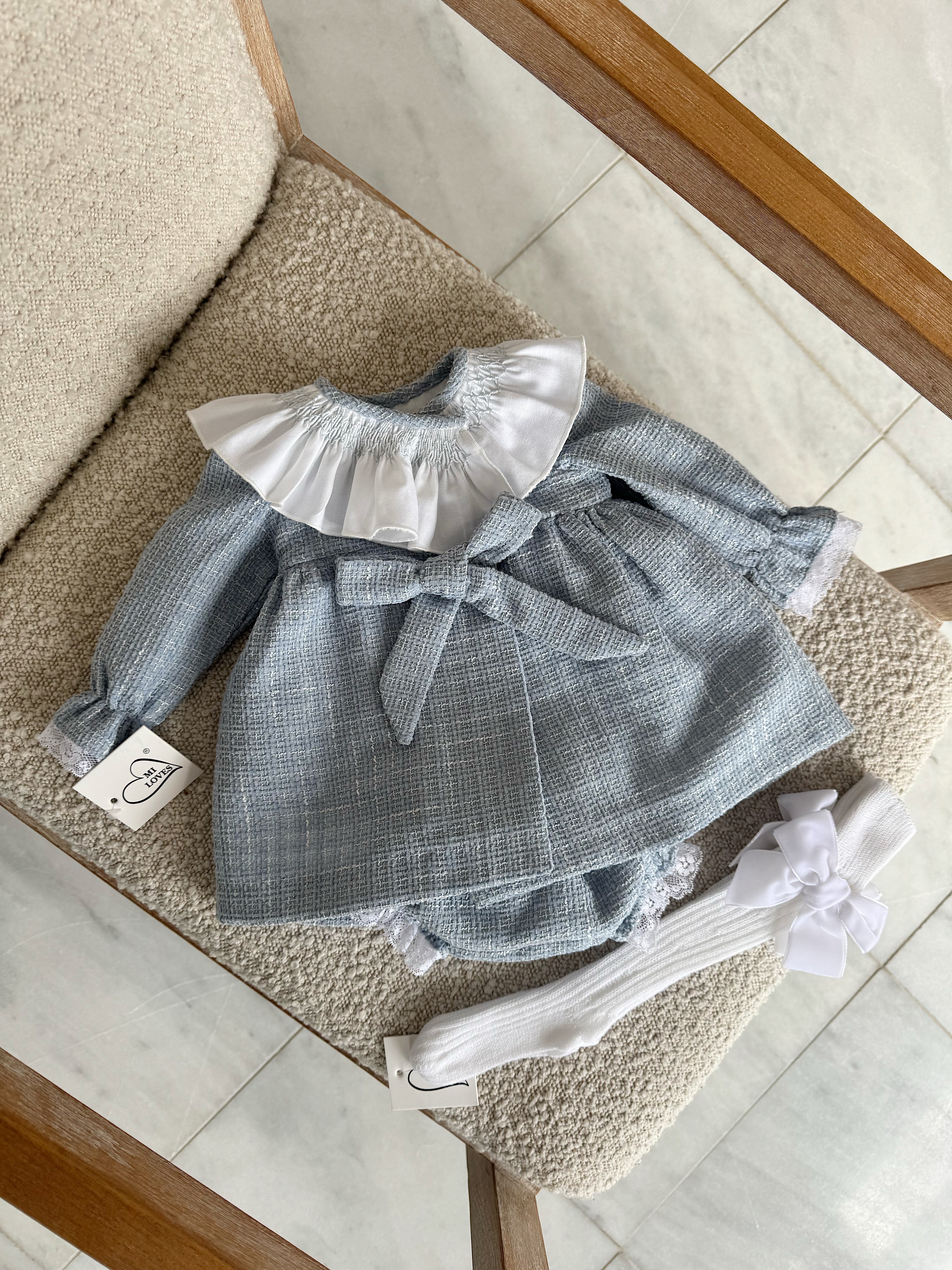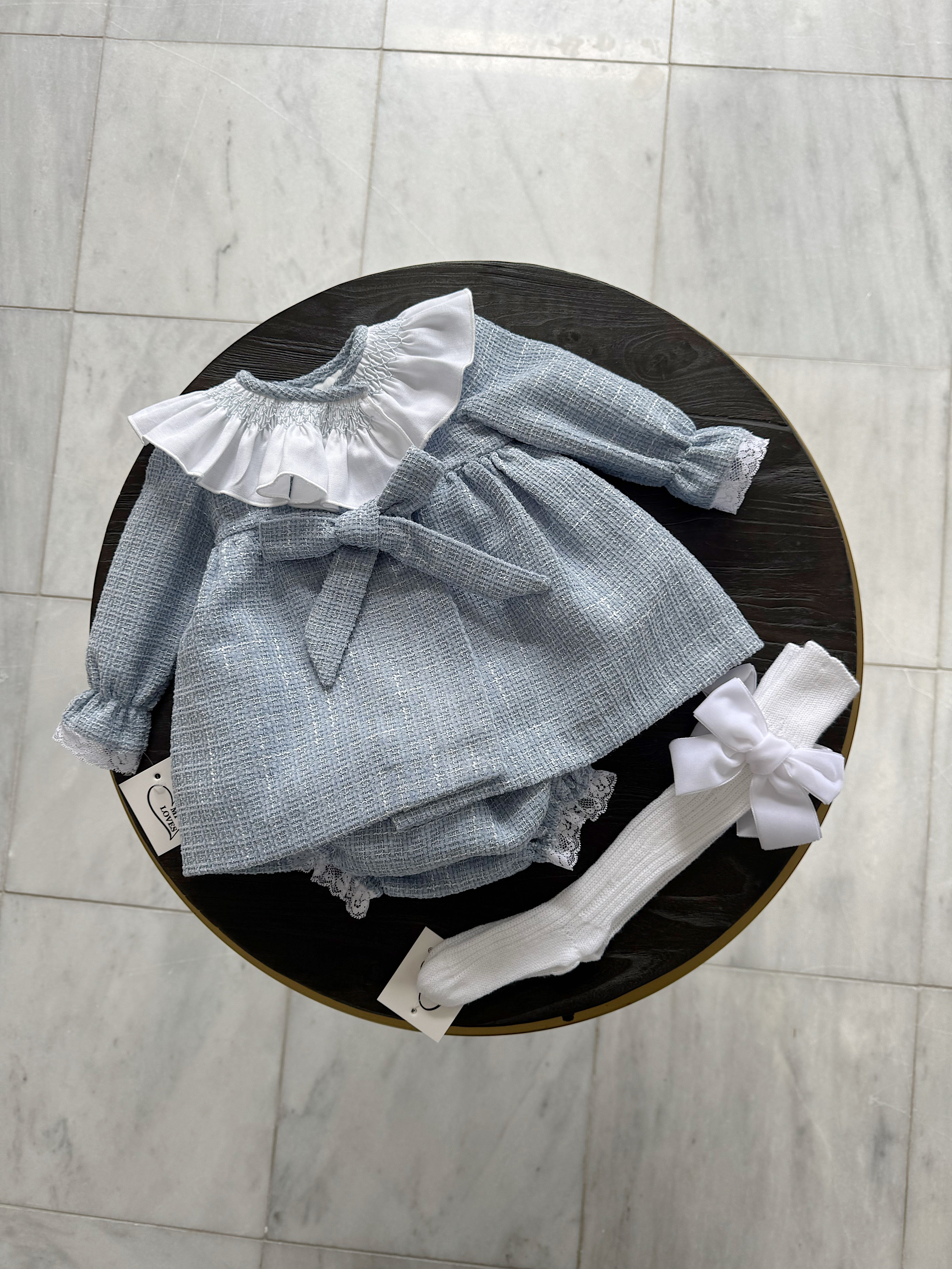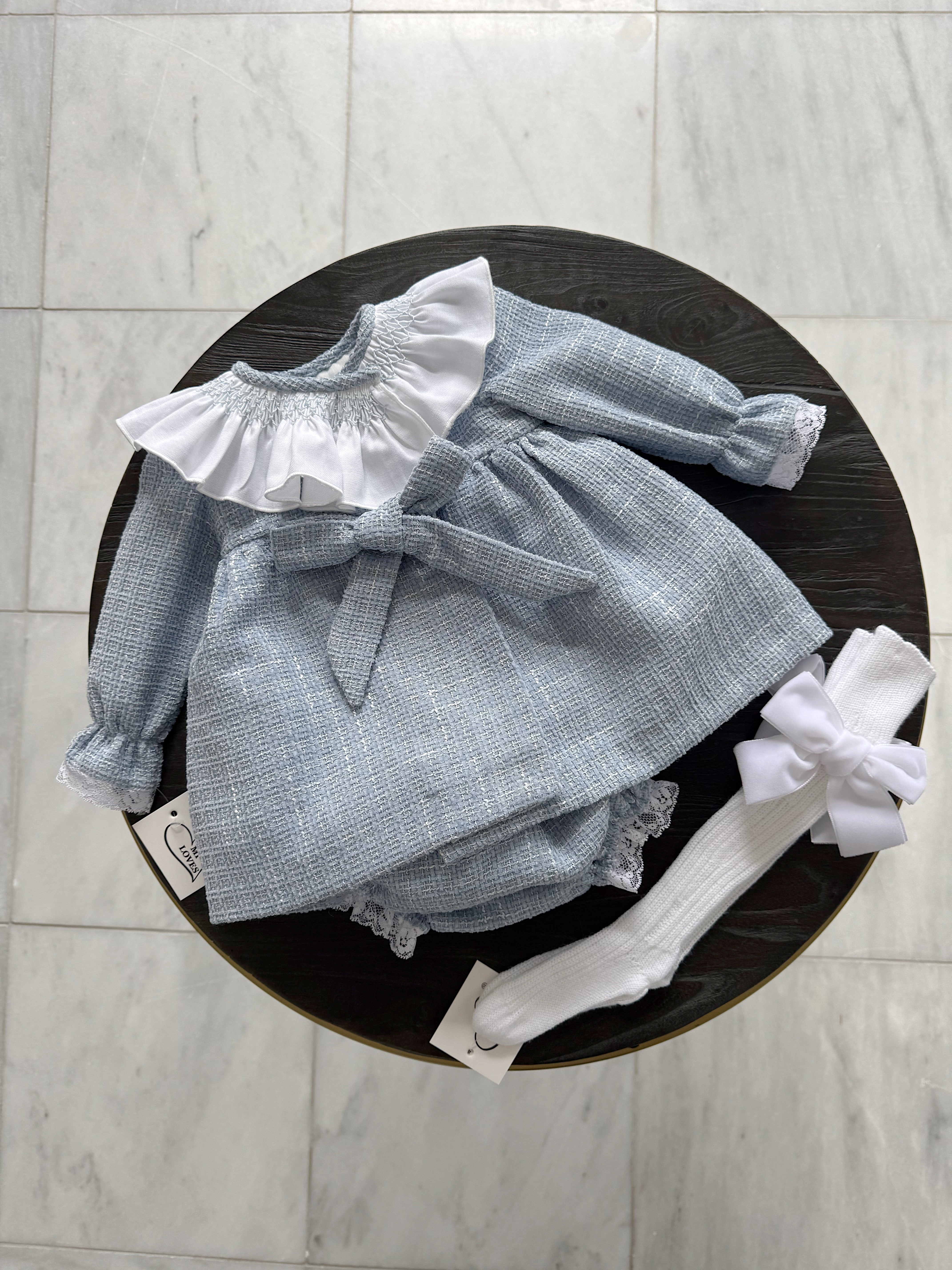 Beautiful Baby blue Tweed Dress and bloomers set with Hand Smoked details