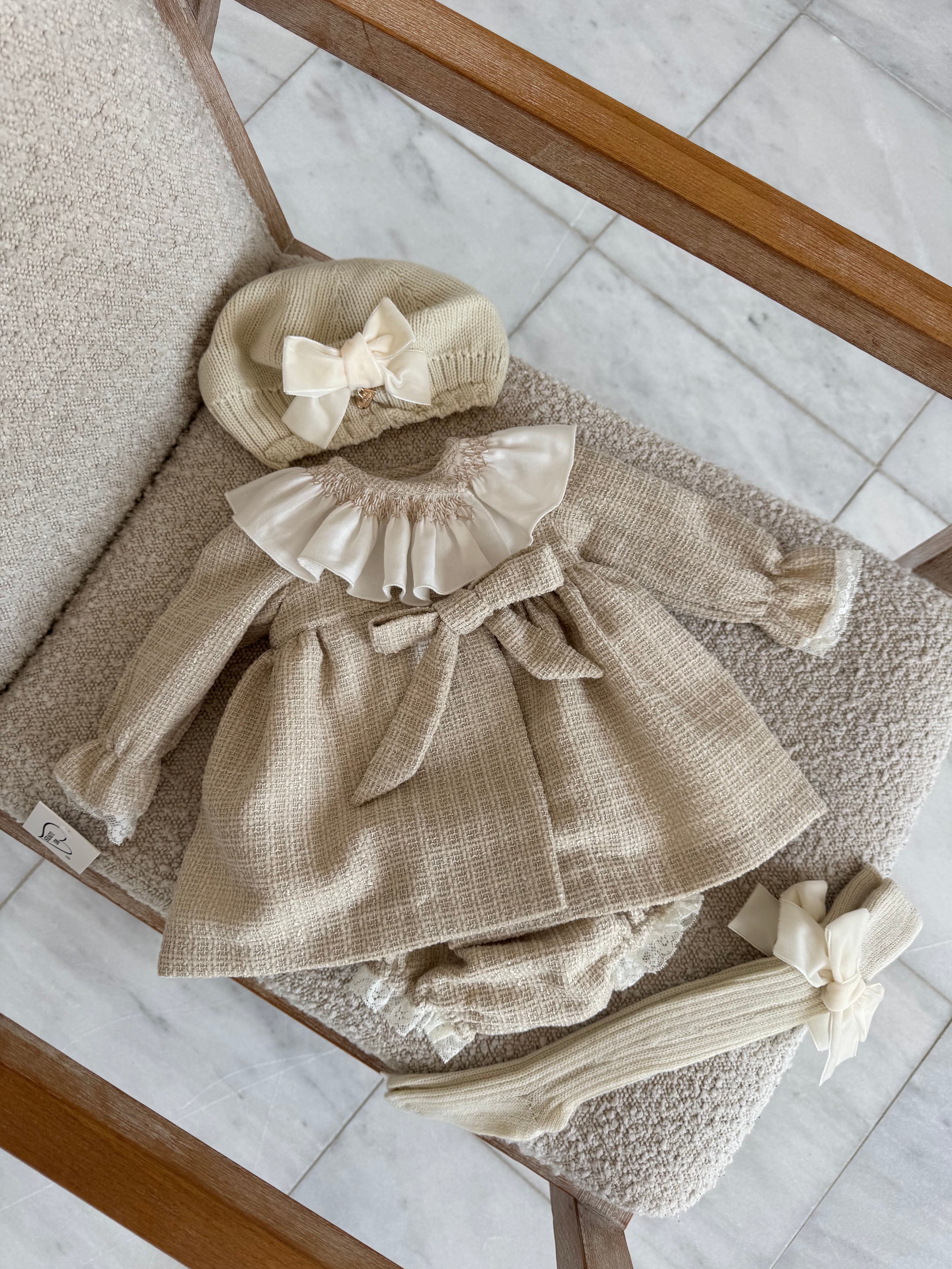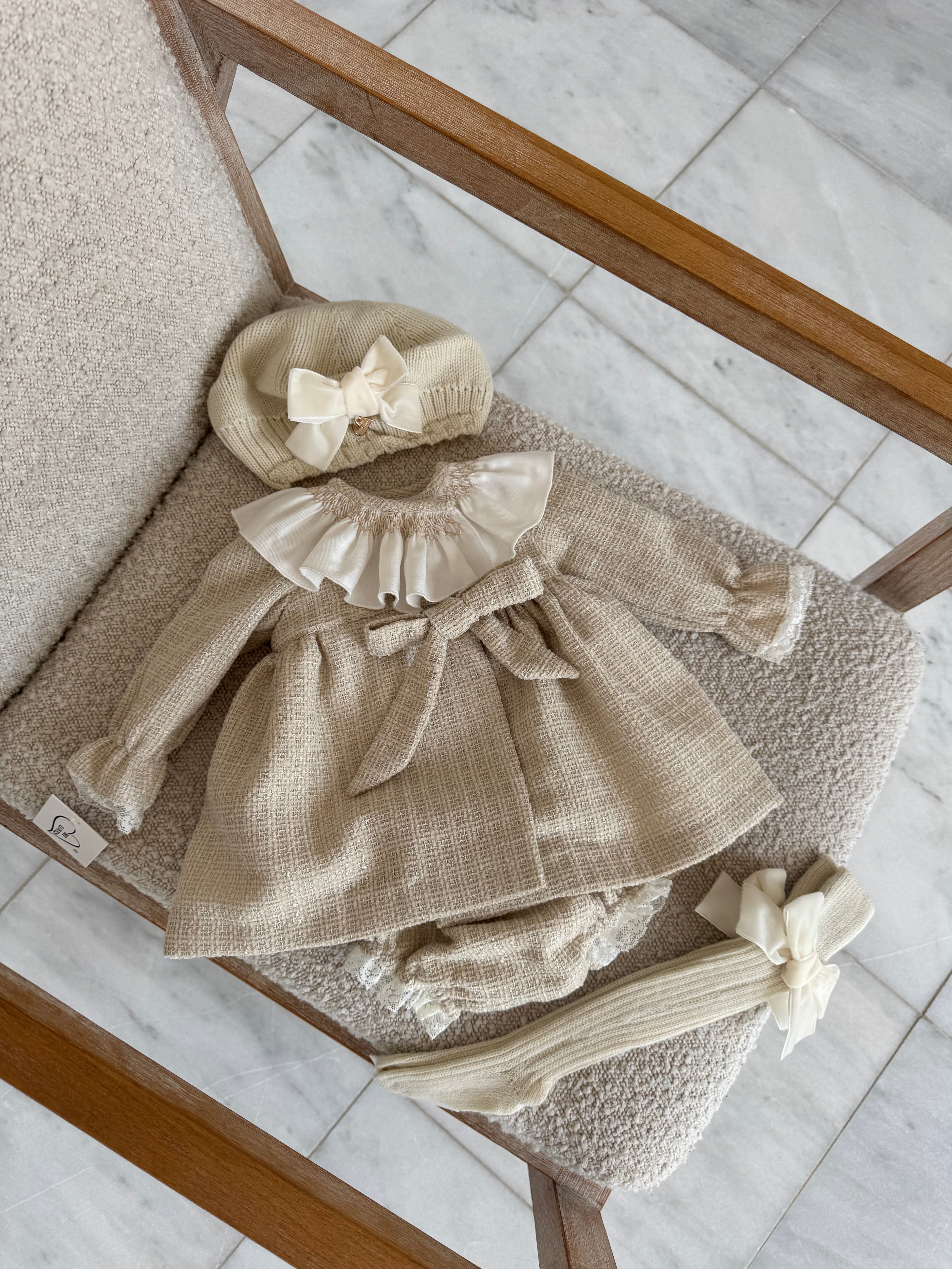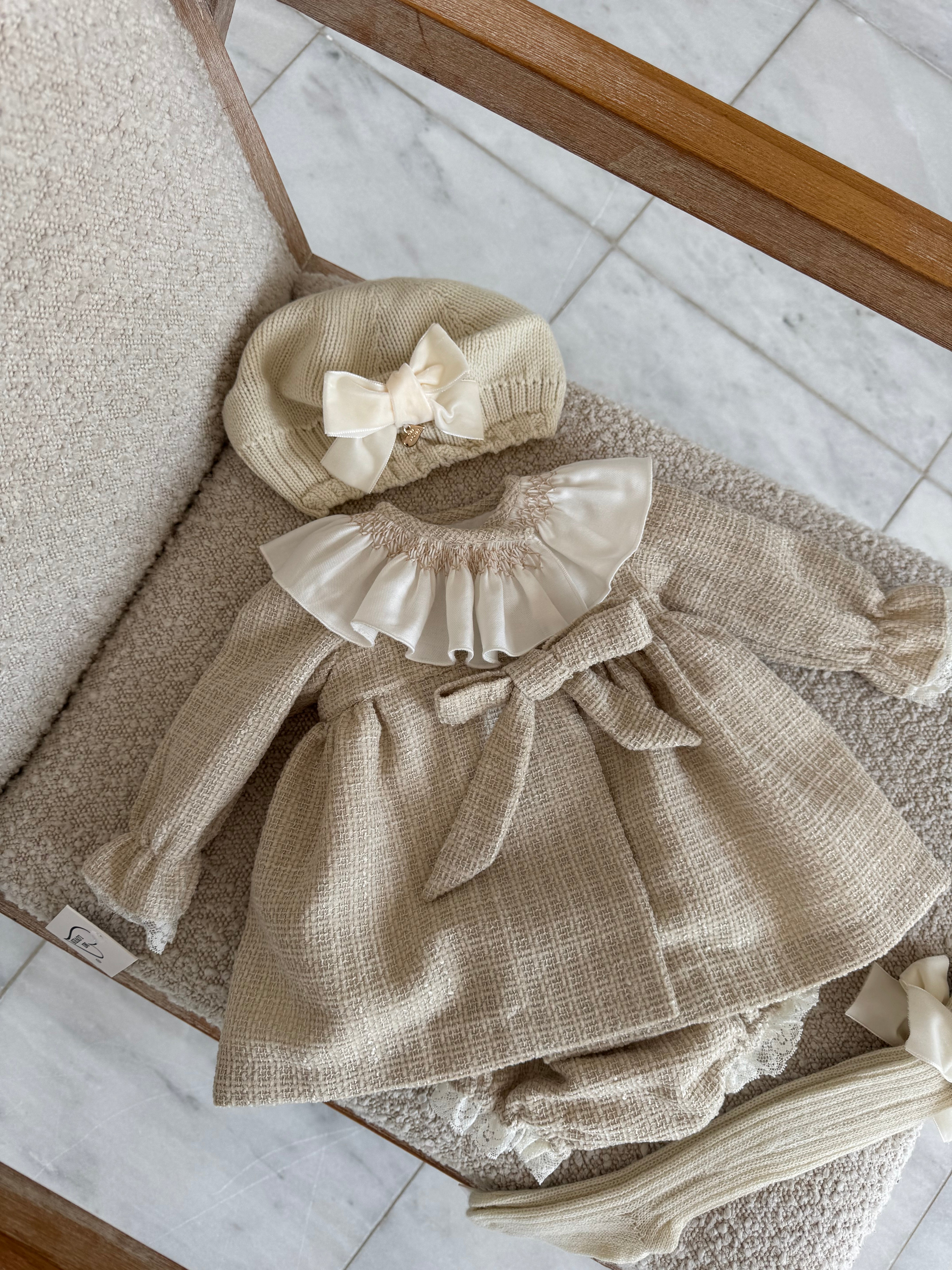 Beautiful Cappuccino colour Tweed Dress and bloomers set with Hand Smoked details.