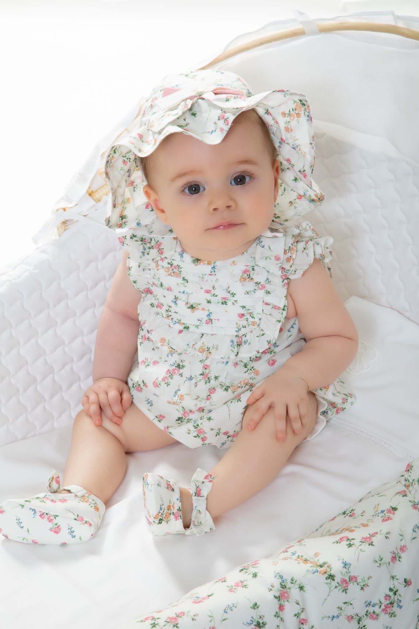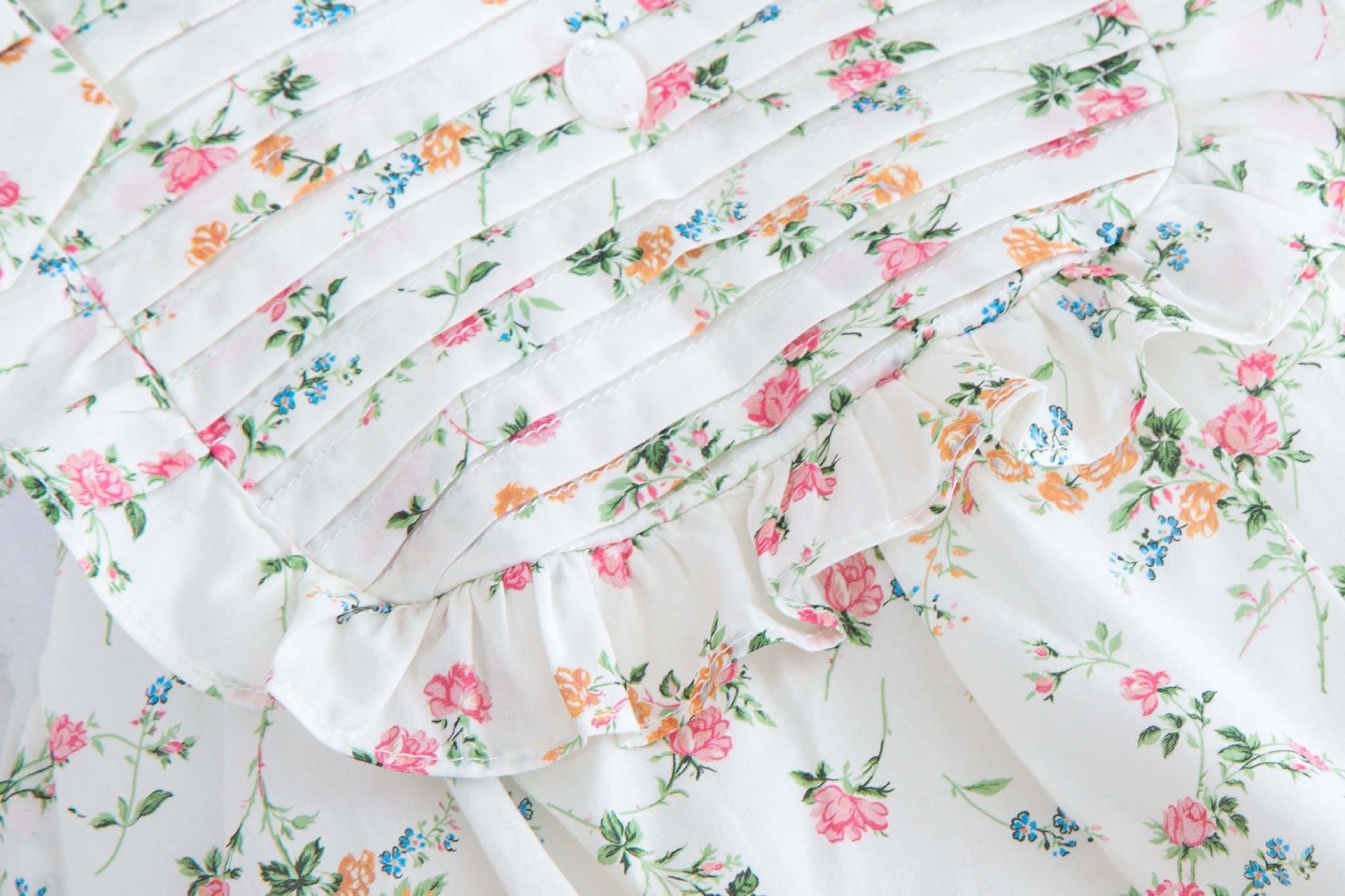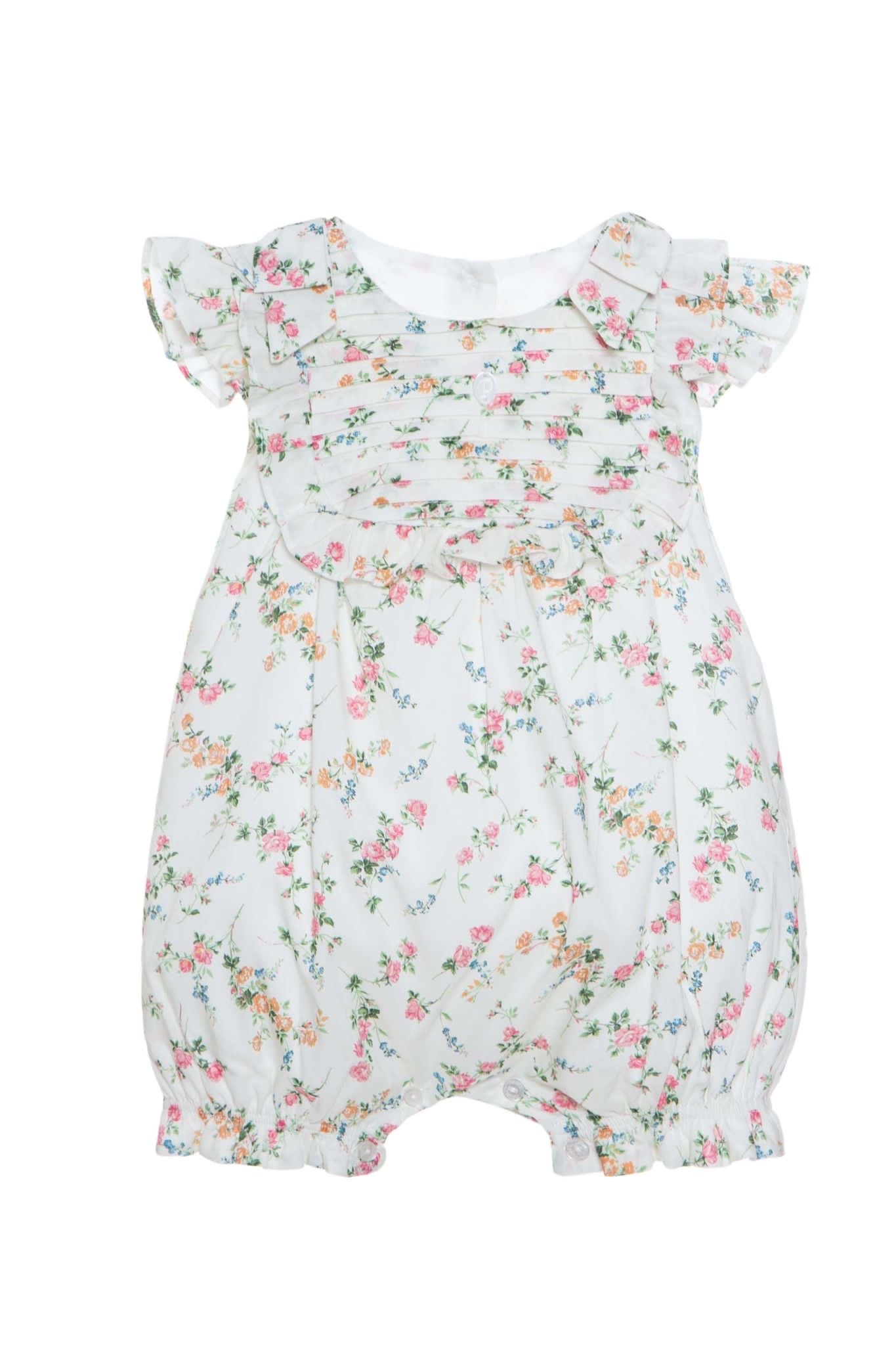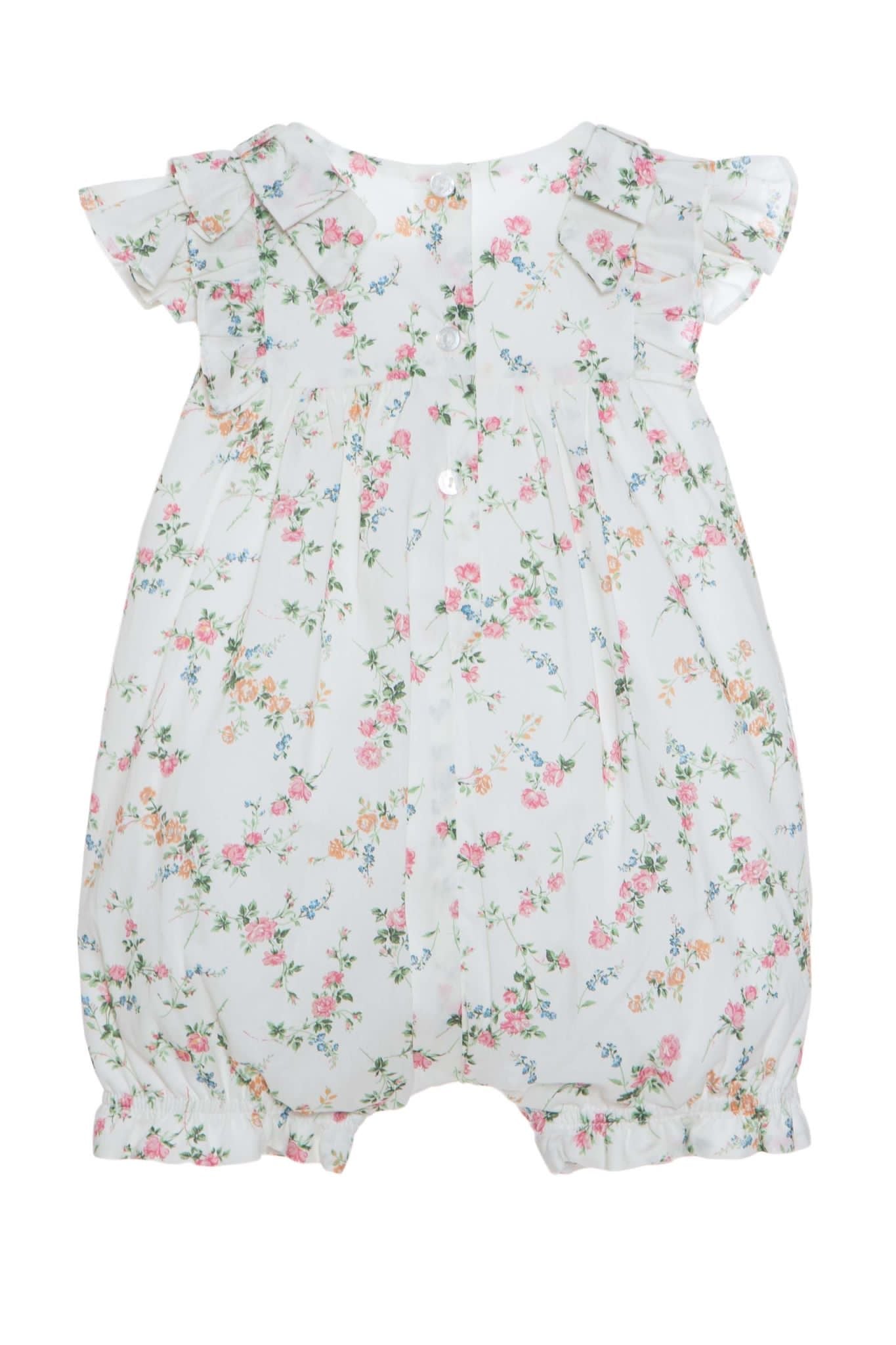 Beautiful floral romper with frill and bow details.