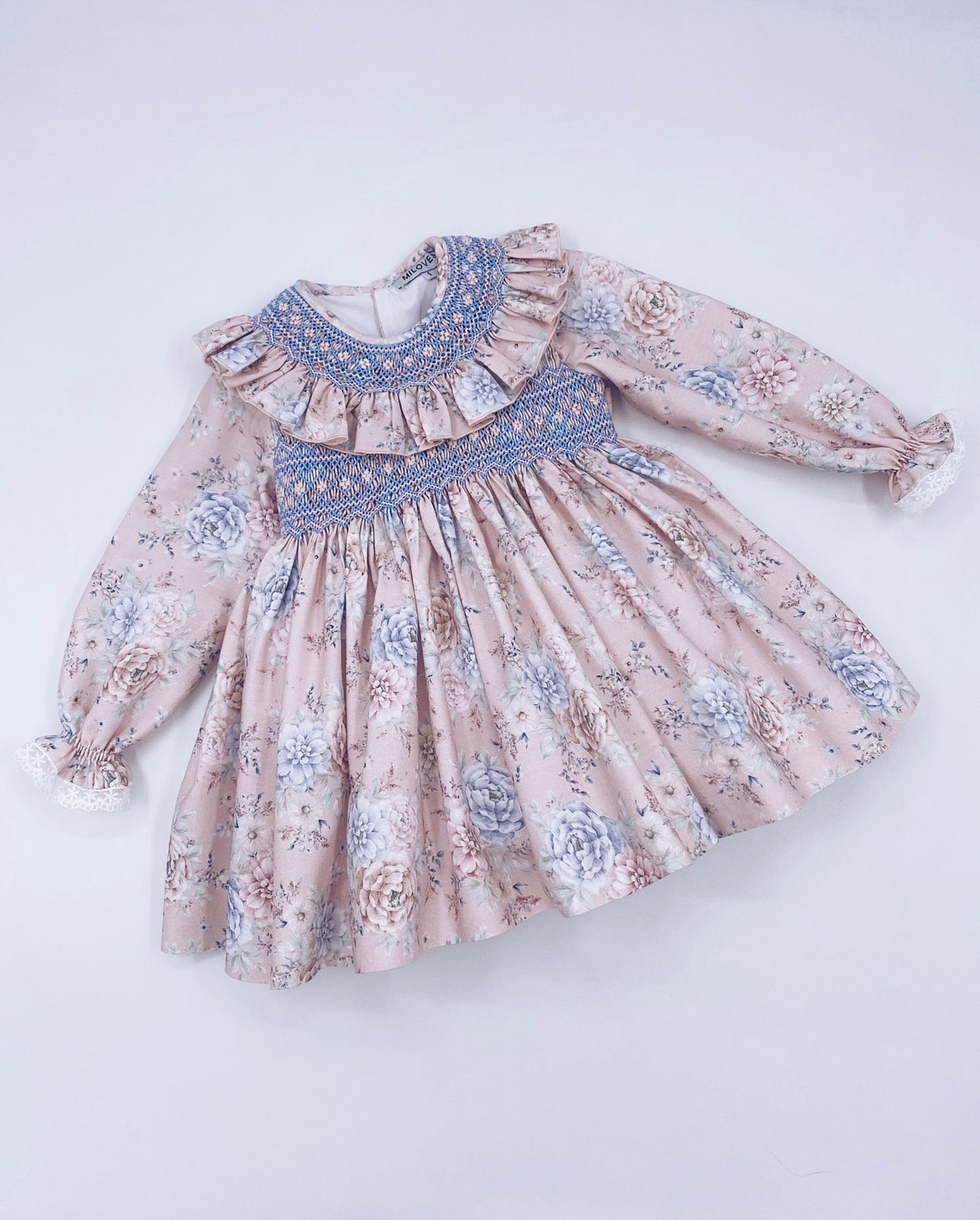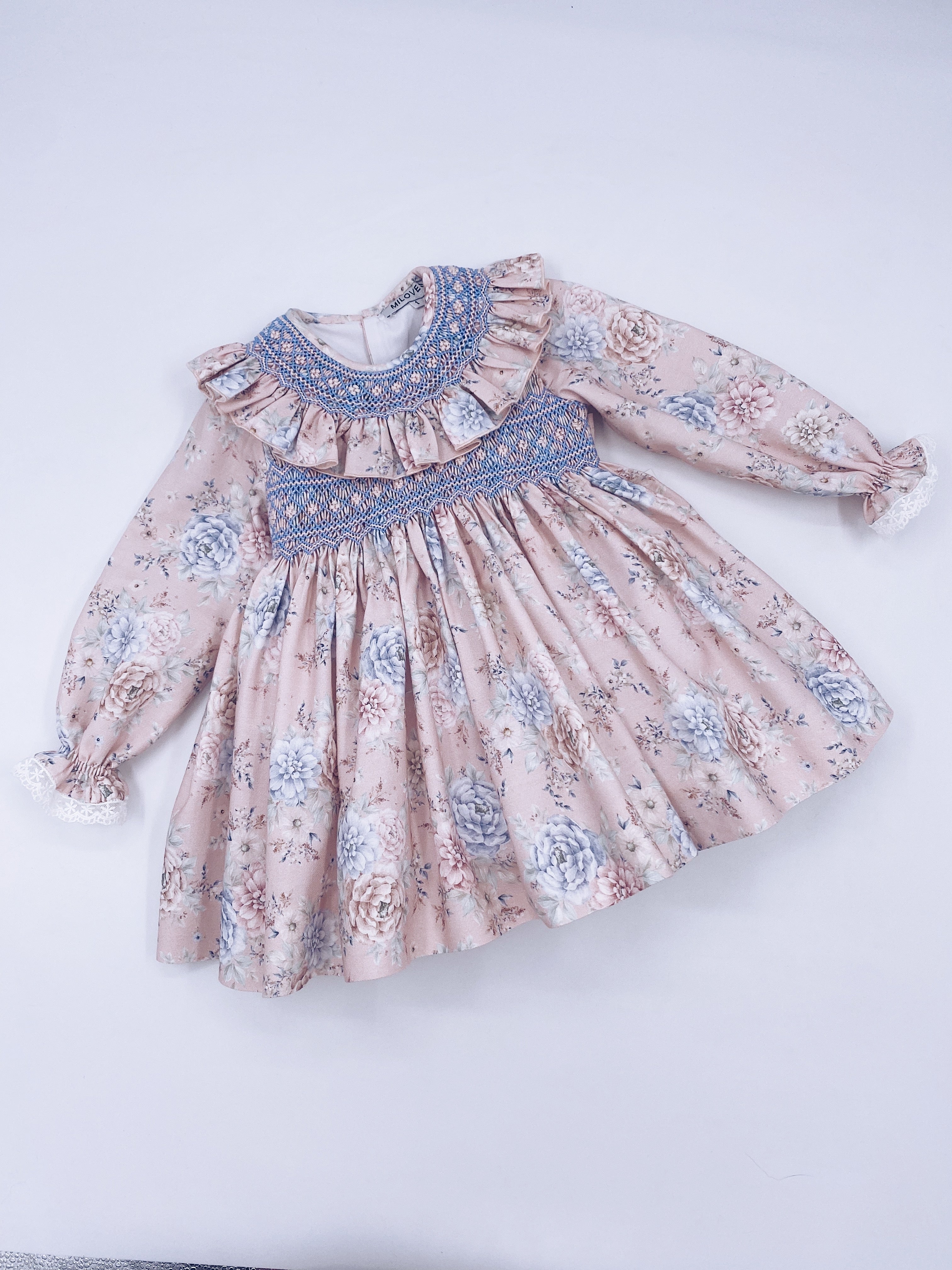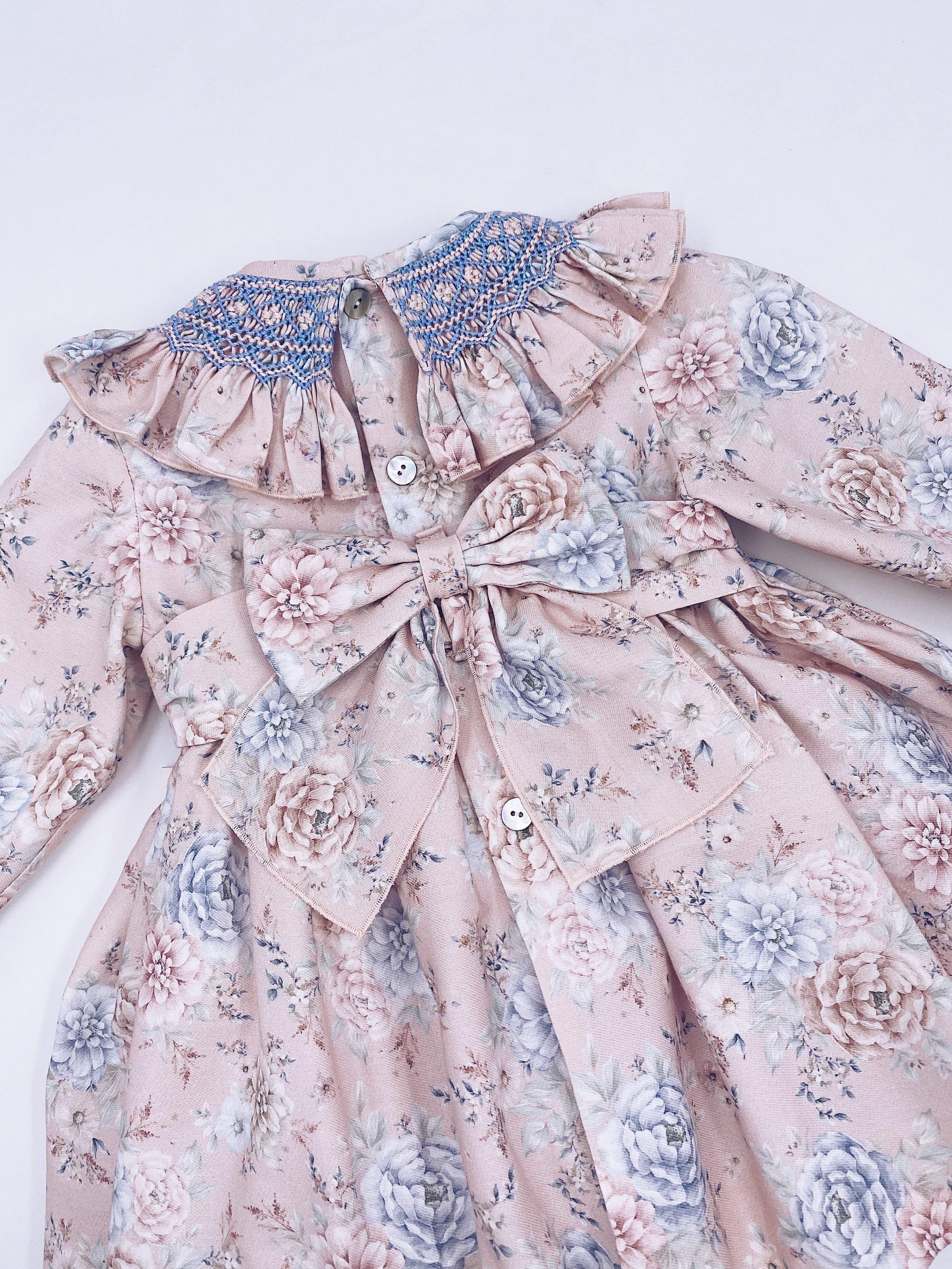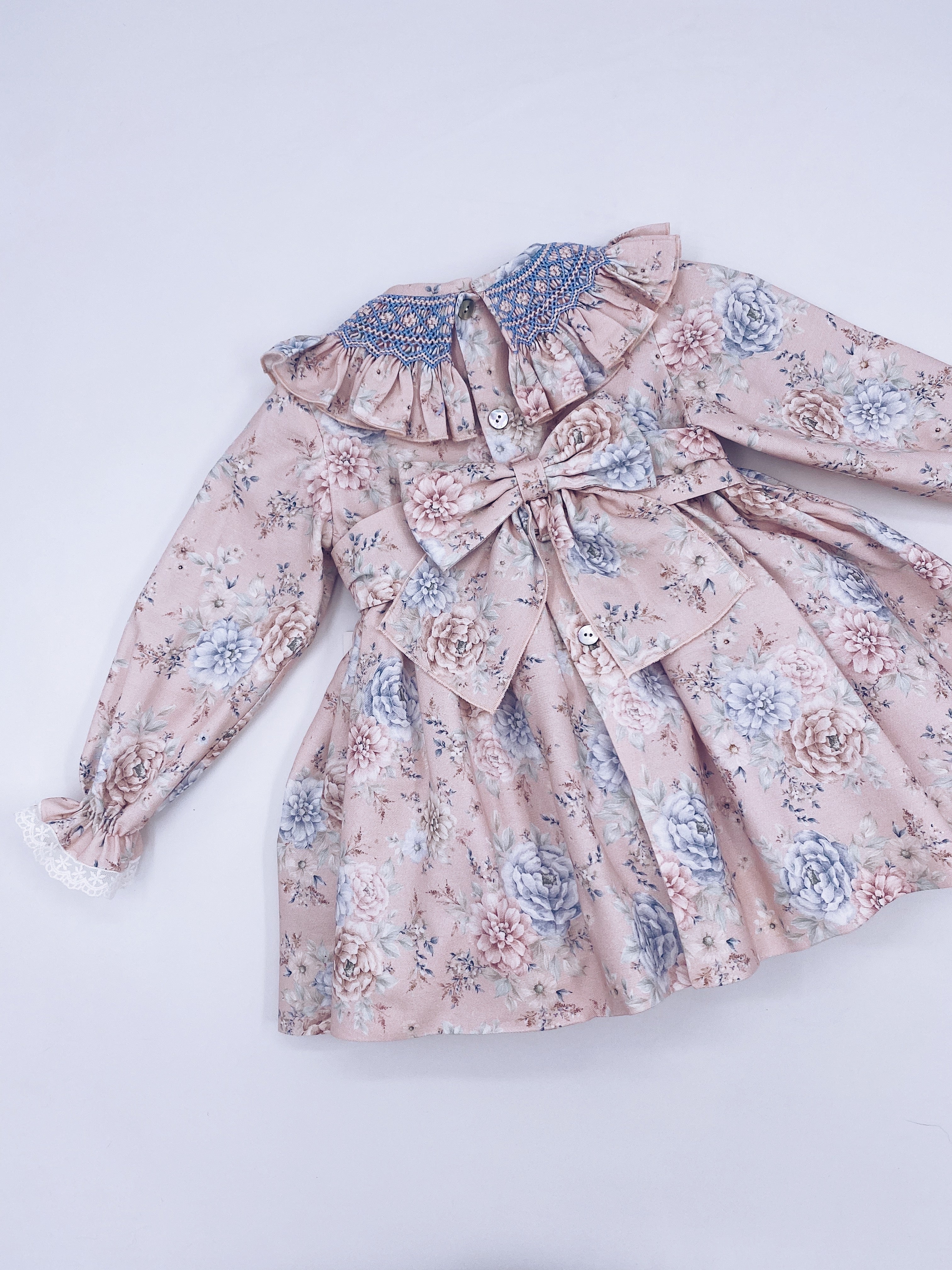Beautiful pink floral print dress with Hand Smoked details.Beautiful Hand smoked details,pretty lace on the cuff and bow on the back,Beautiful full skirt!!