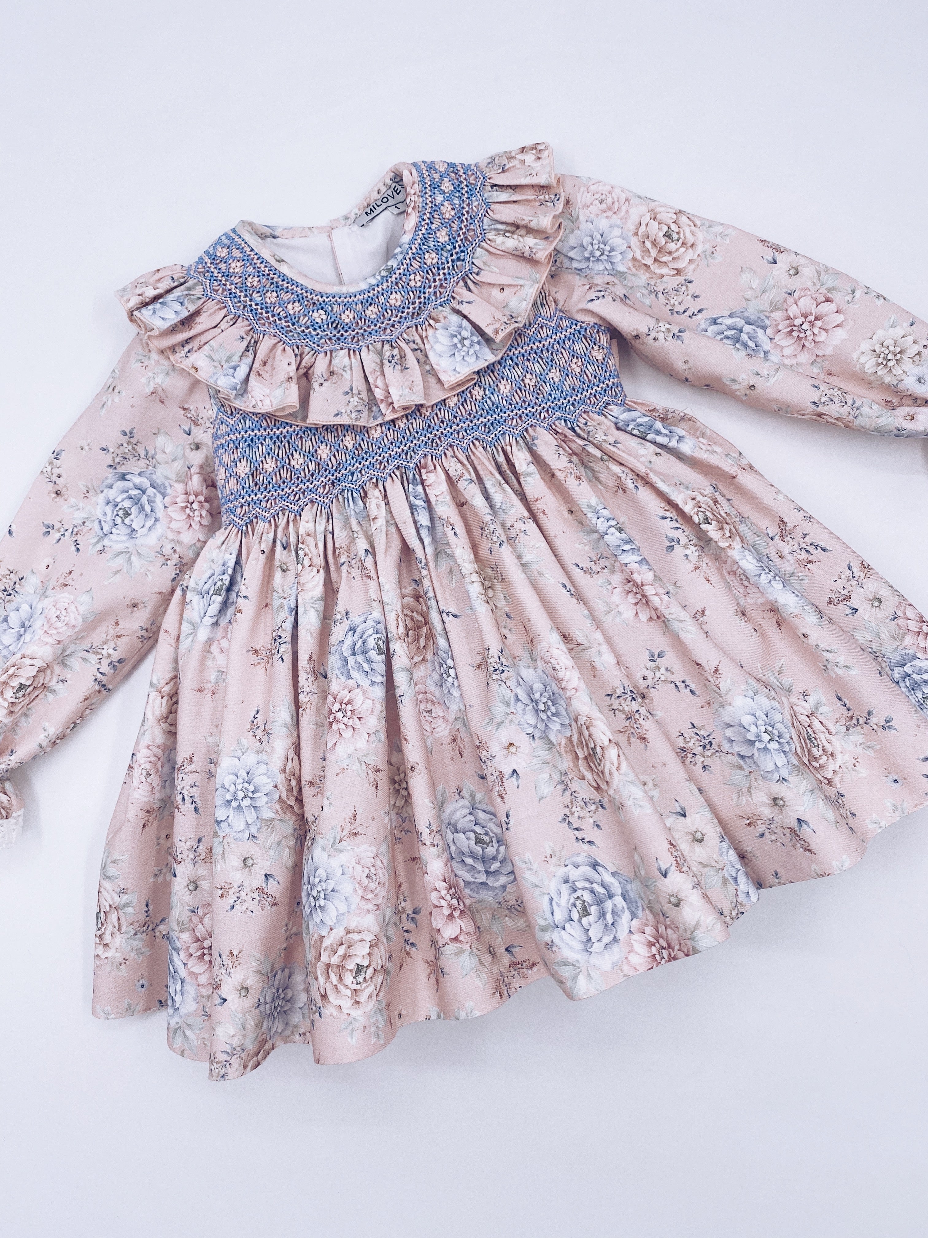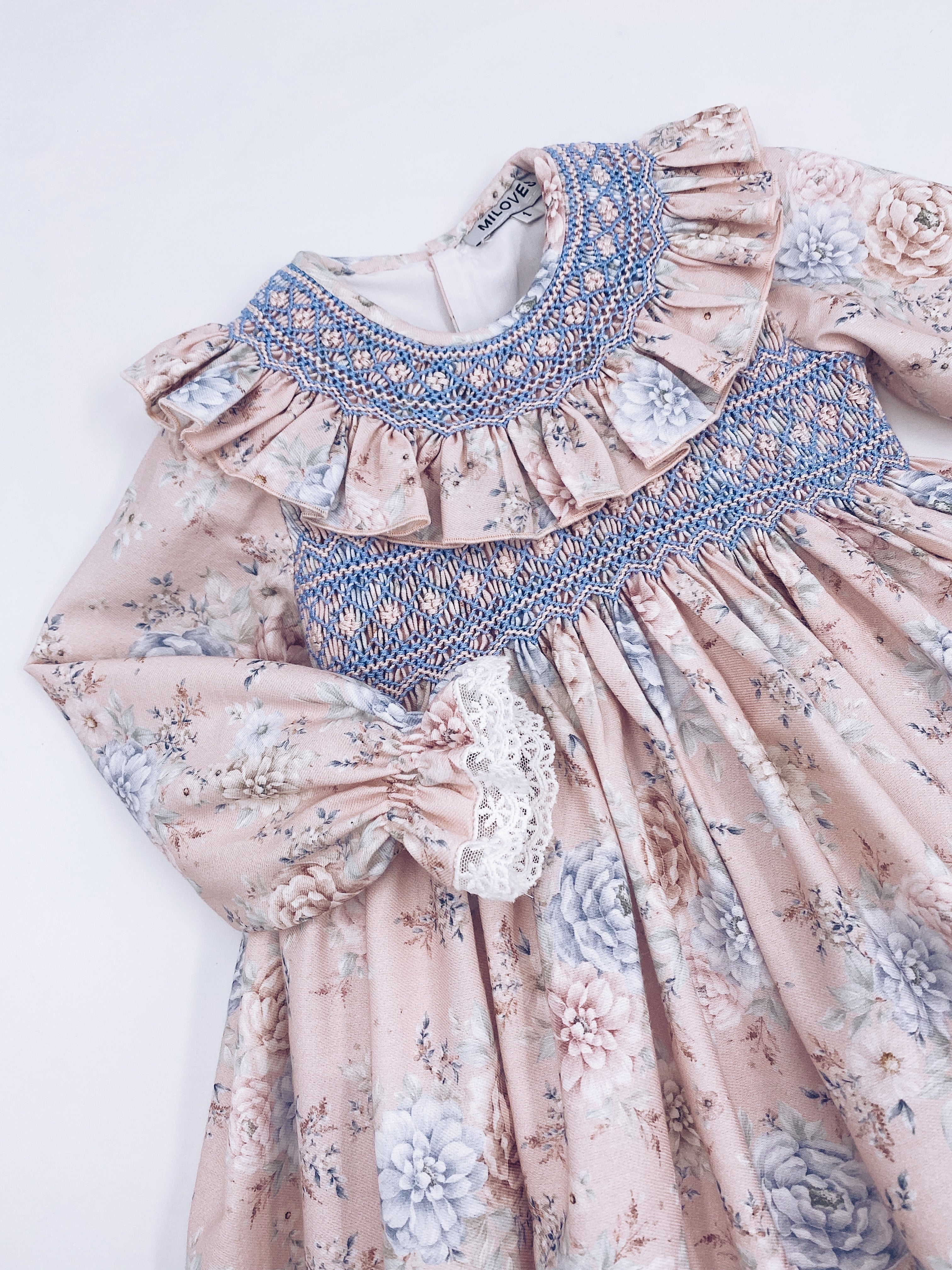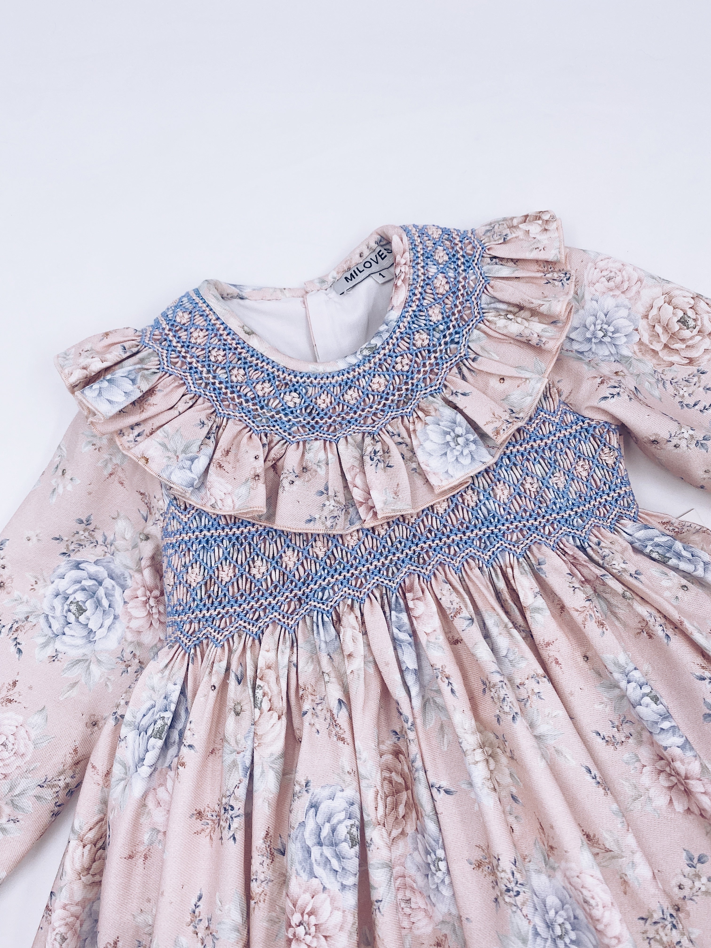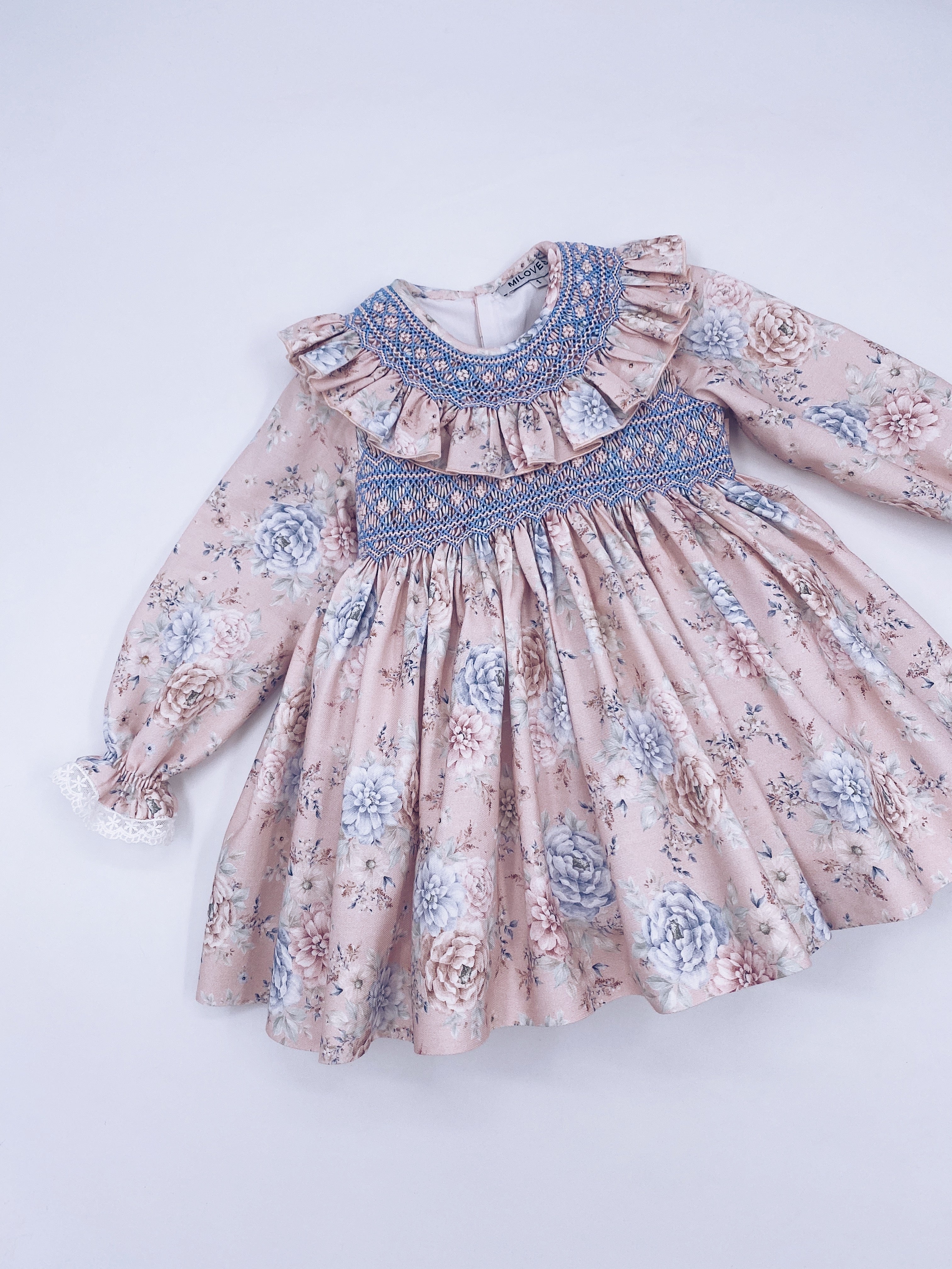 Beautiful pink floral print dress with Hand Smoked details.Beautiful Hand smoked details,pretty lace on the cuff and bow on the back,Beautiful full skirt!!
