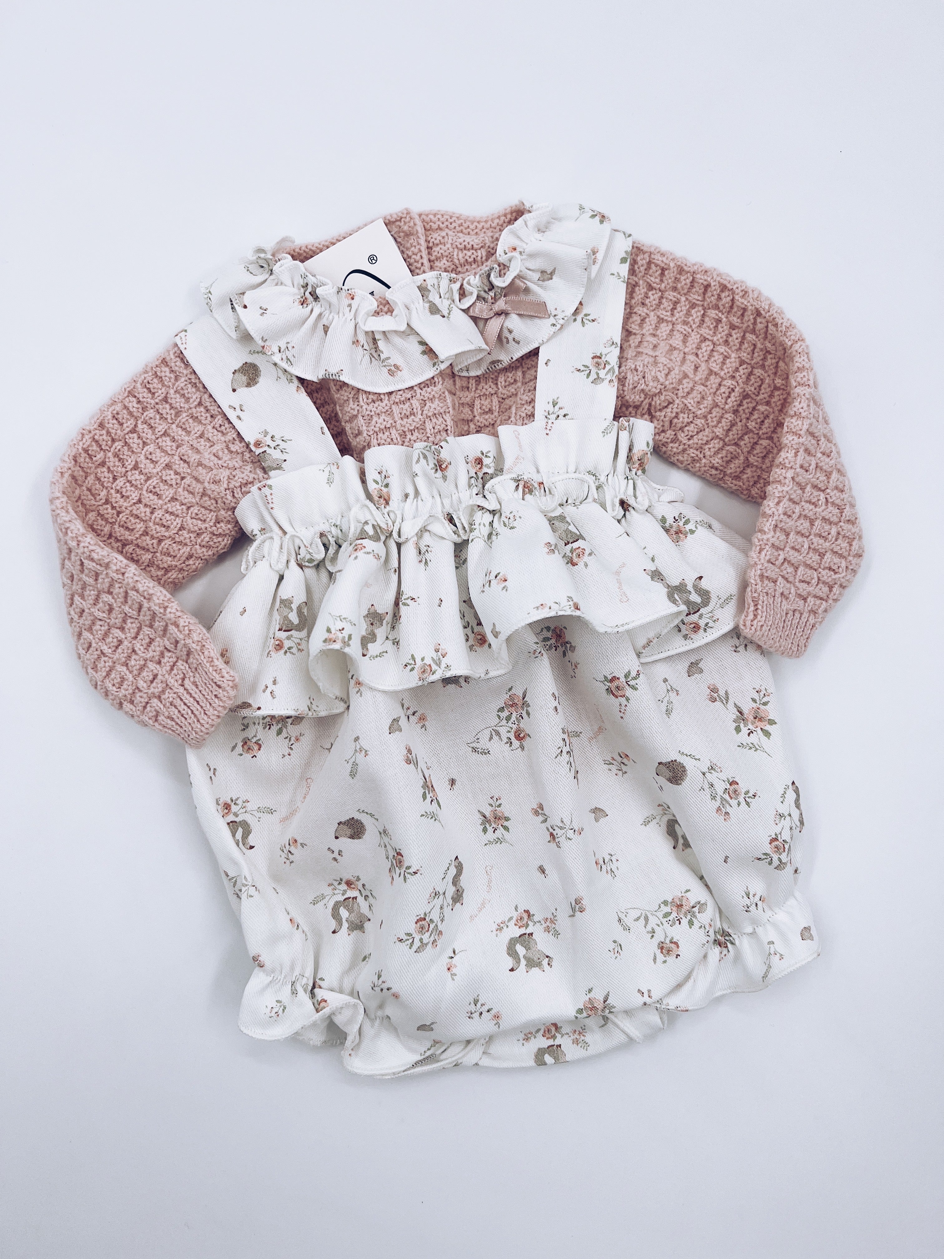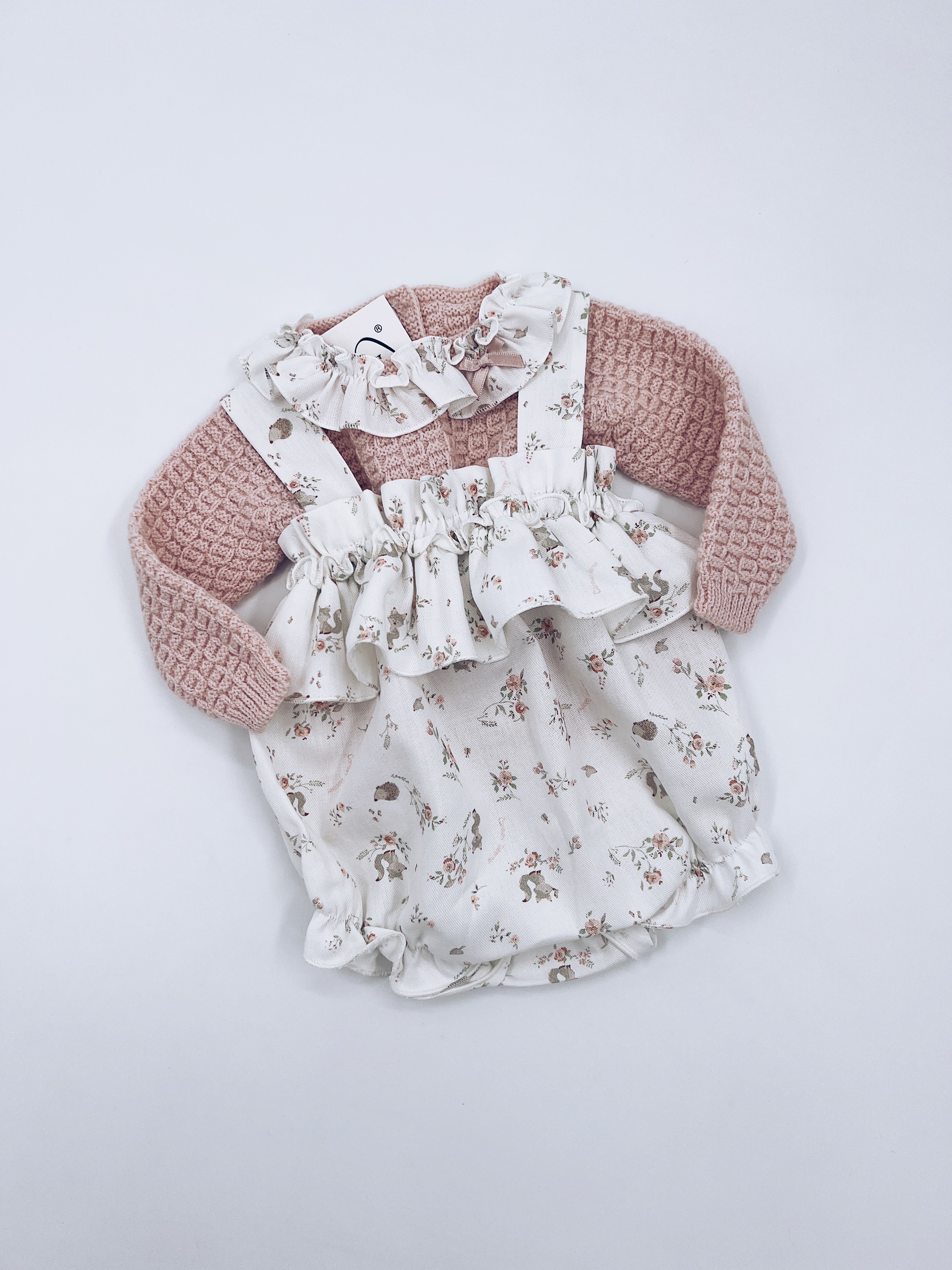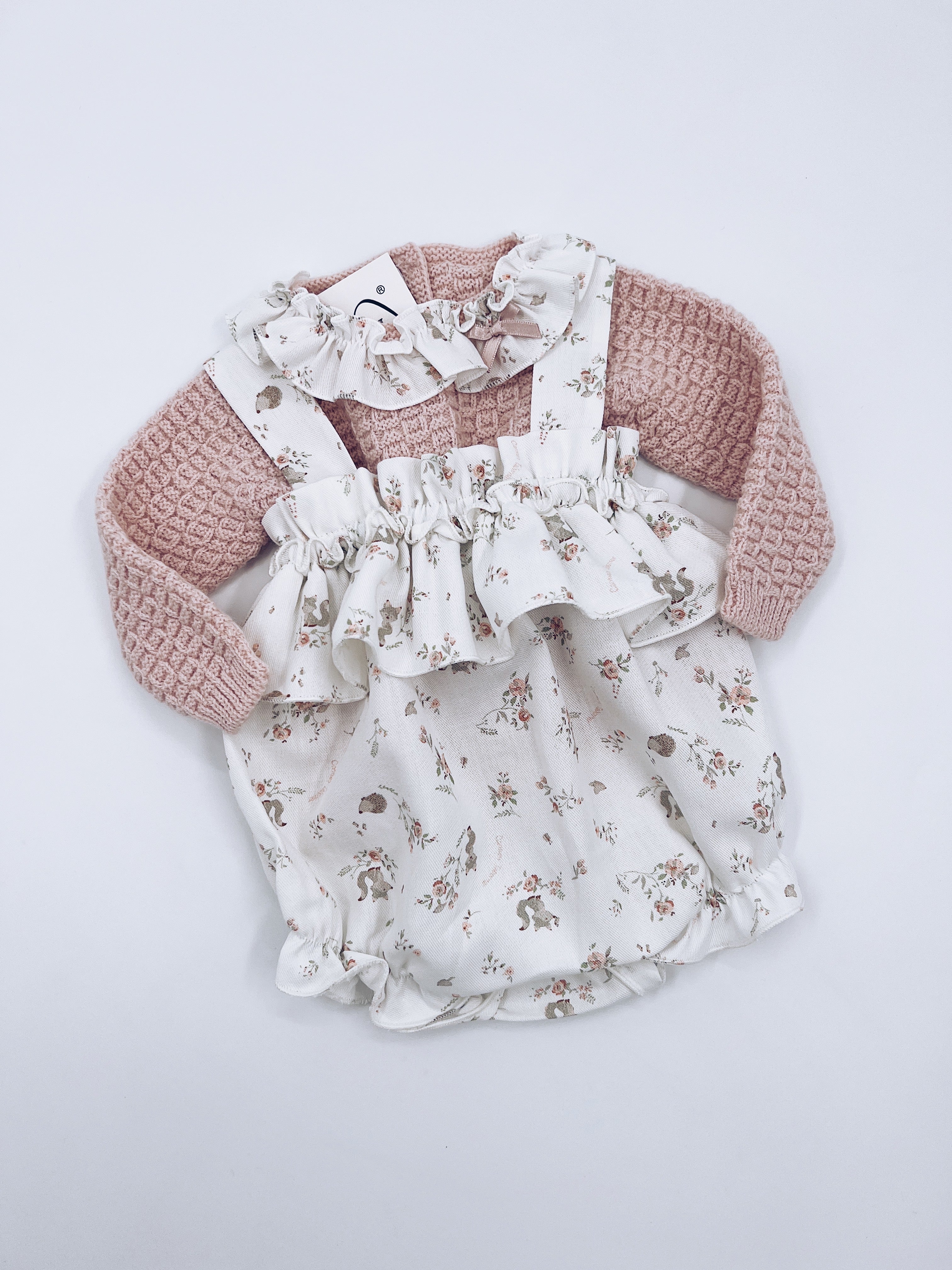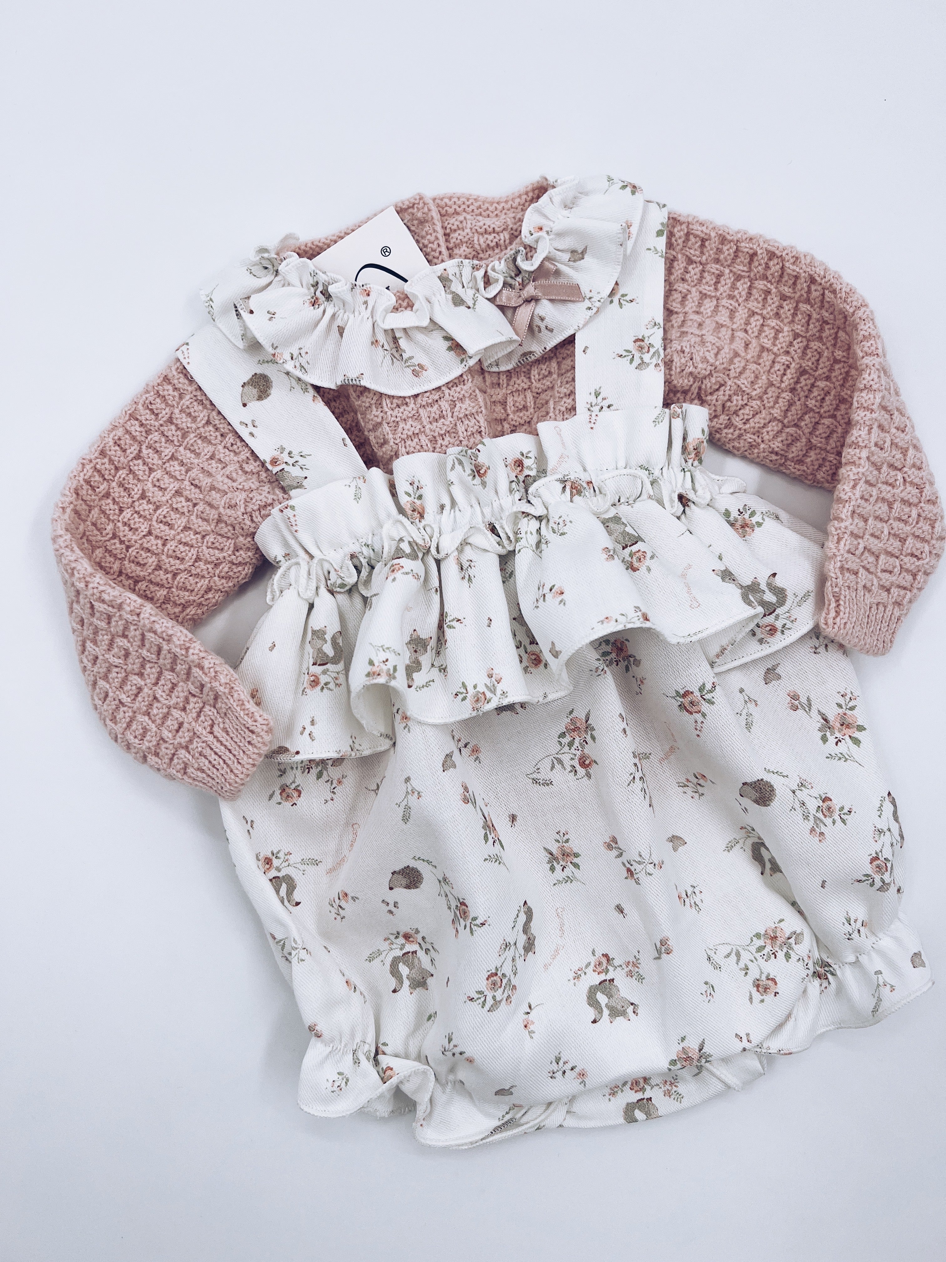 Beautiful Pink Knitted top and Floral print Romper 2 piece set.