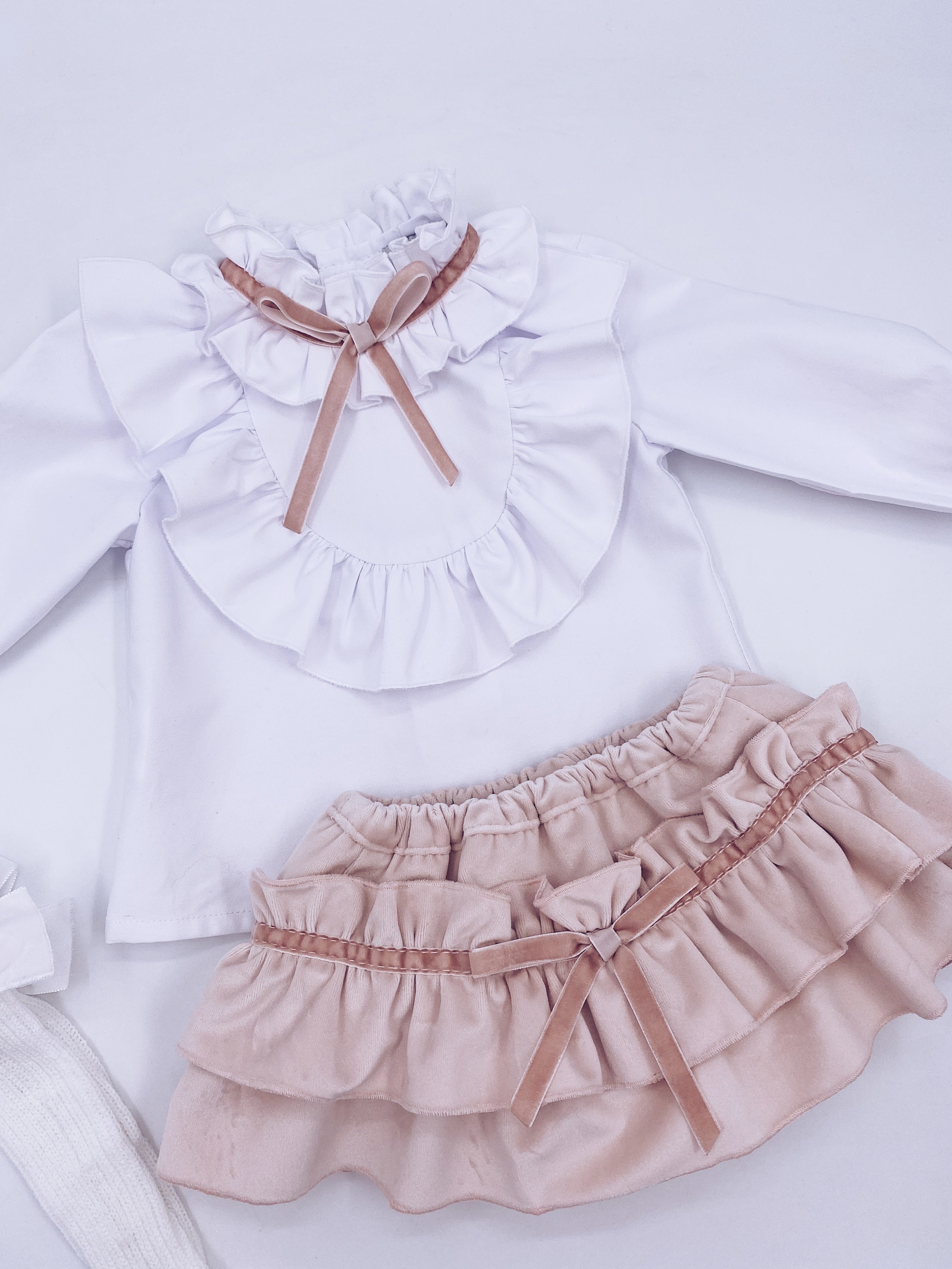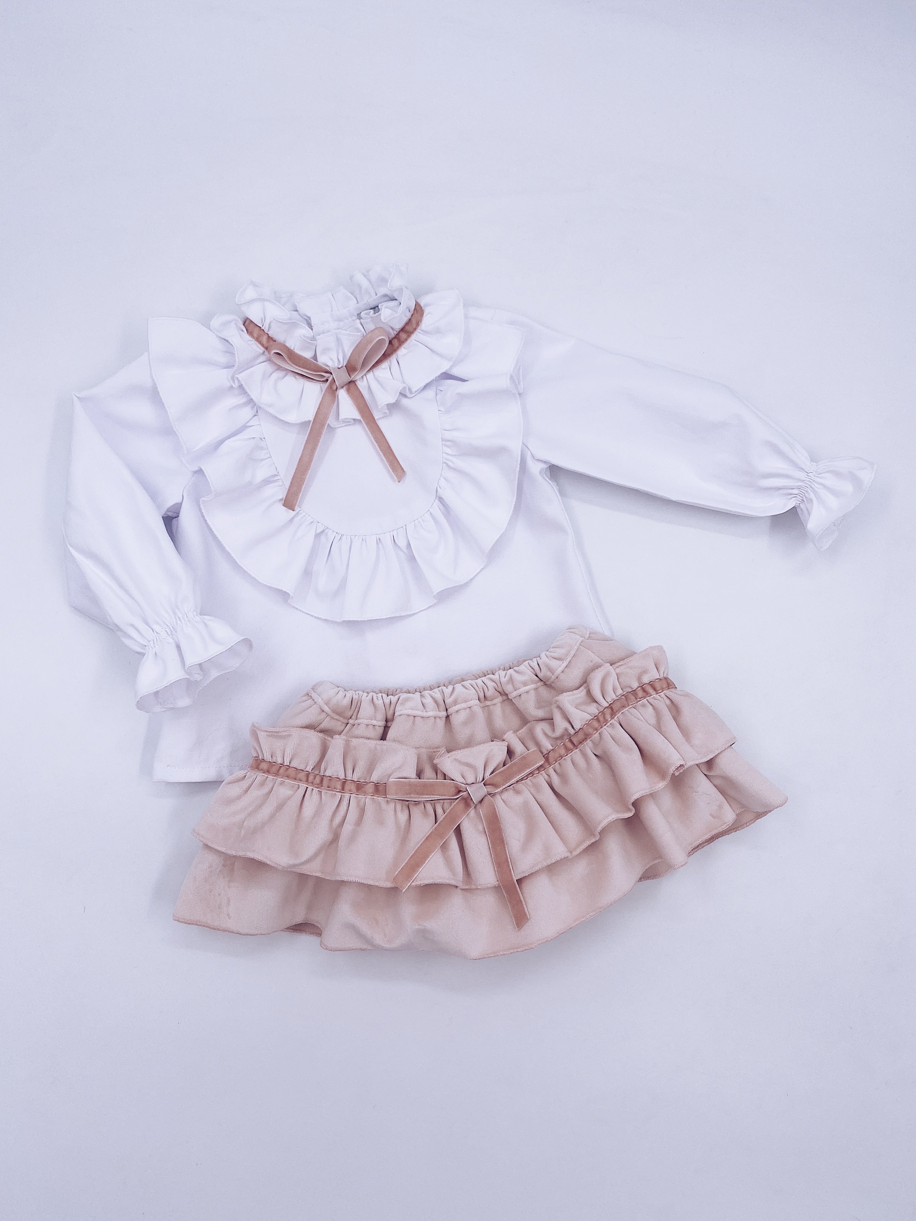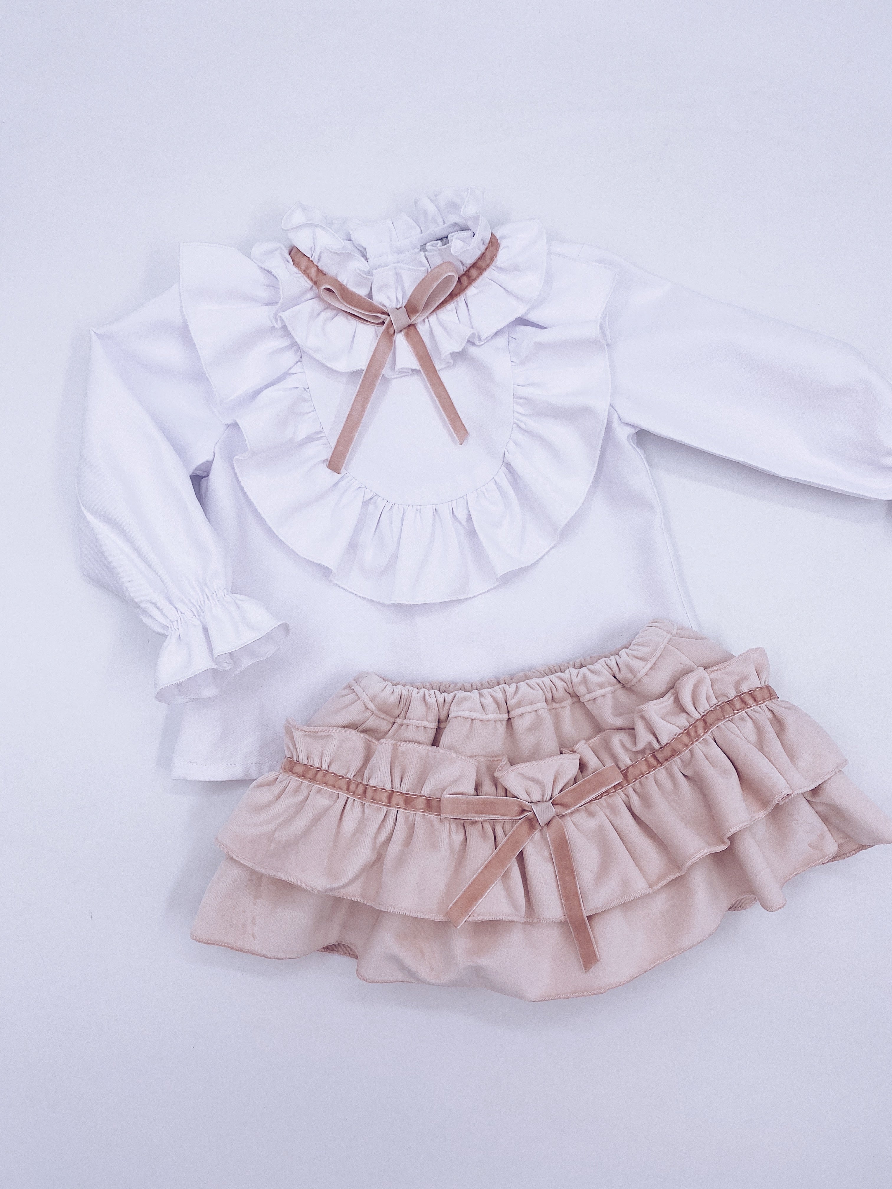 Beautiful Pink Velvet bloomers and shirt 2 piece set with frill details.