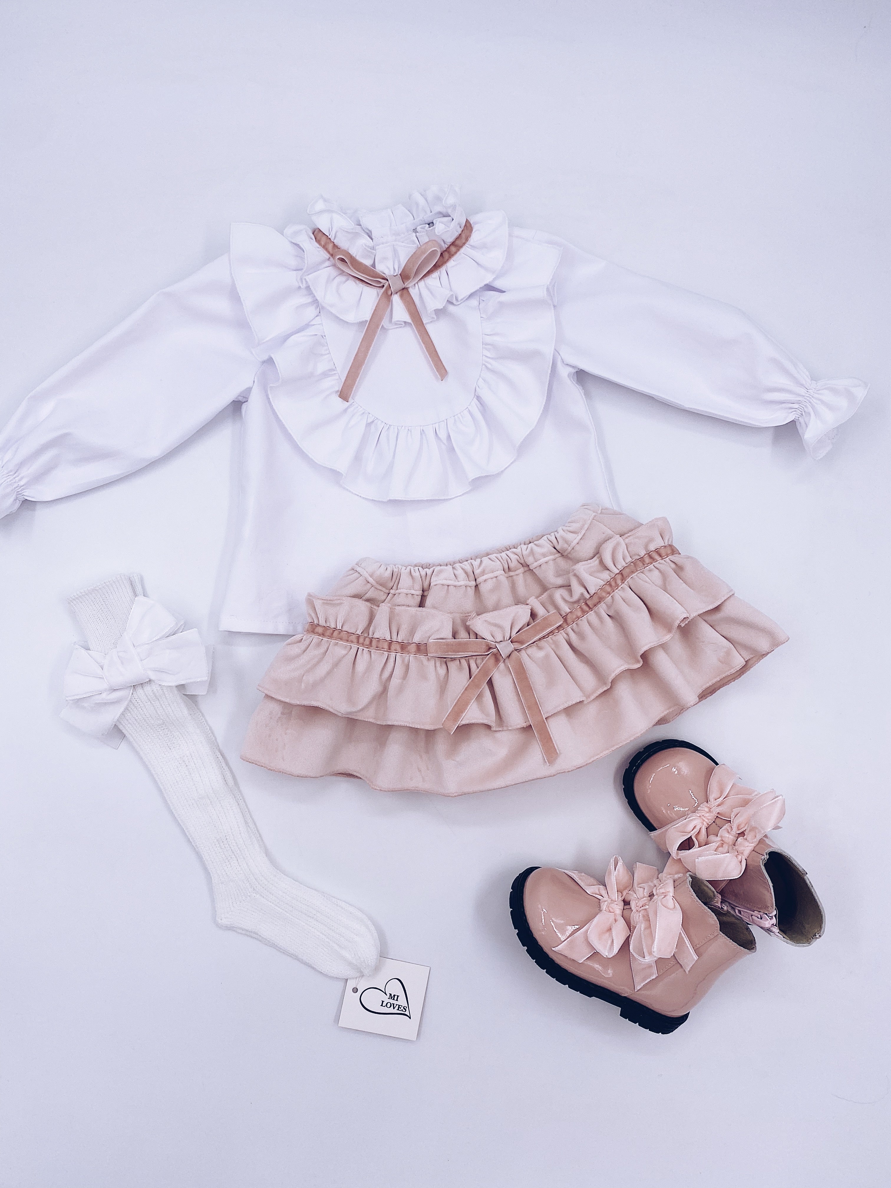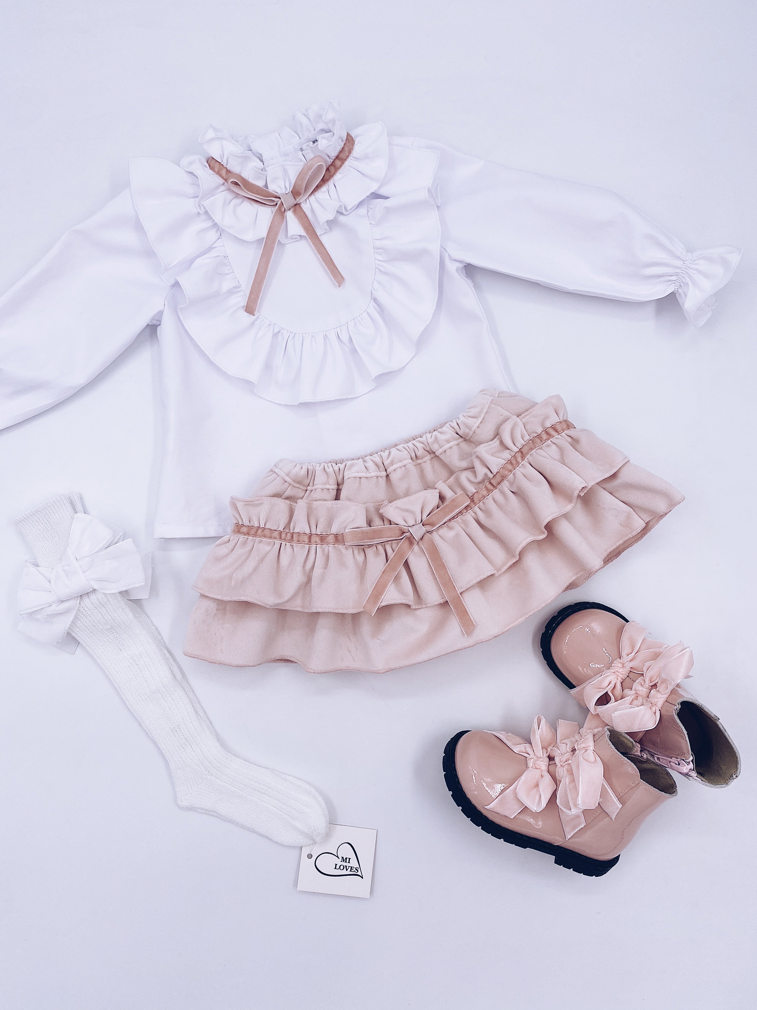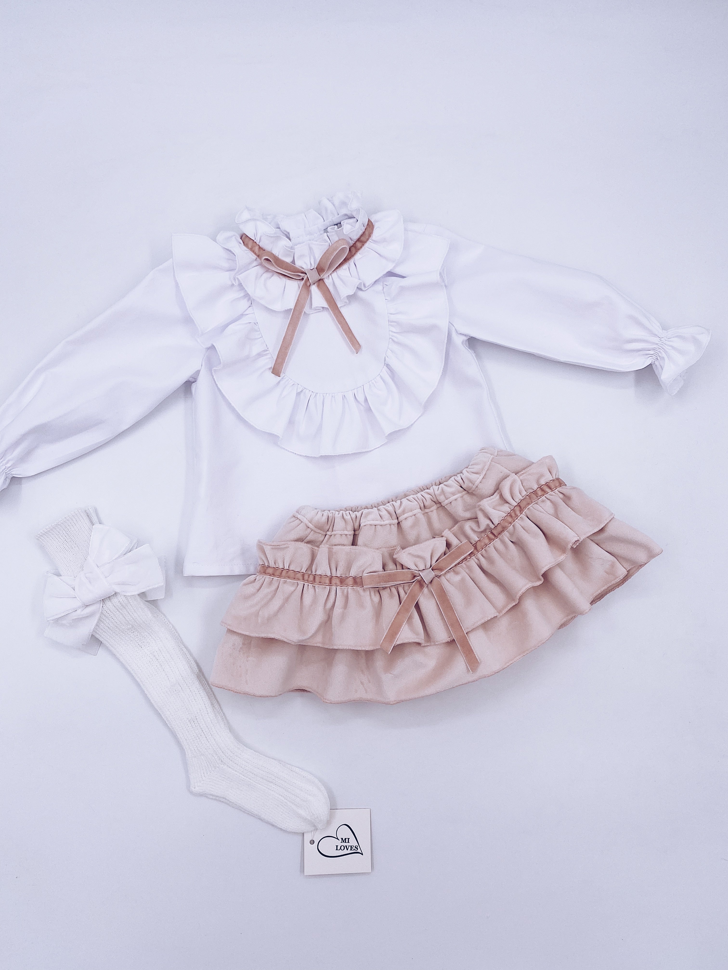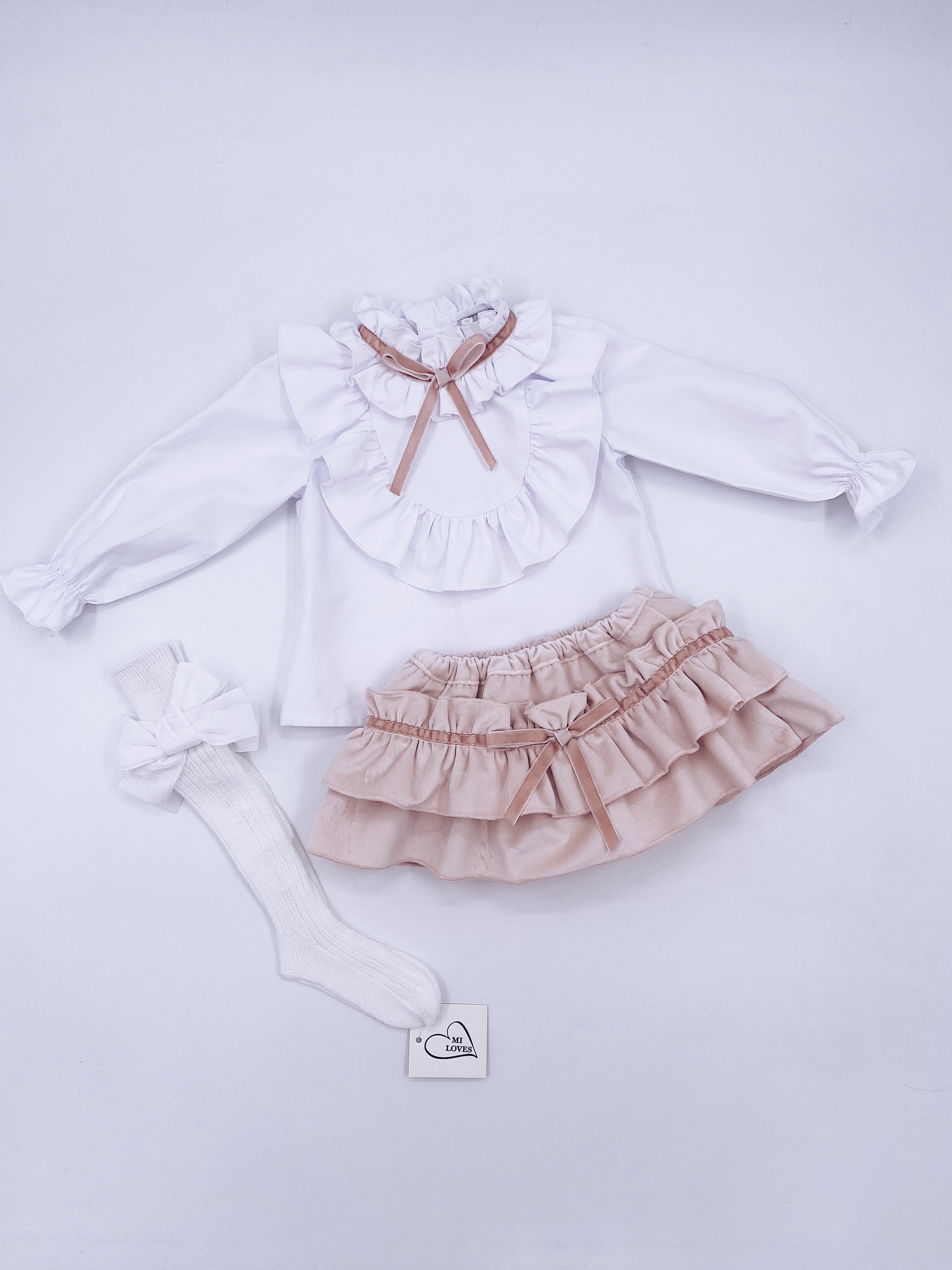 Beautiful Pink Velvet bloomers and shirt 2 piece set with frill details.