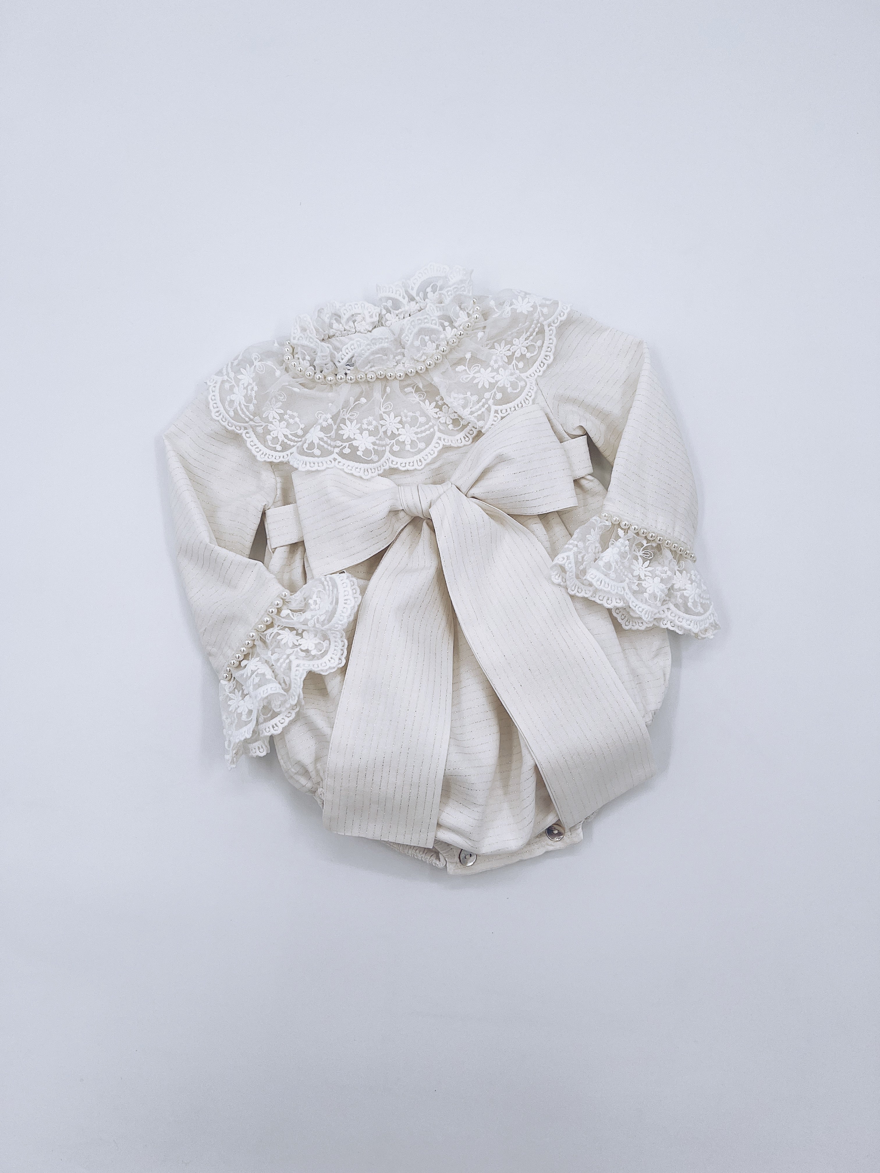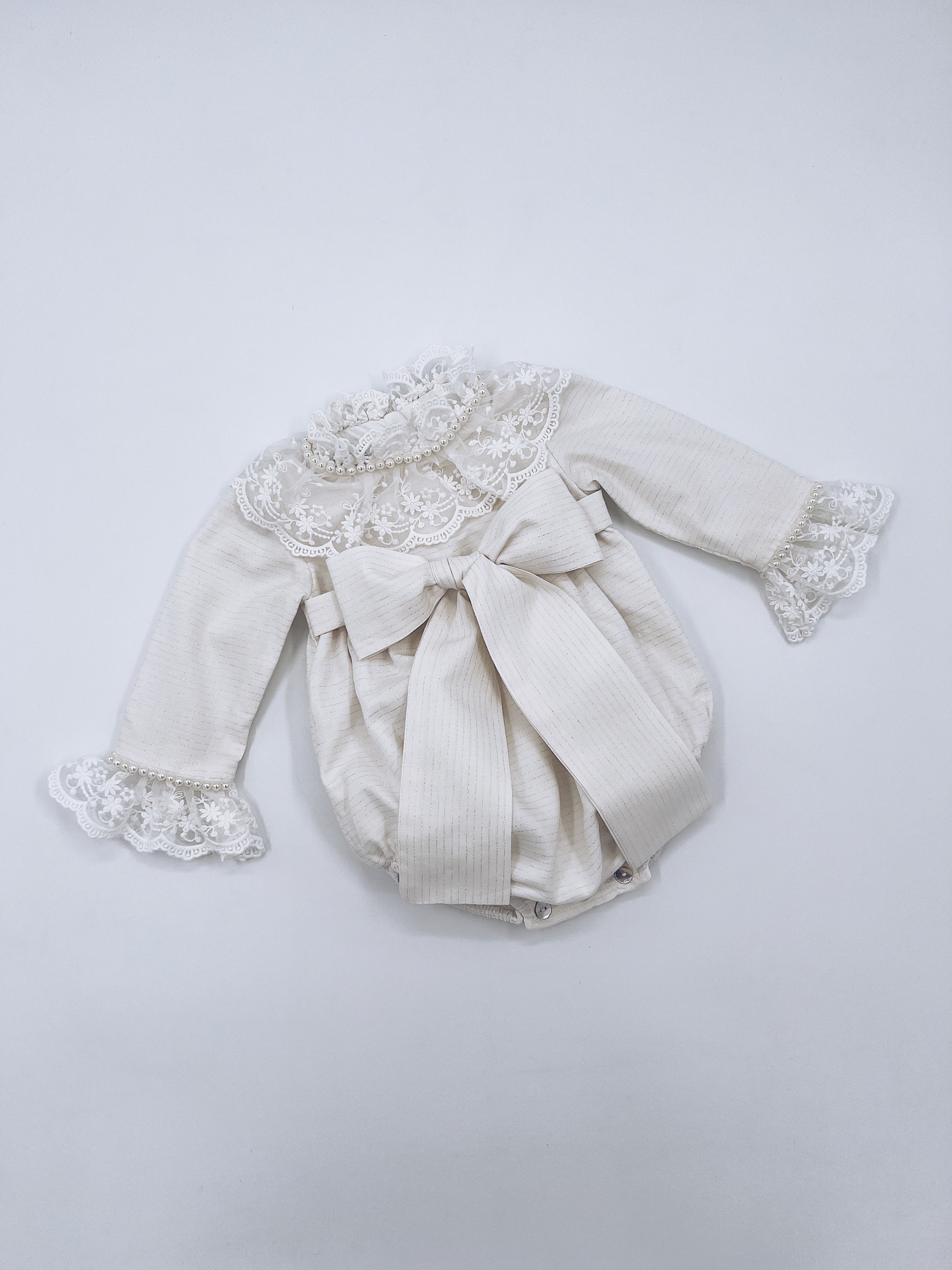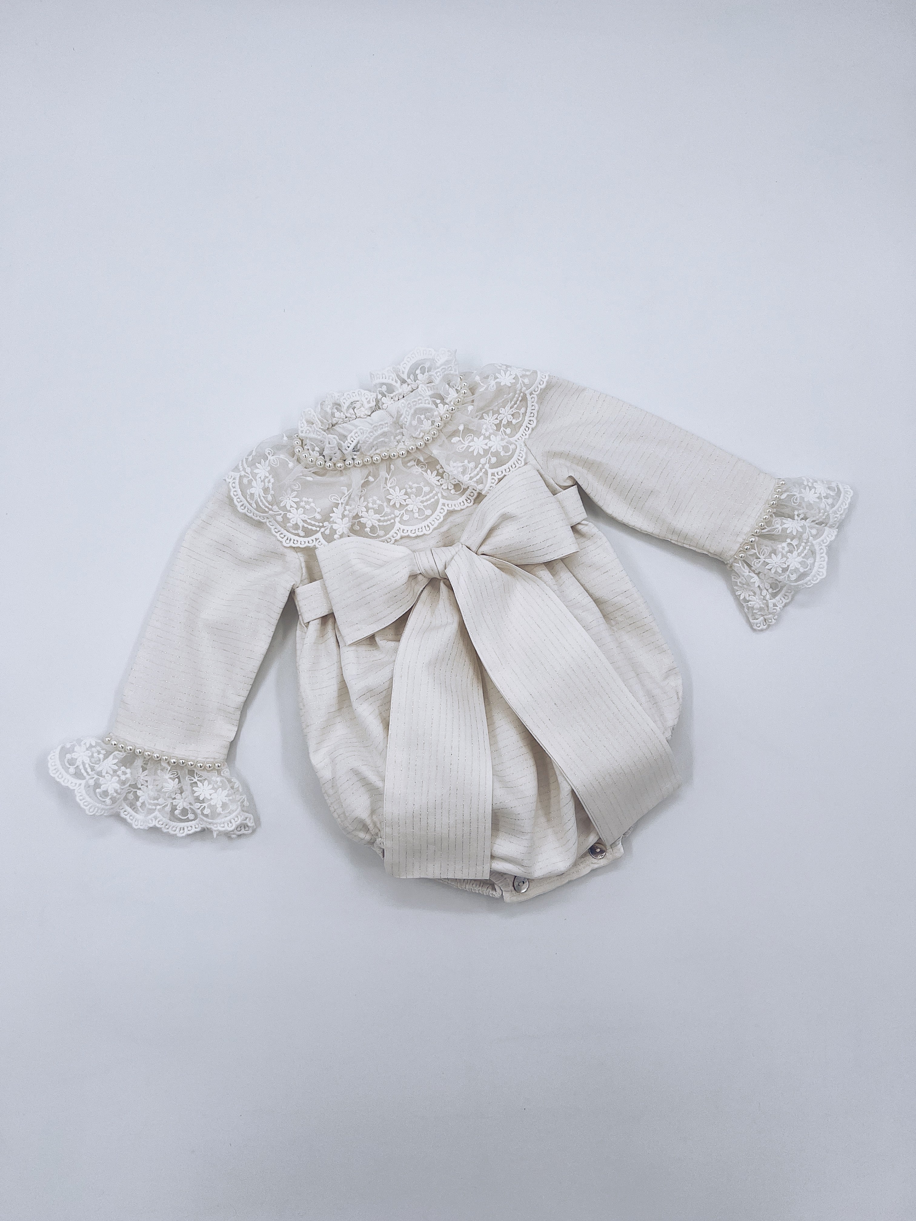 Beautiful Romper with Lovely Bow ,Faux Pearls and Lace details.