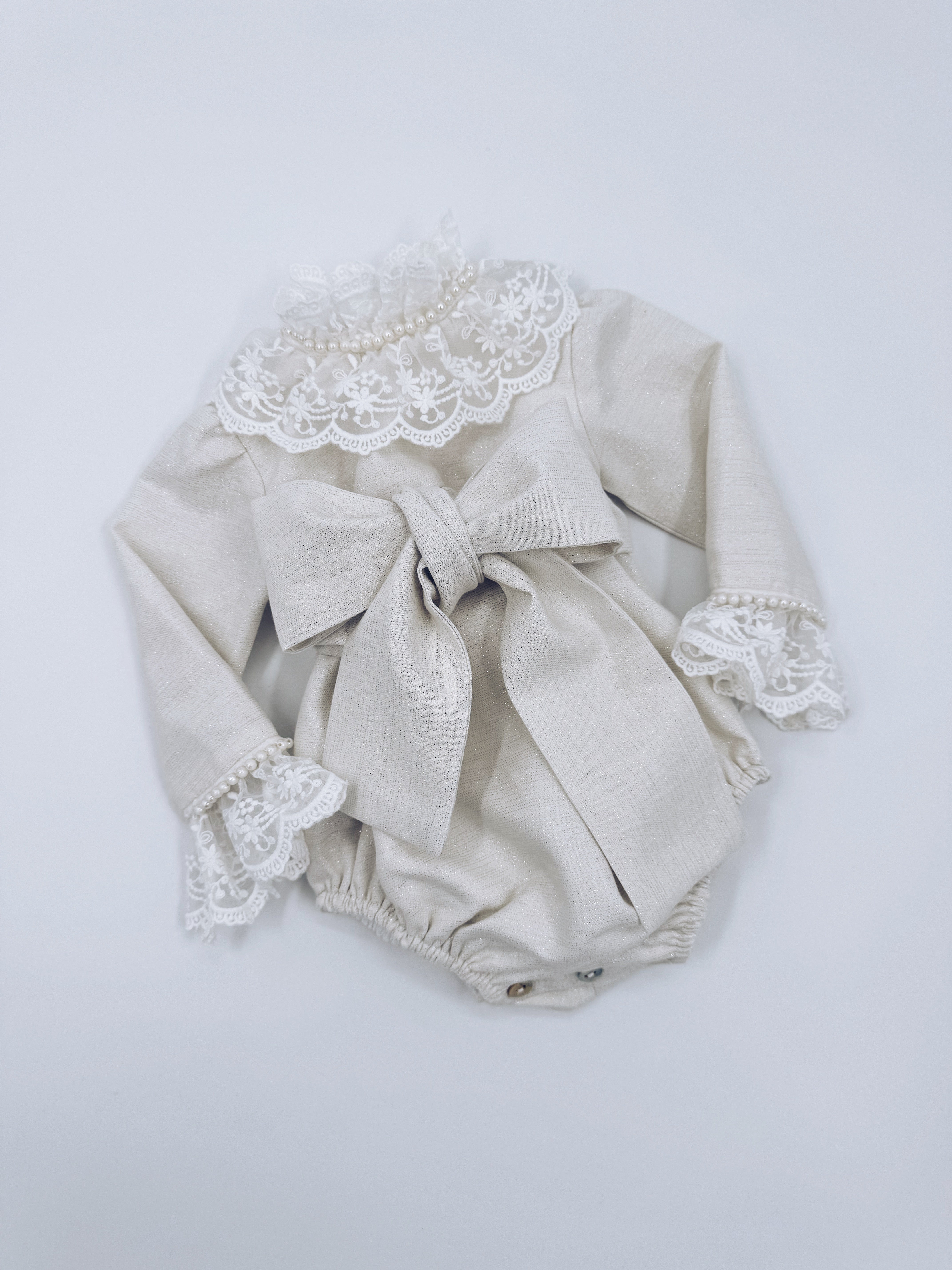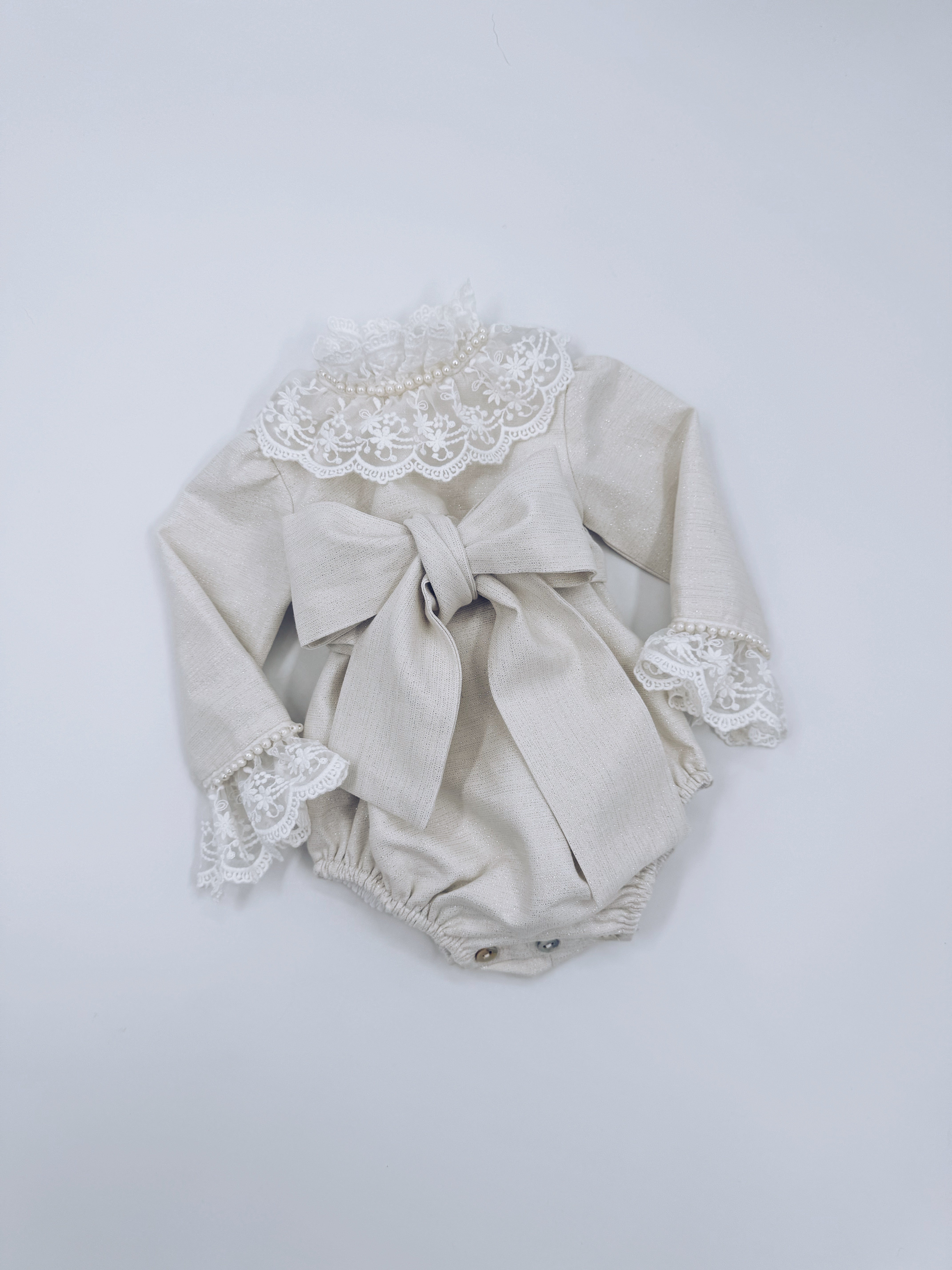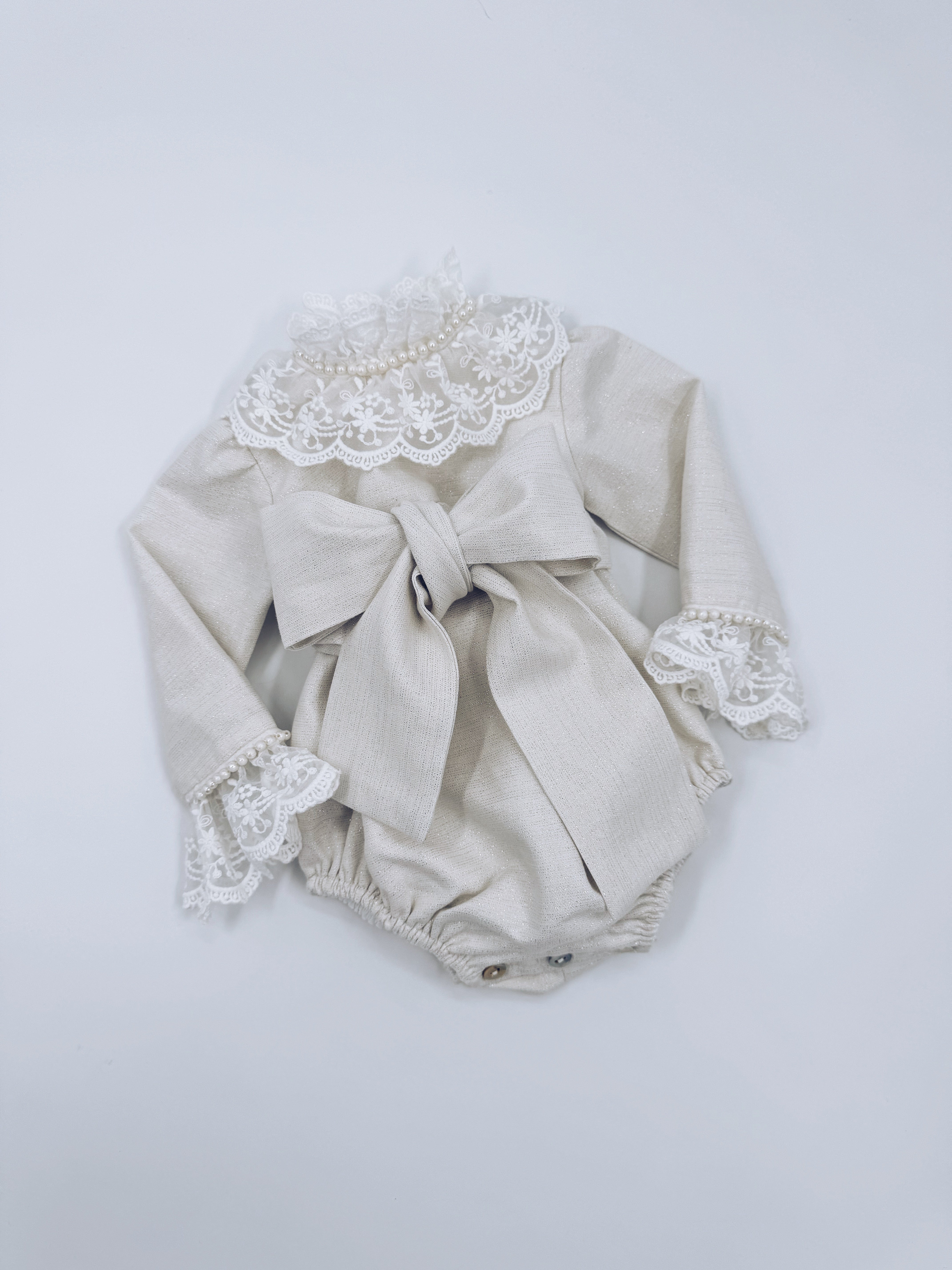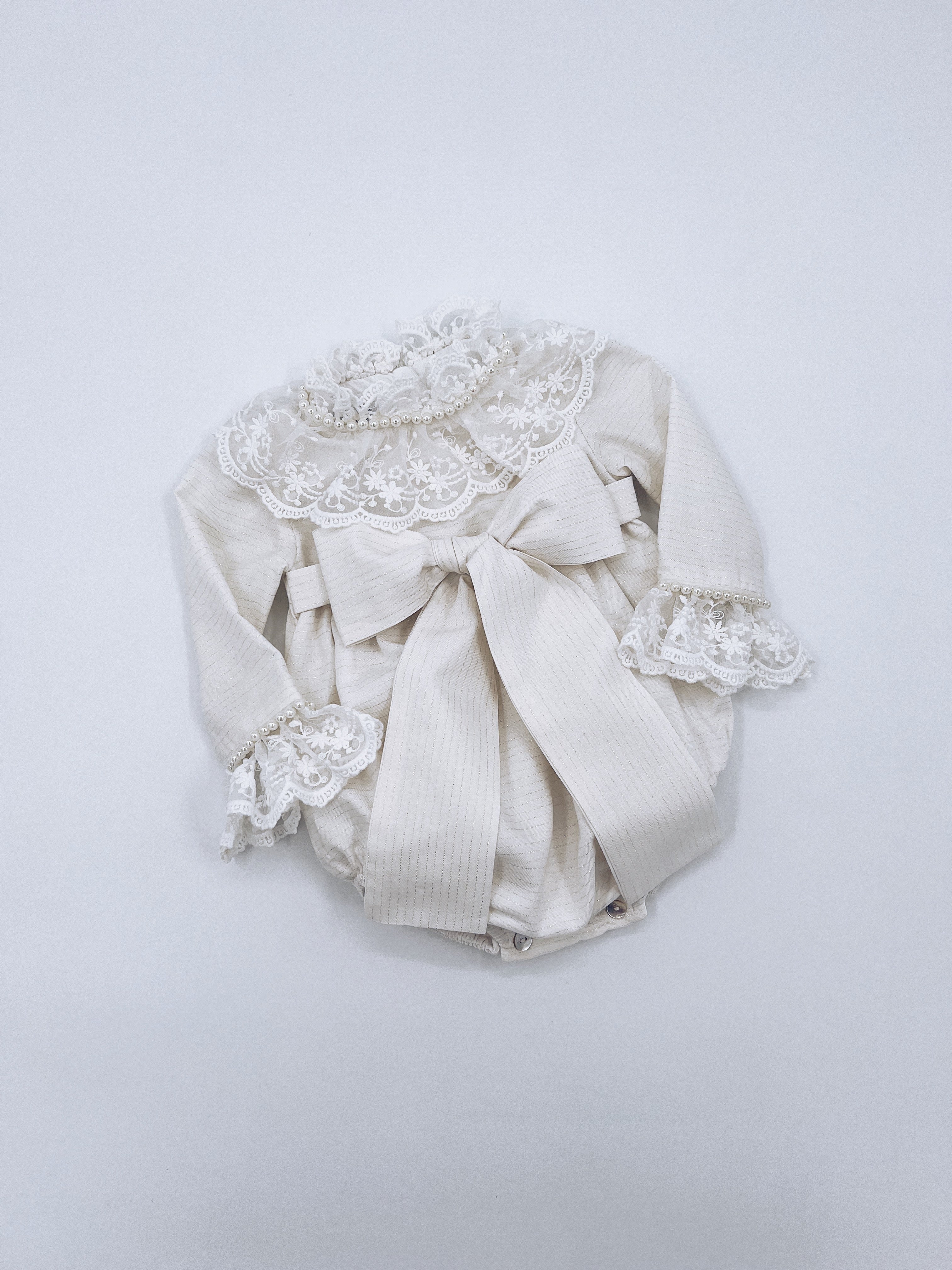 Beautiful Romper with Lovely Bow ,Faux Pearls and Lace details.