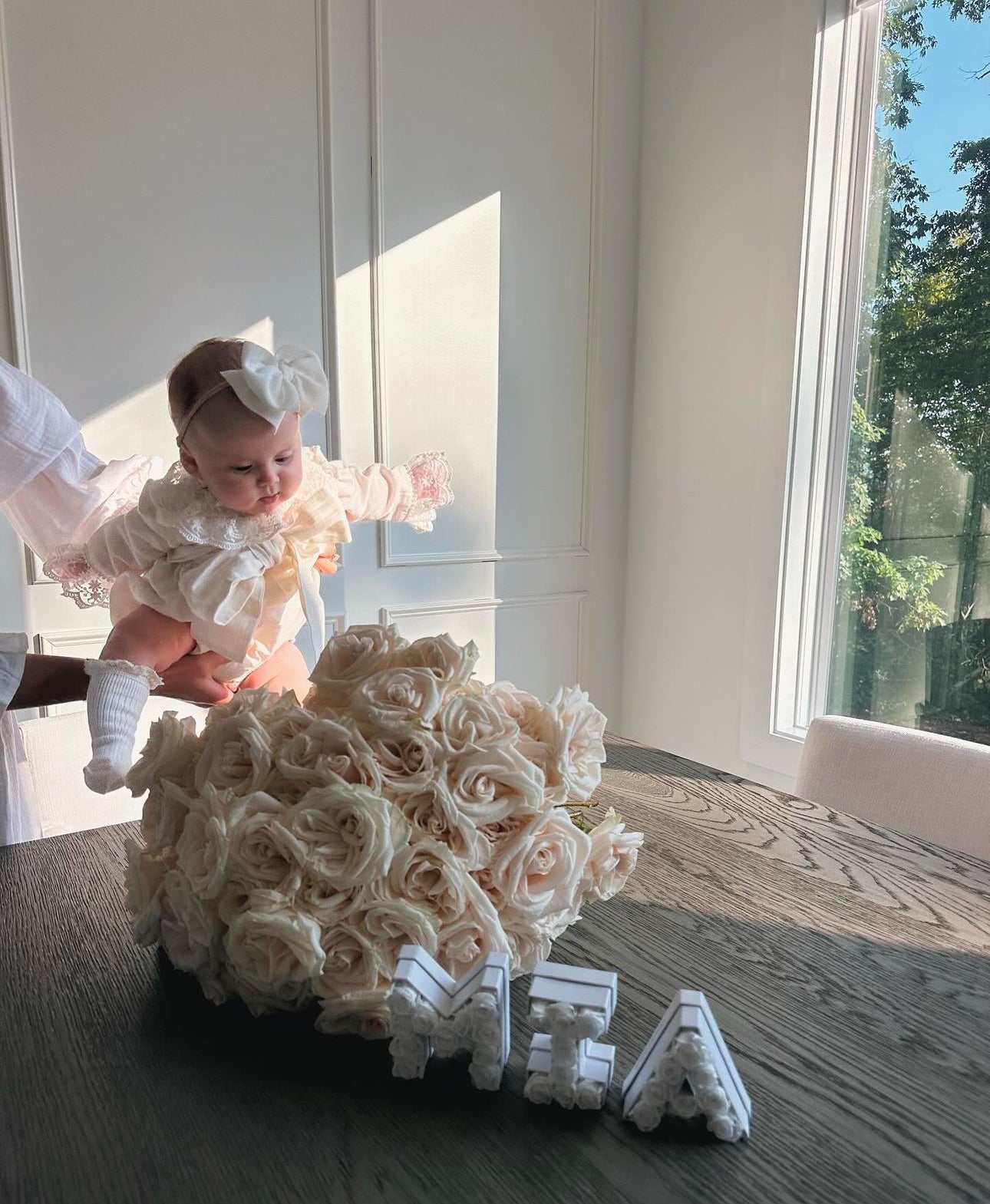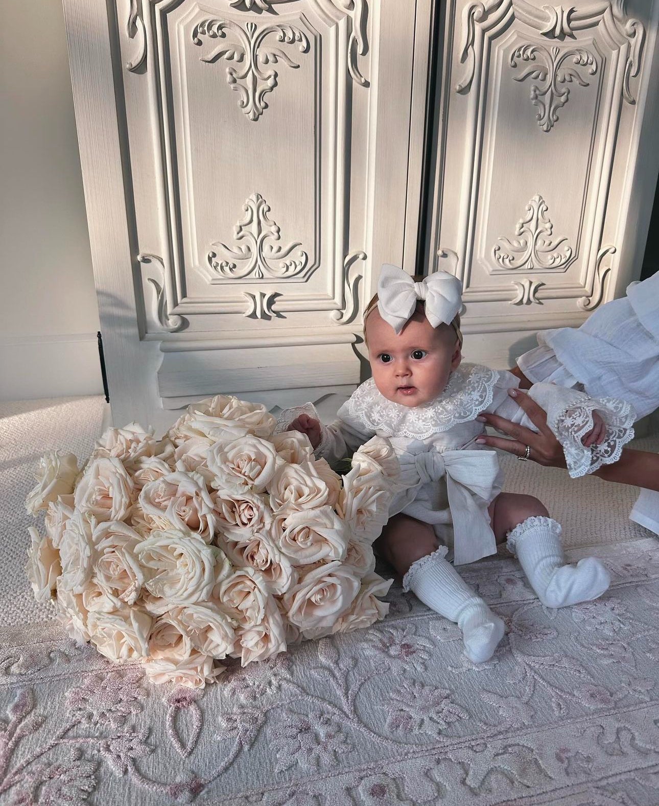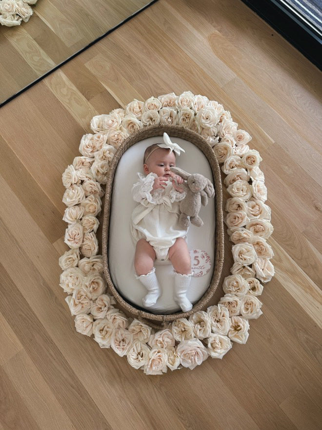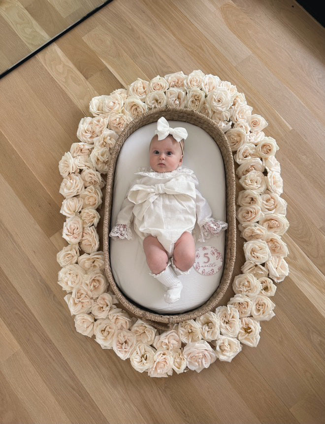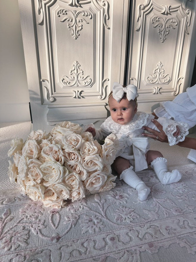Beautiful Romper with Lovely Bow ,Faux Pearls and Lace details.