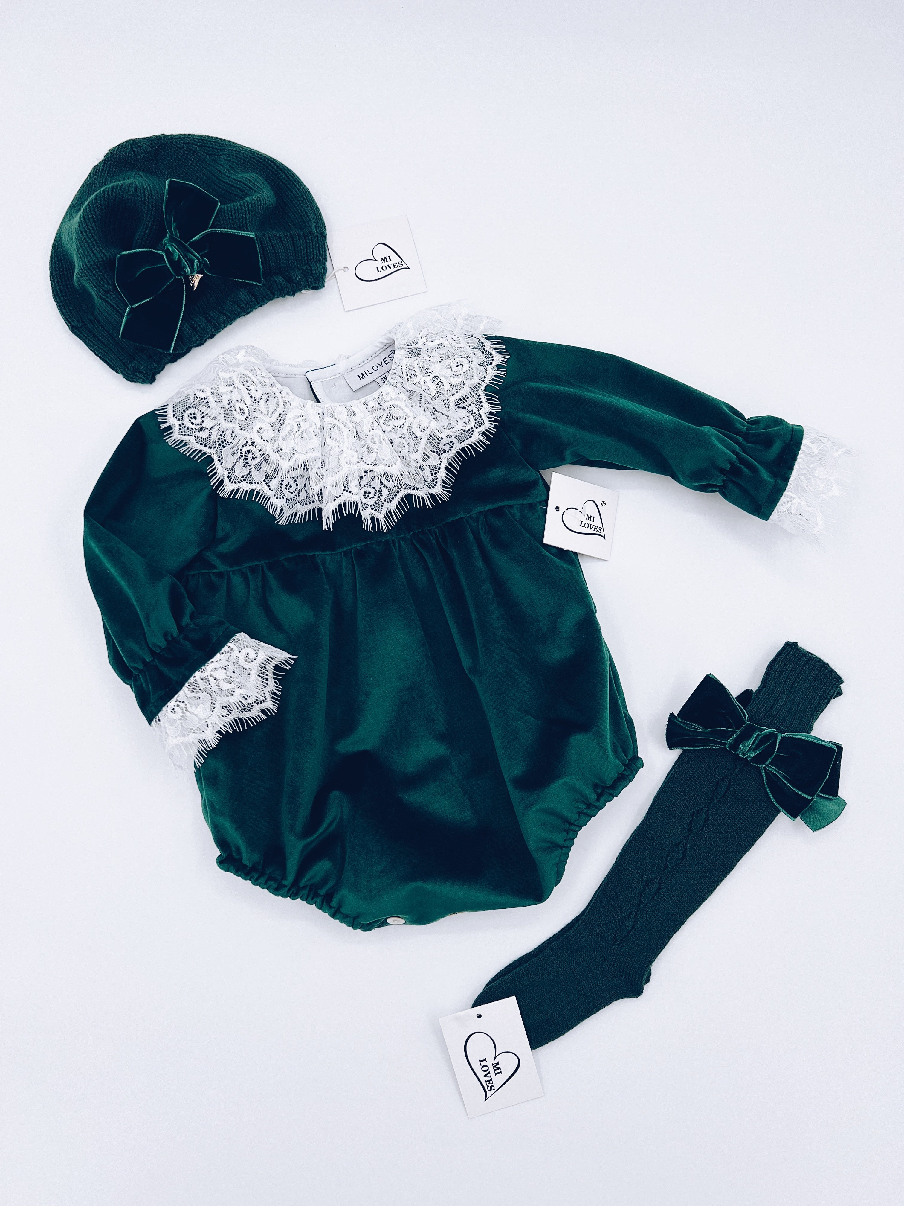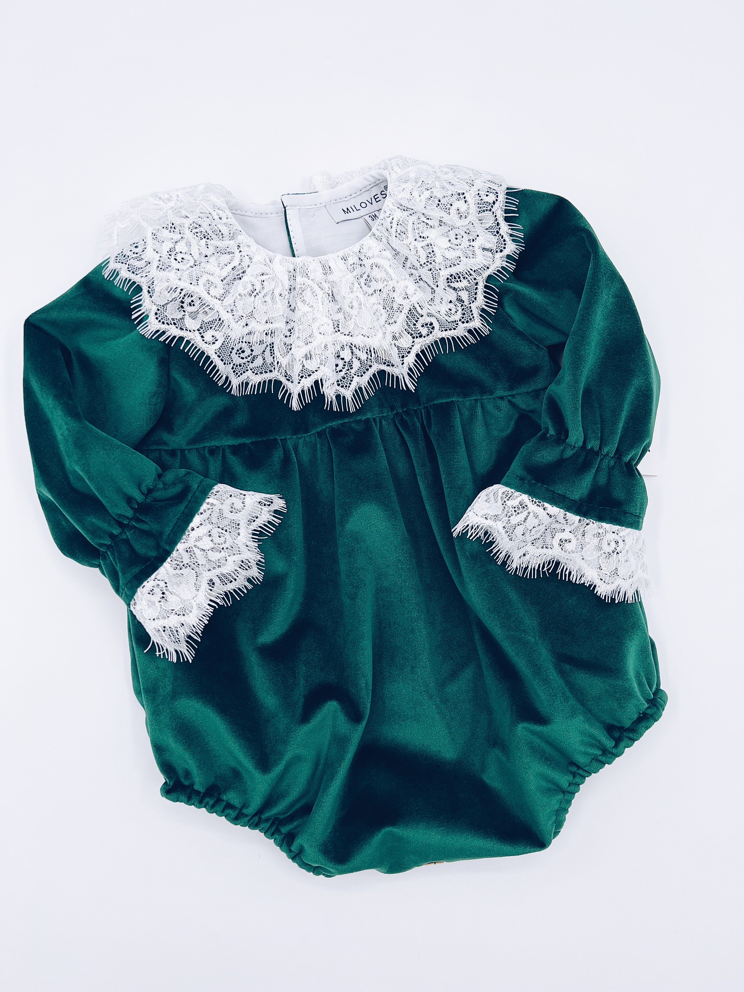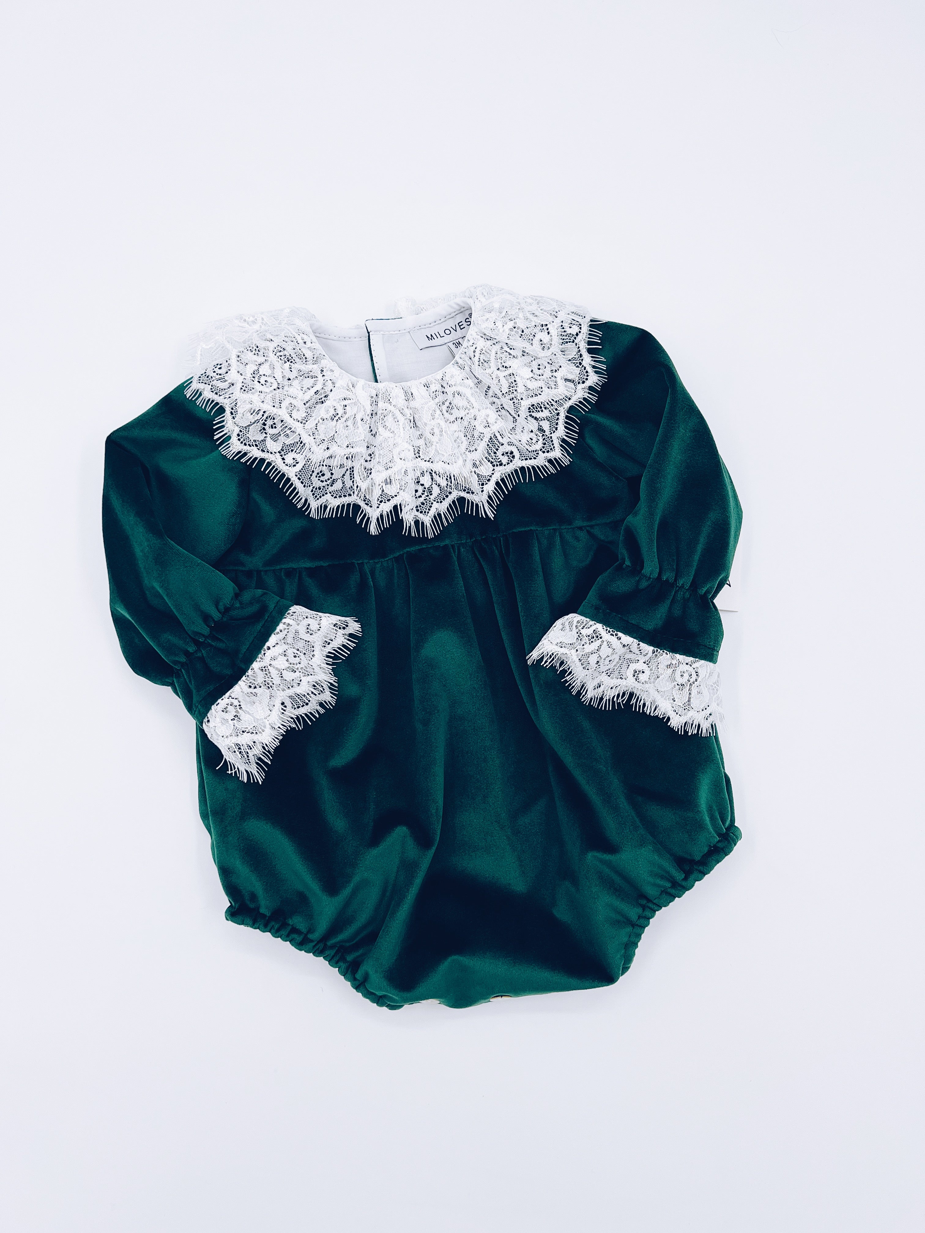 MI LOVES Beautiful Deep Green Velvet romper with White Lace details on the neck and sleeves.
