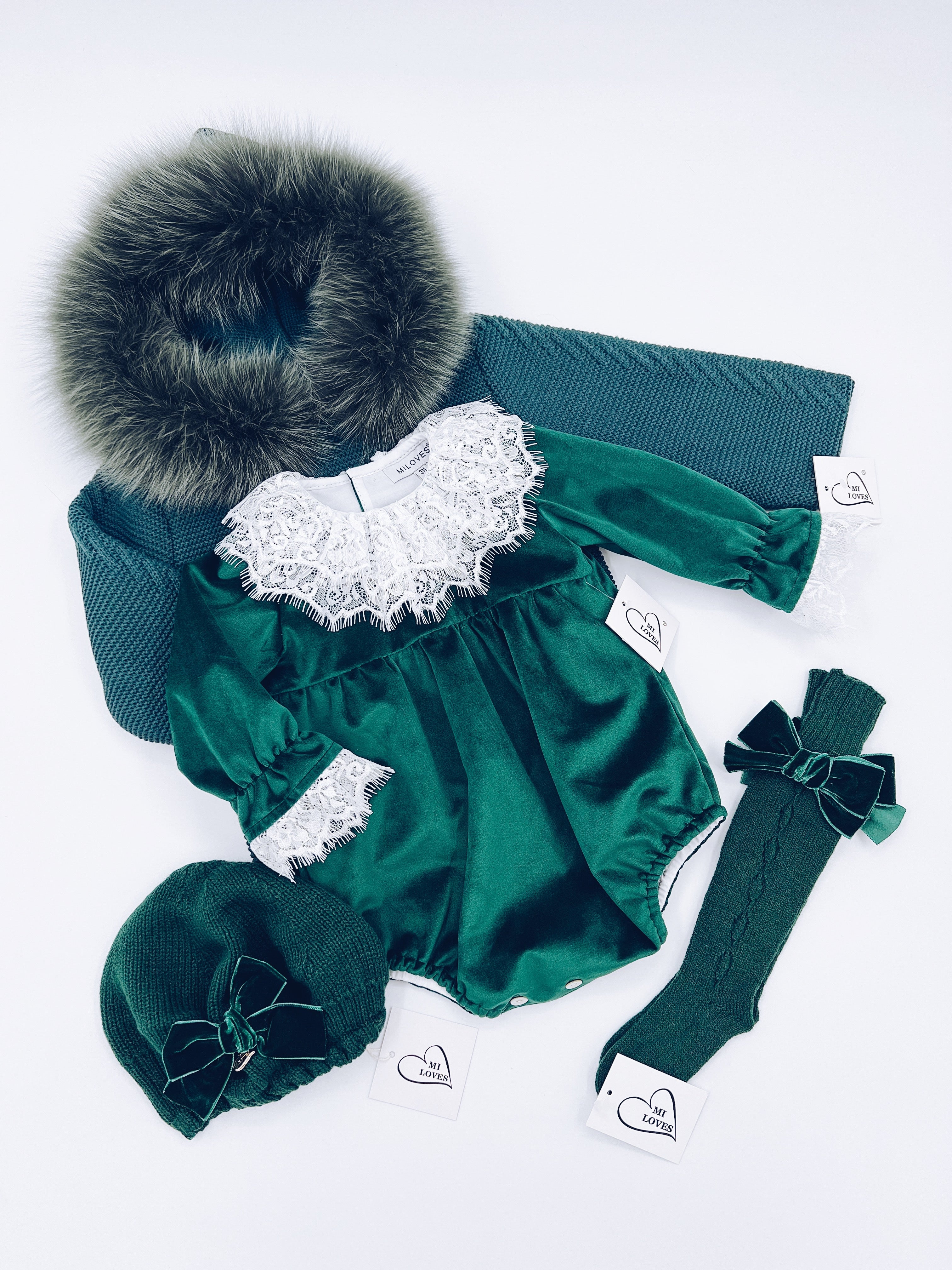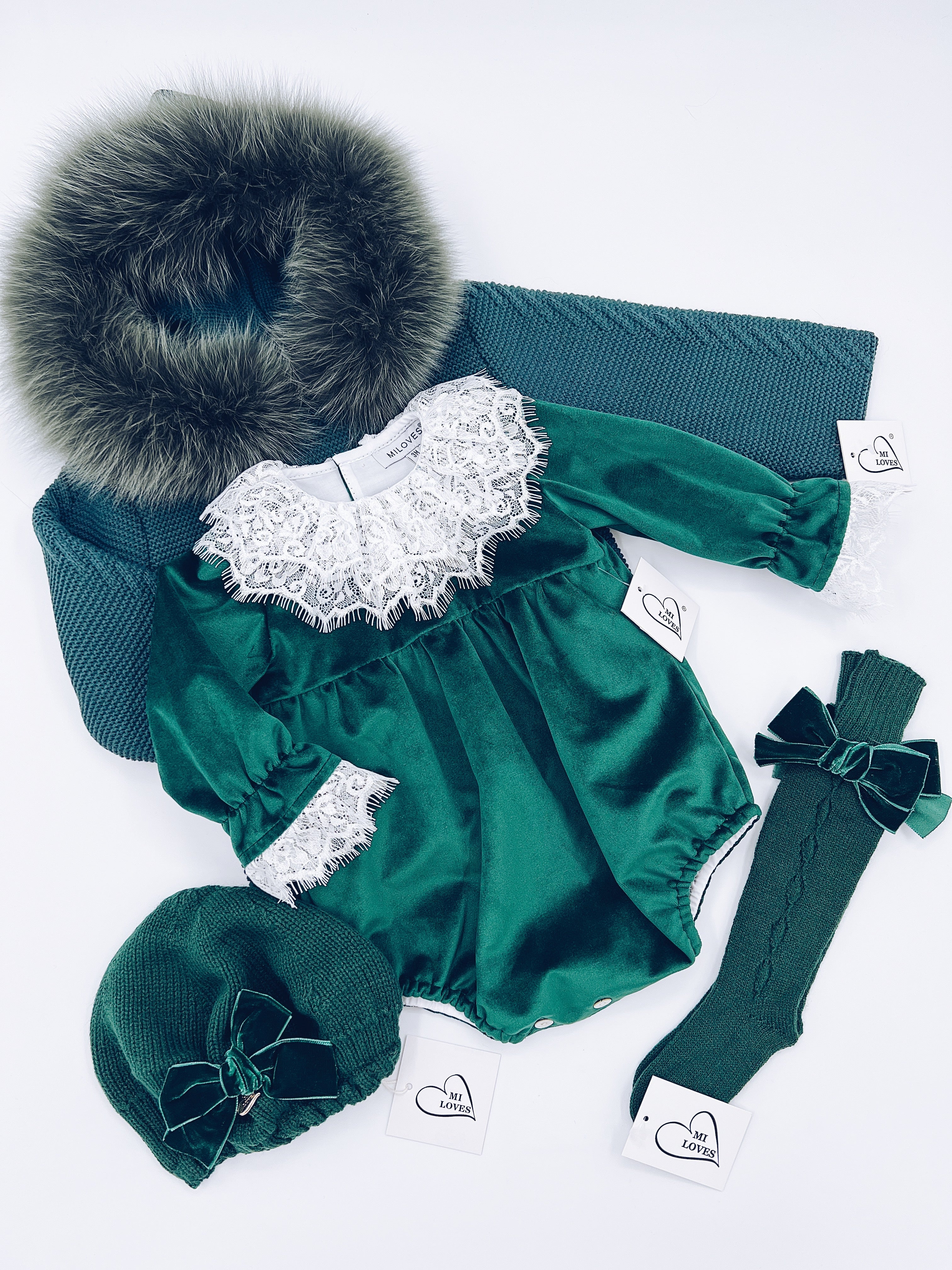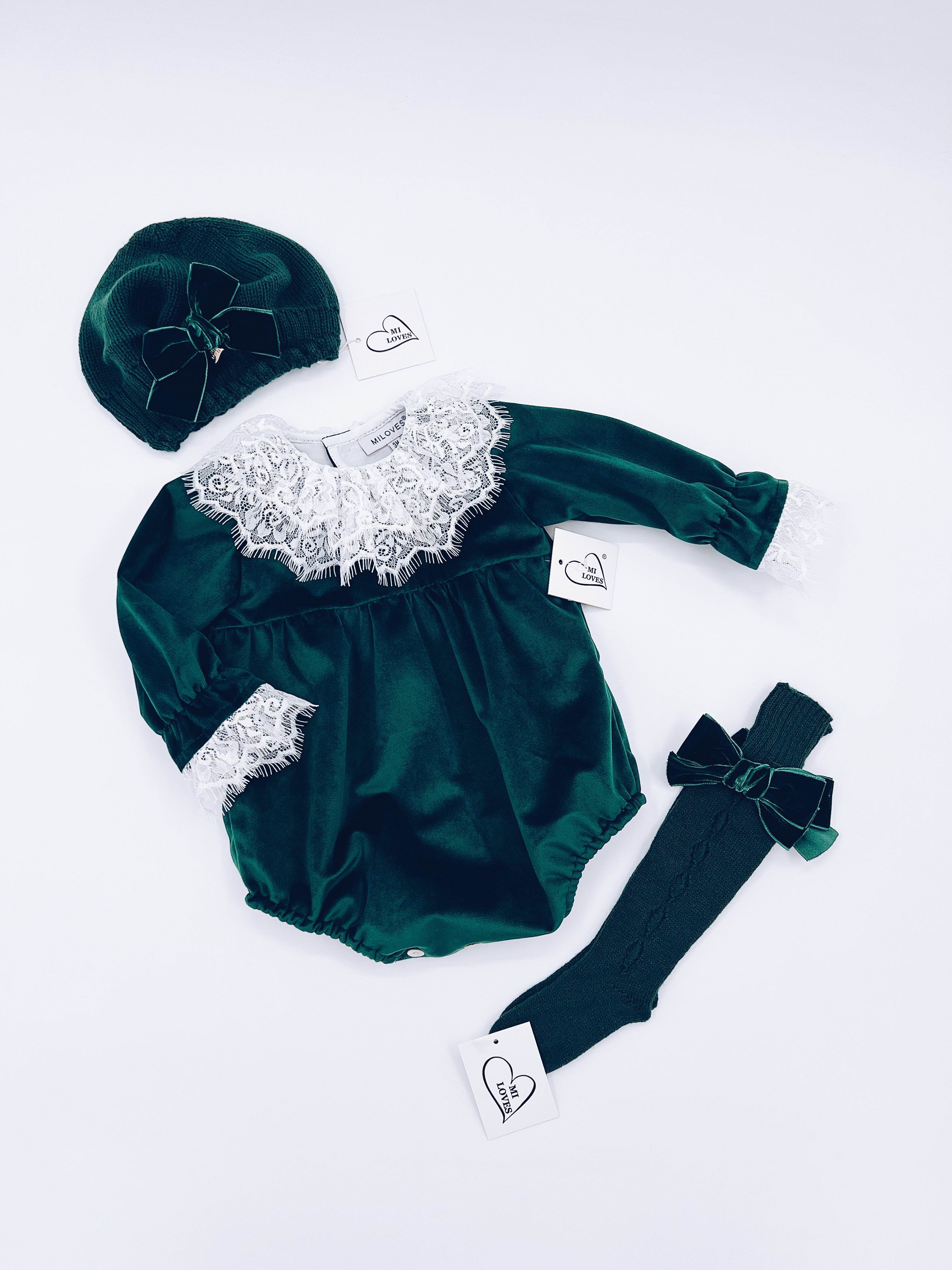 MI LOVES Beautiful Deep Green Velvet romper with White Lace details on the neck and sleeves.