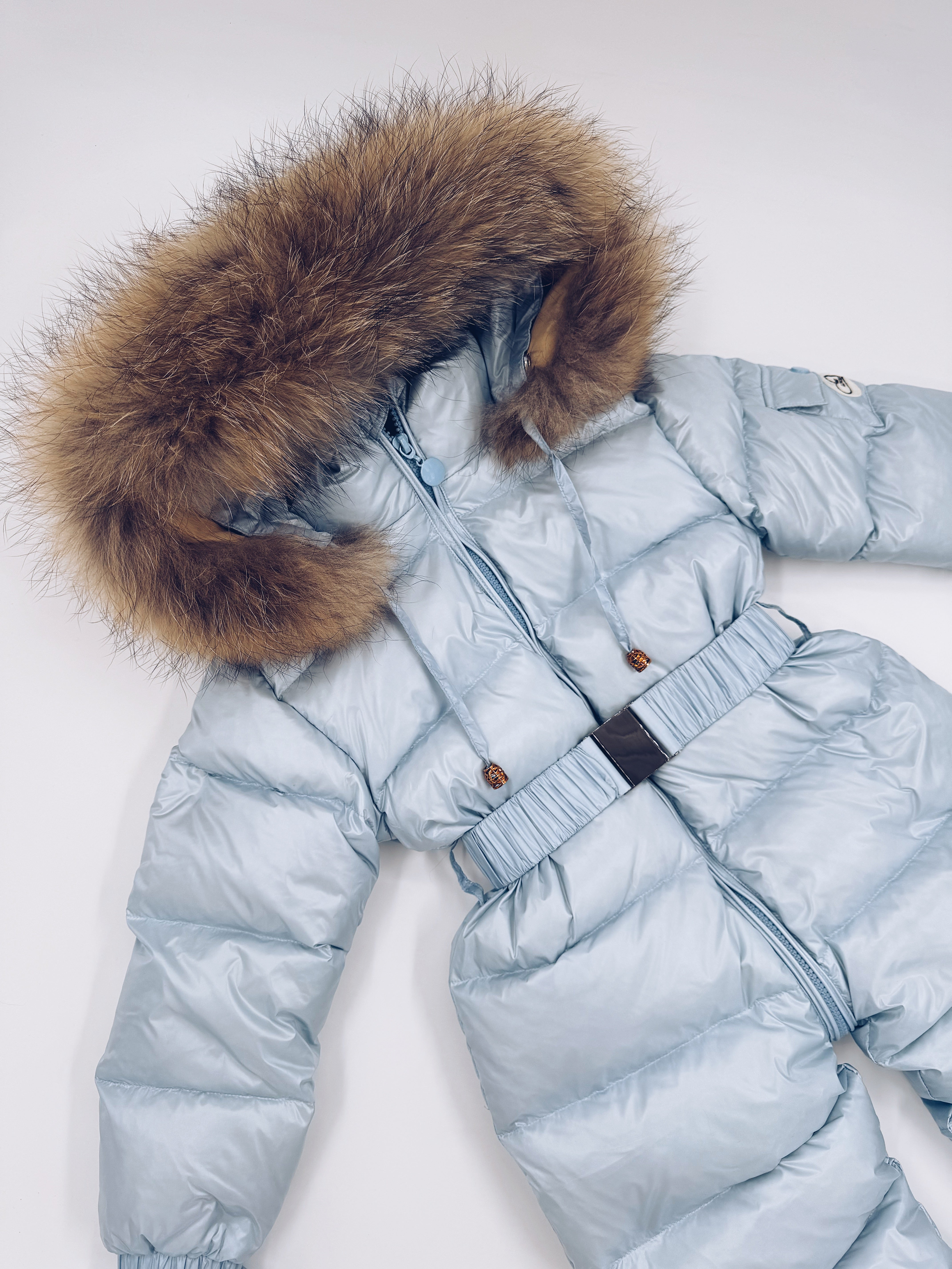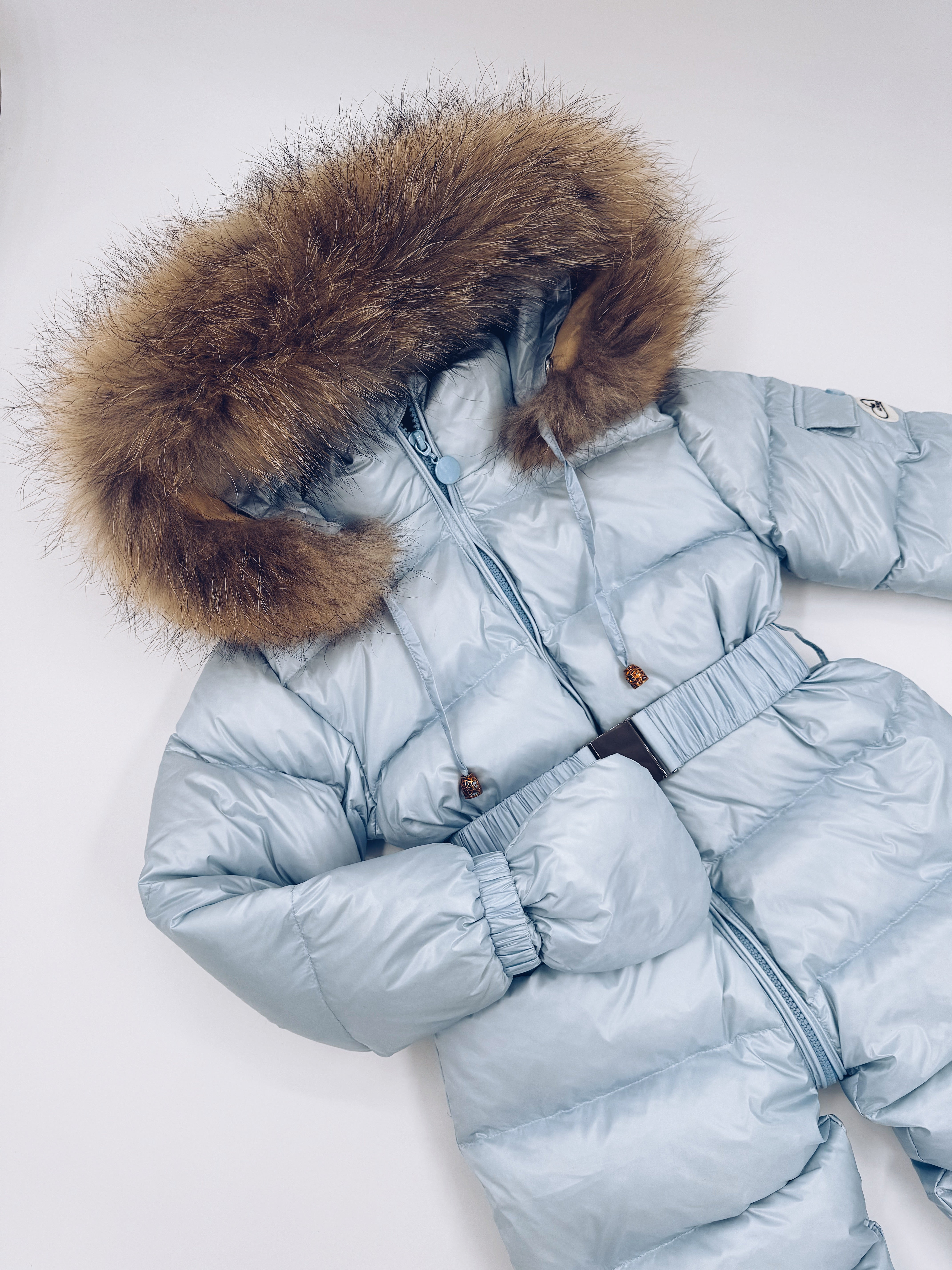 MI LOVES SIGNATURE LUXURIOUS RACOON FUR TRIM SNOWSUIT in Pearl Blue