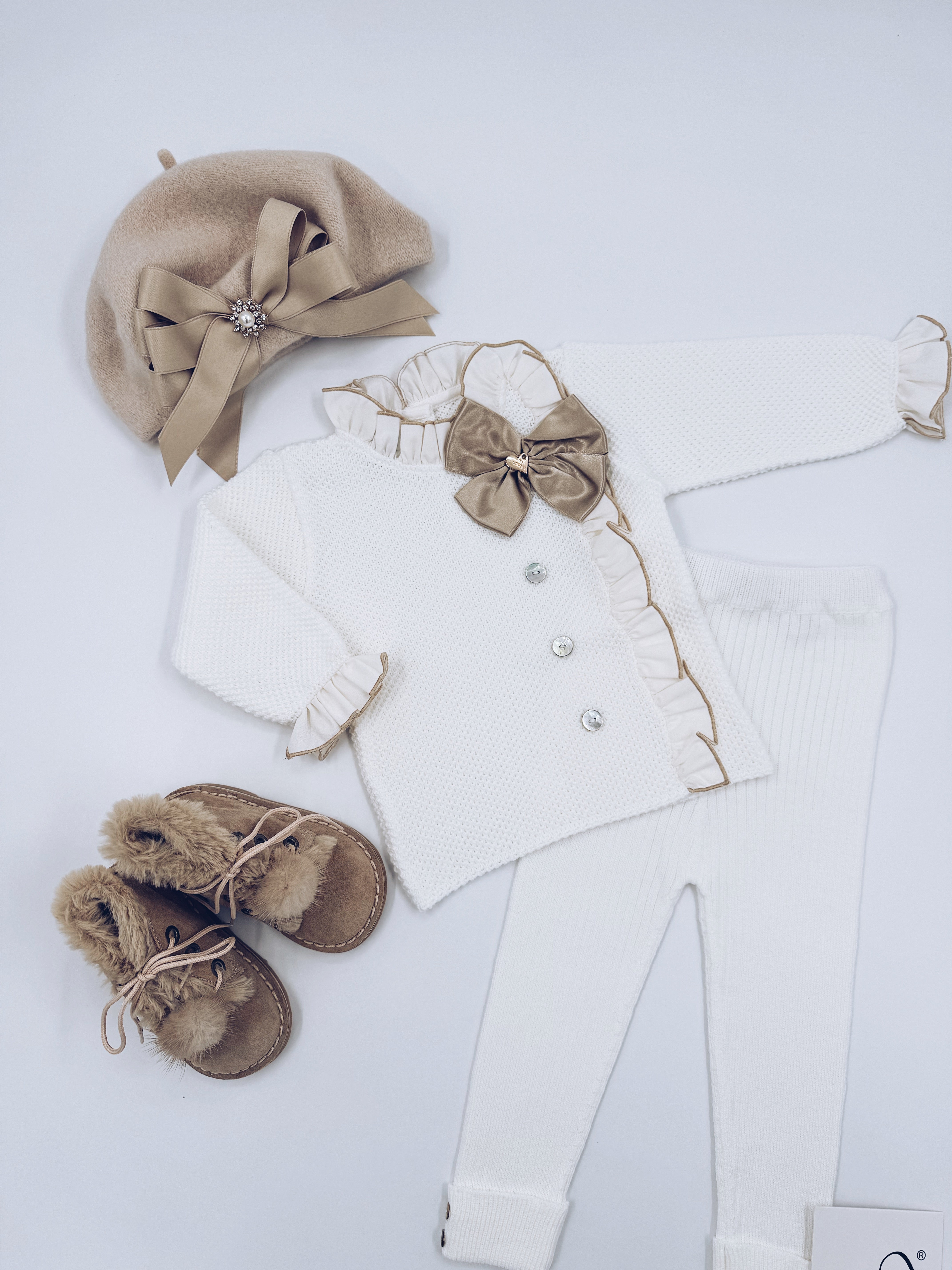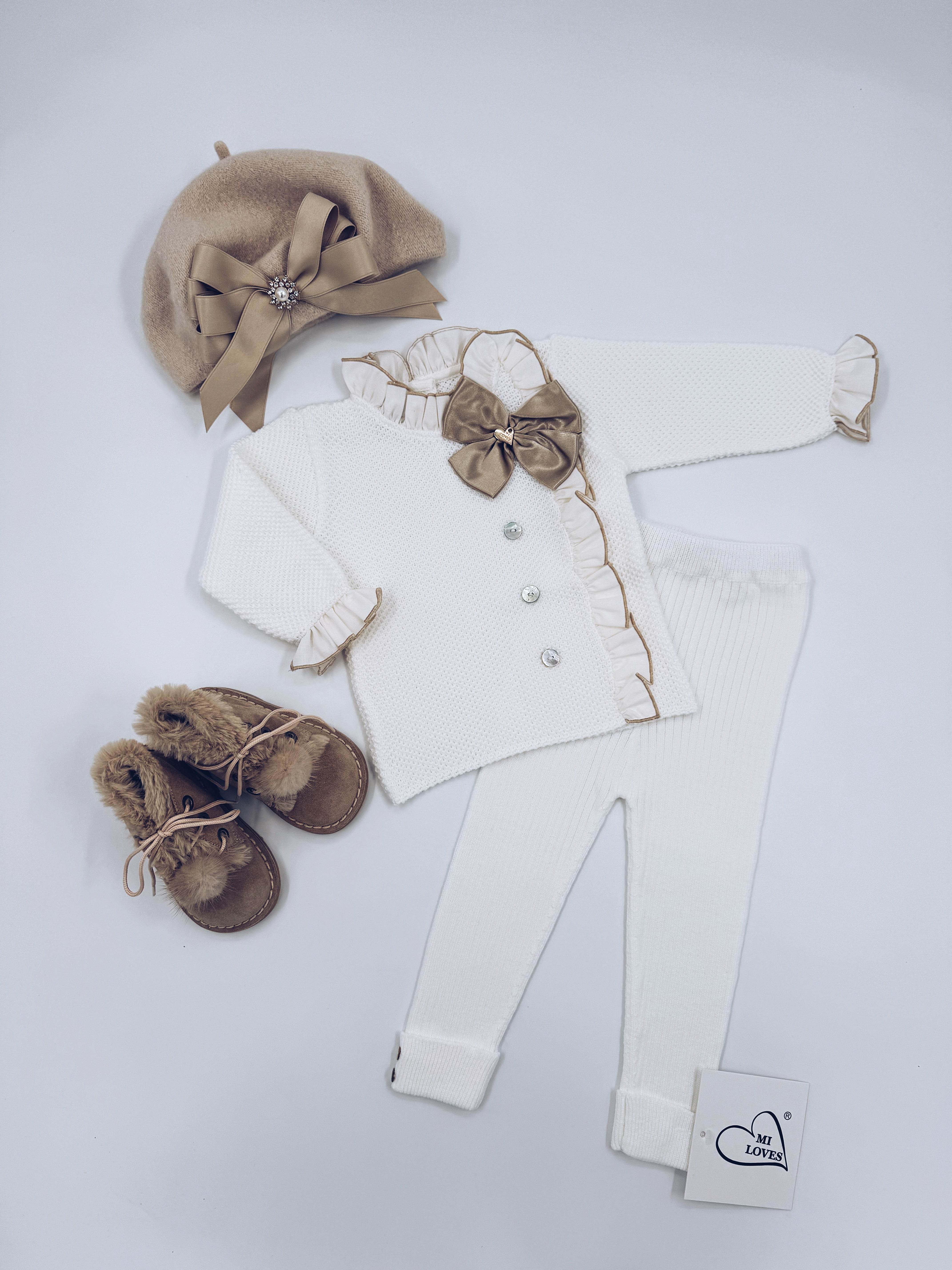 MI LOVES Signature Beautiful Ivory knitted ribbed leggings 2 piece set with Camel bow and frill details.