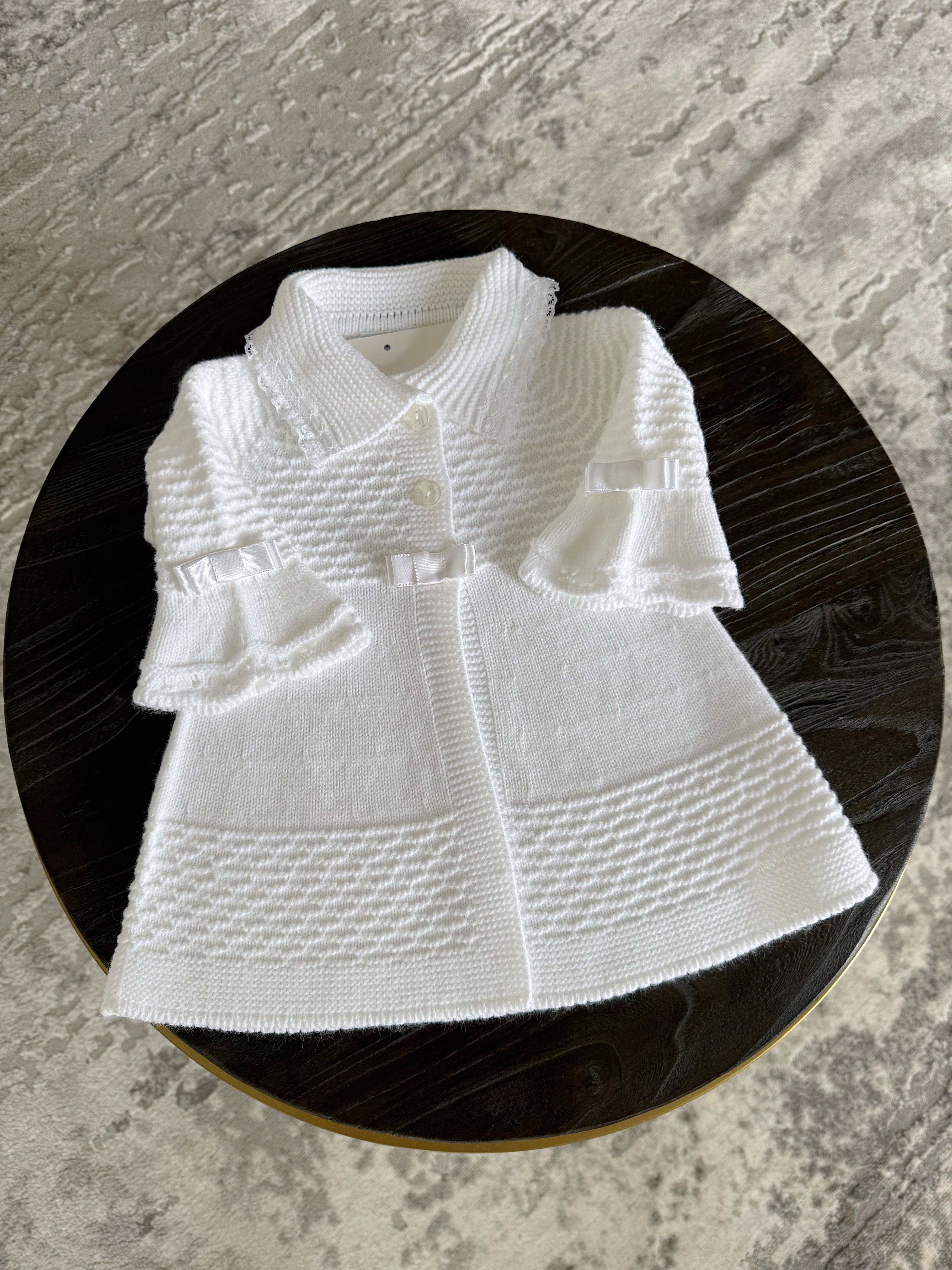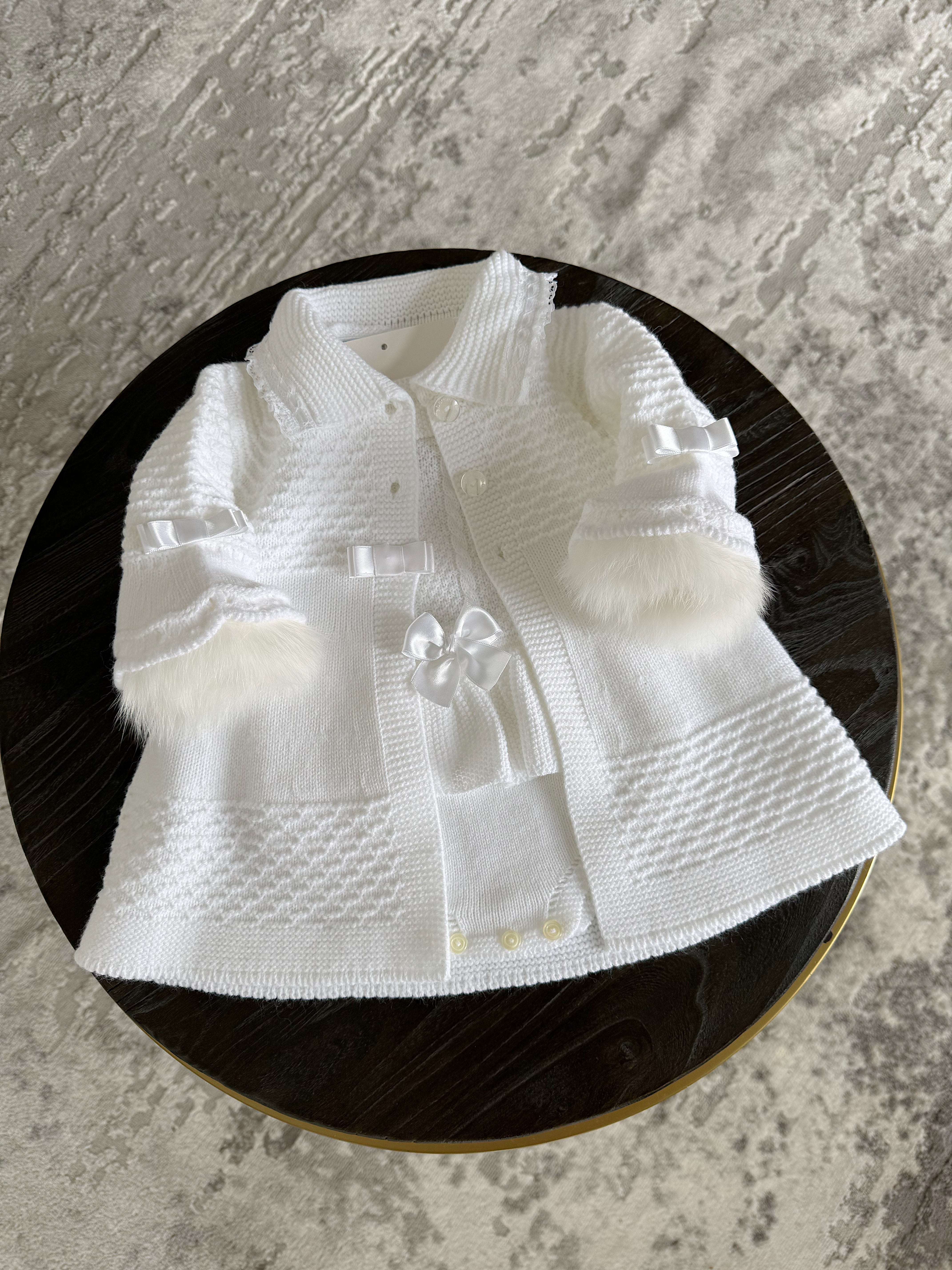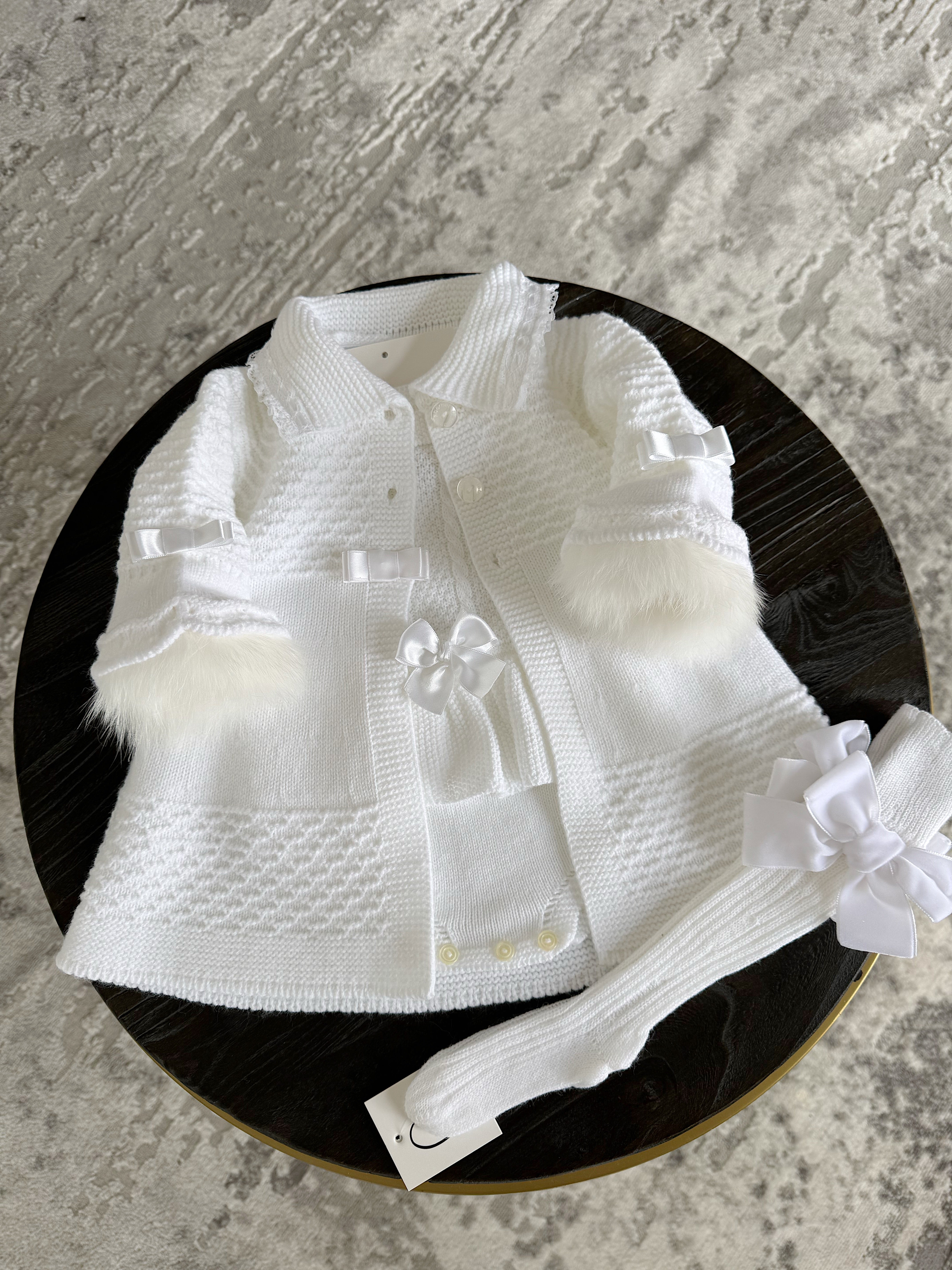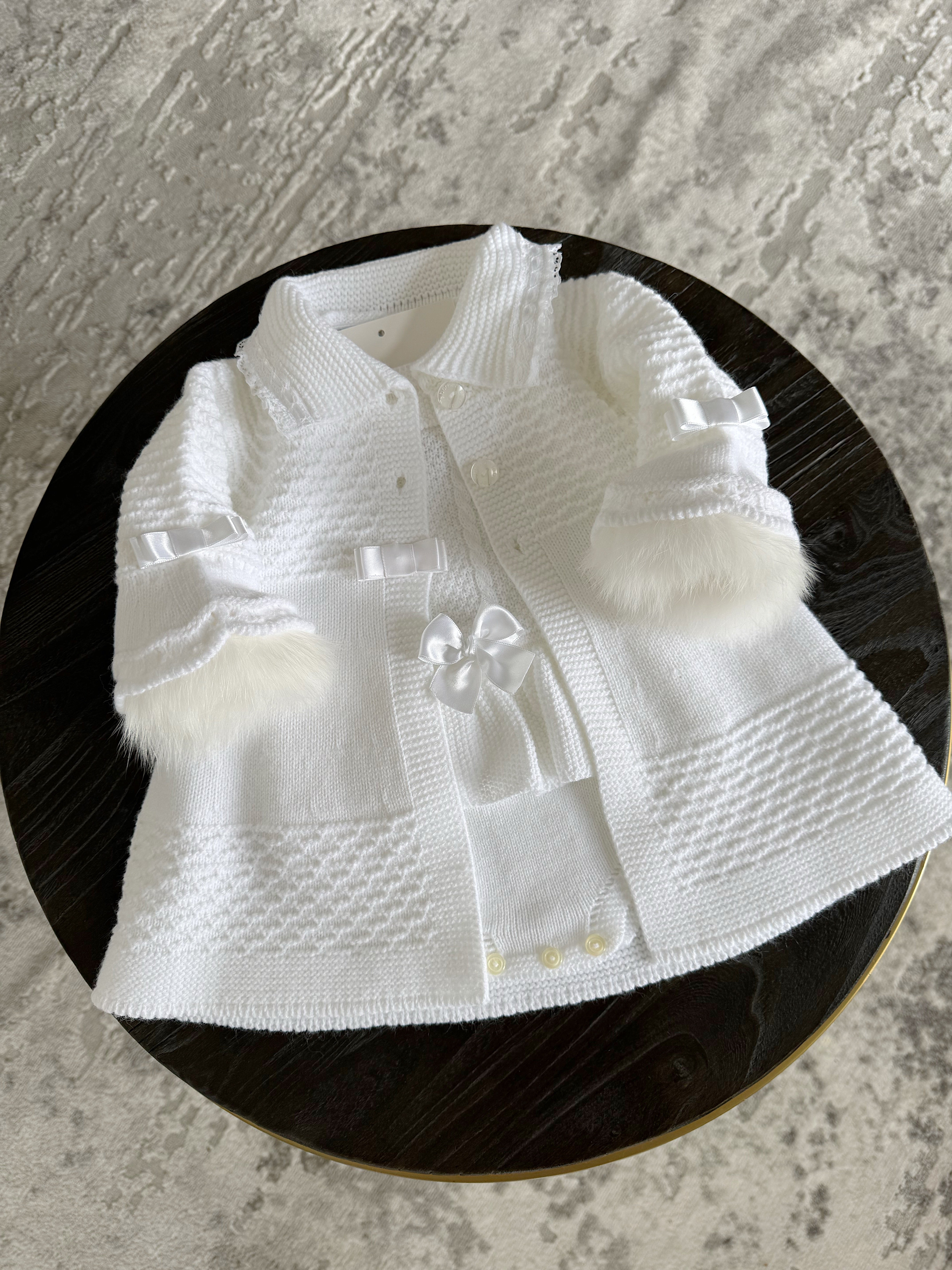 White/Ivory Knitted Long Line Cardigan with Beautiful bell sleeves.Perfect to use with our knitted romper with fur trim sleeves.