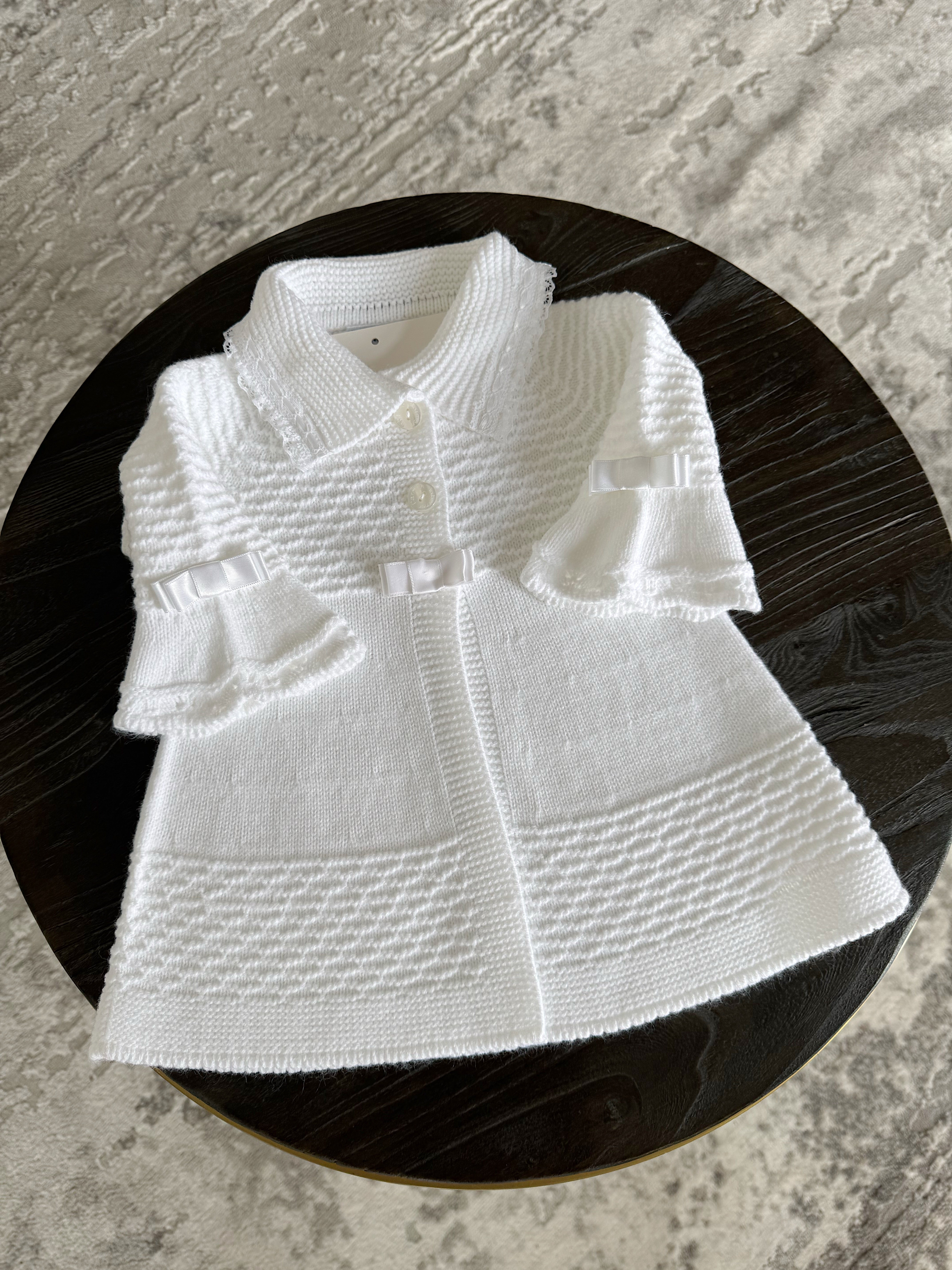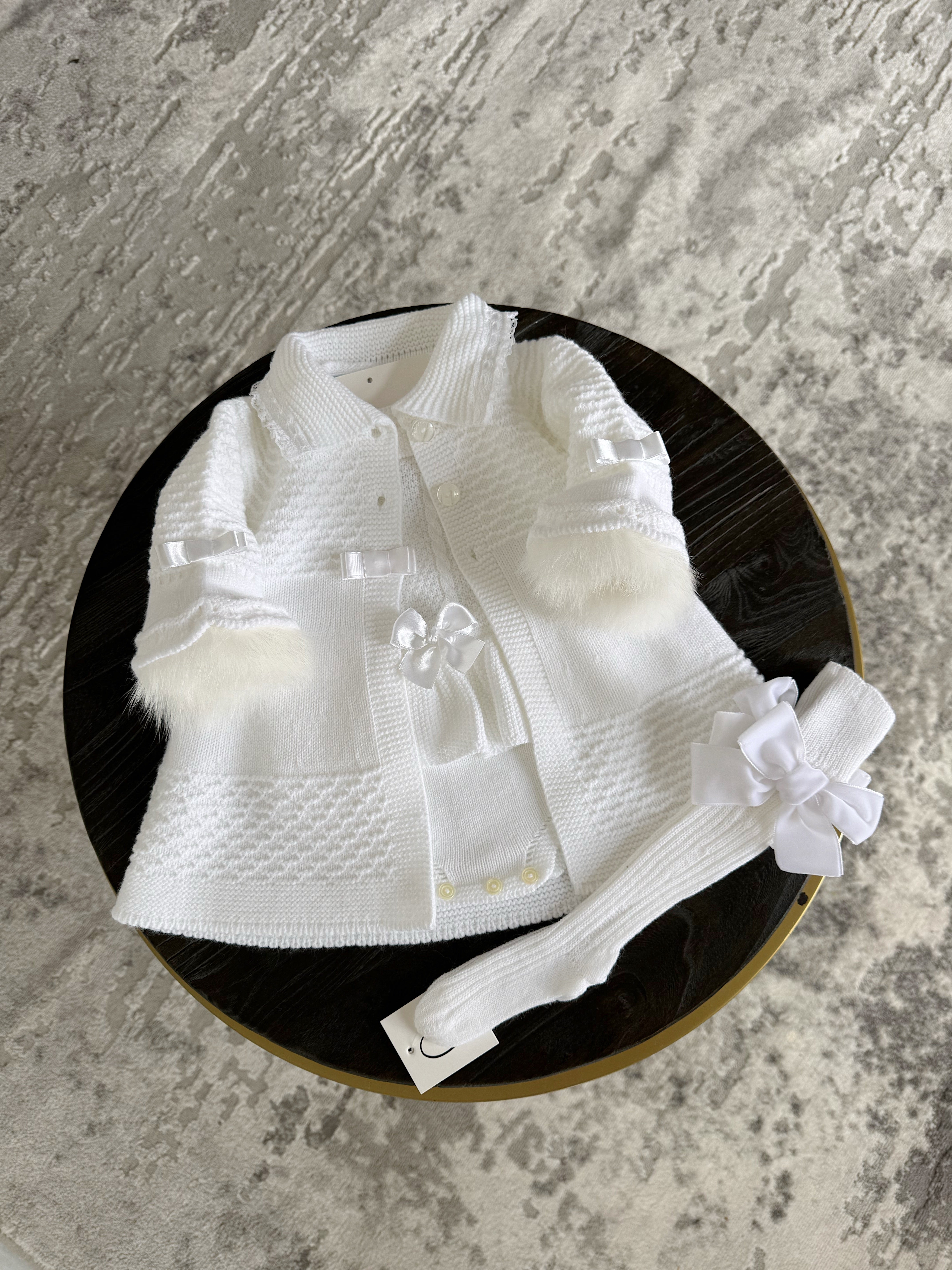 Cardigan ONLY ,matching Romper,pompom hats,knitted socks (Sold separately)also available on the website.