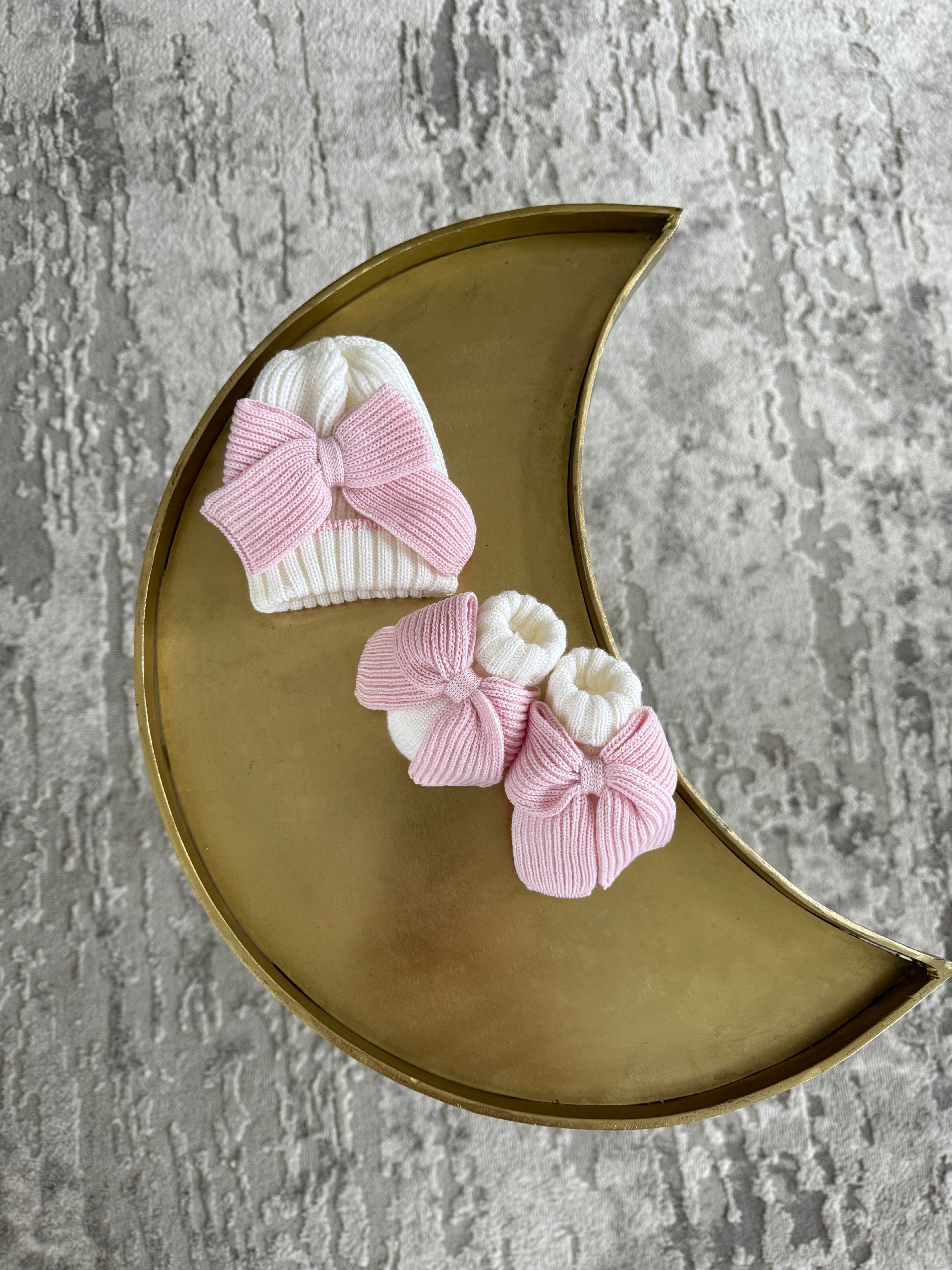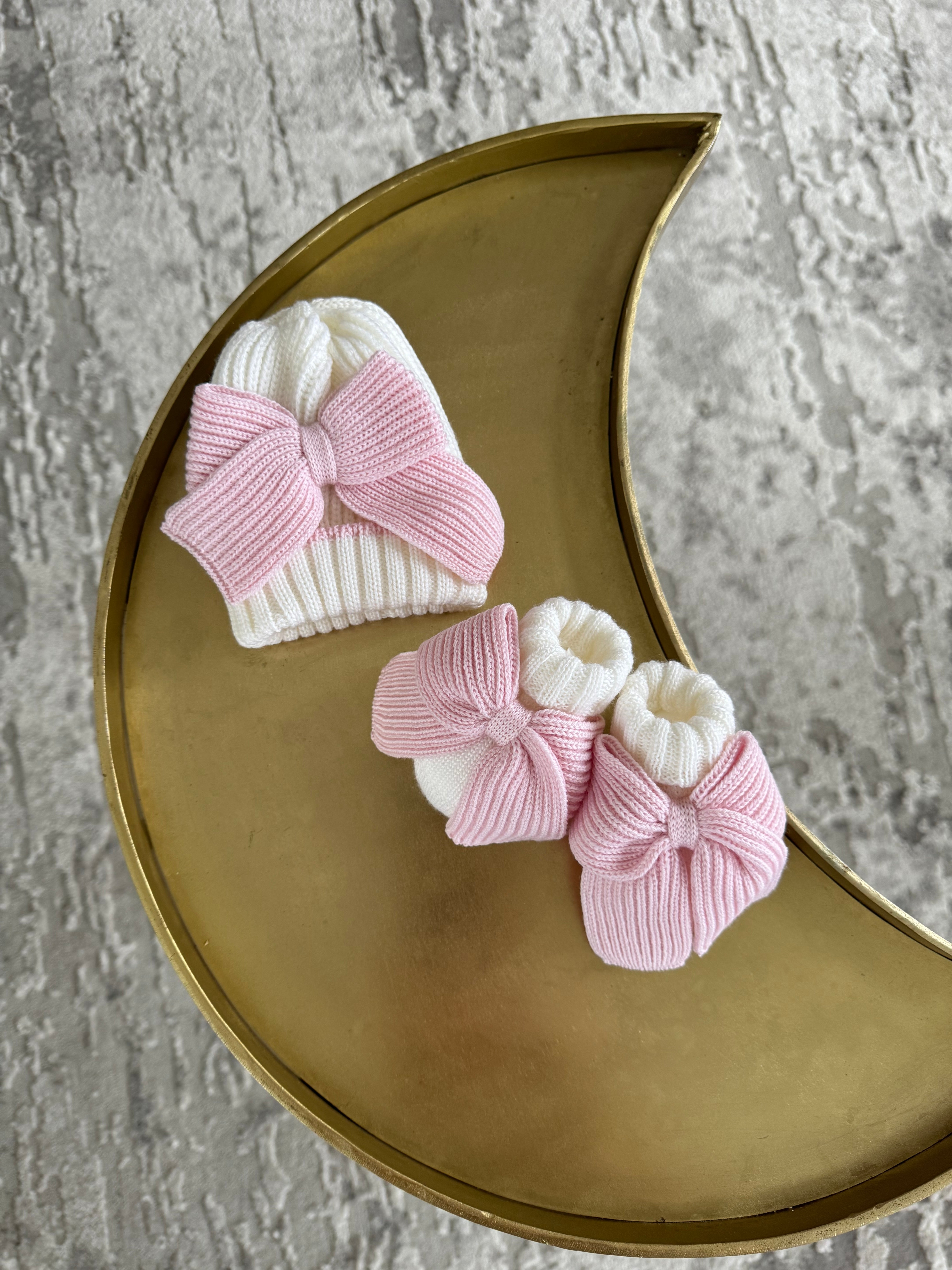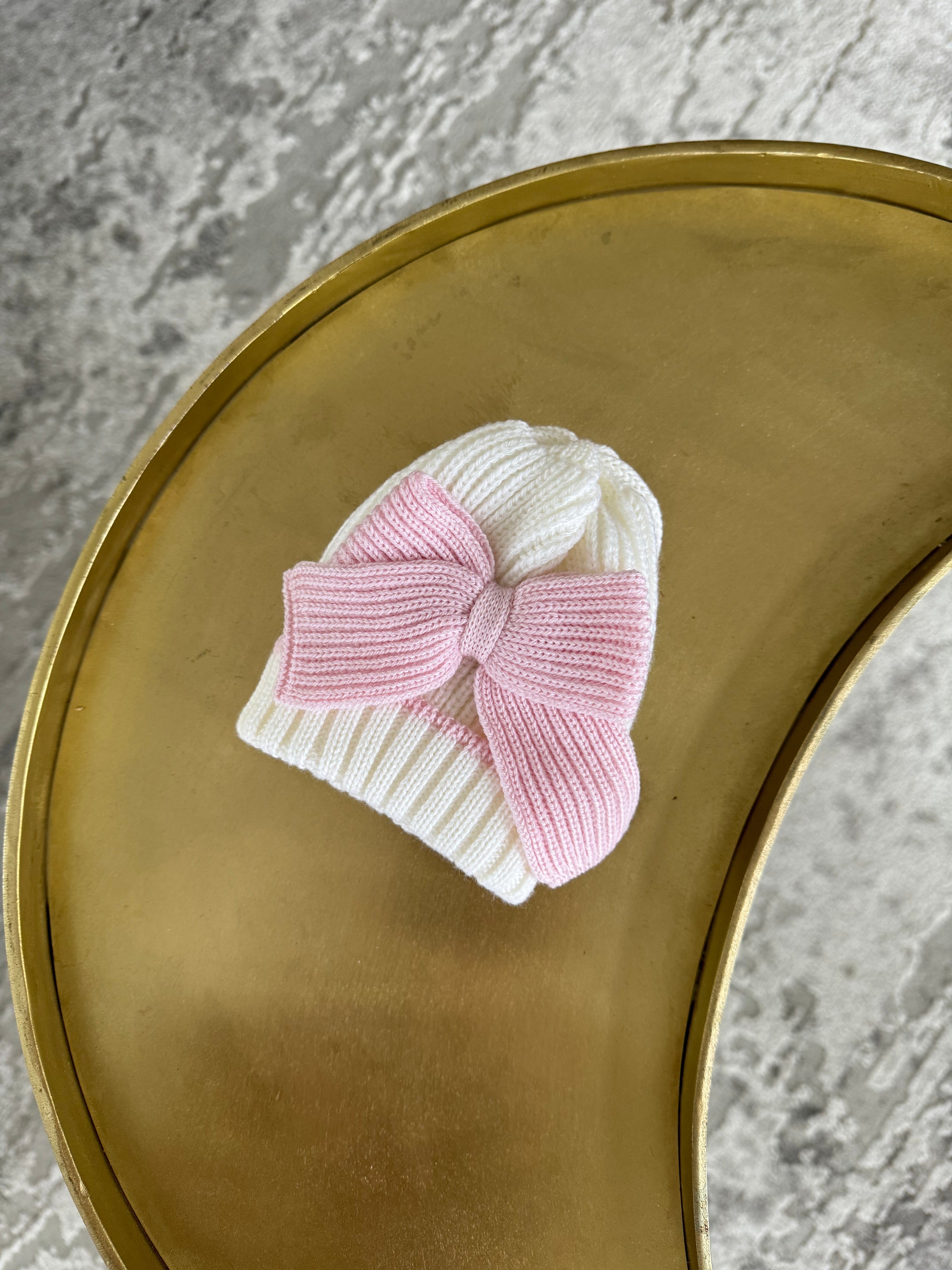 Beautiful knitted Merino wool Ivory/White Baby girl hat with Bow details.