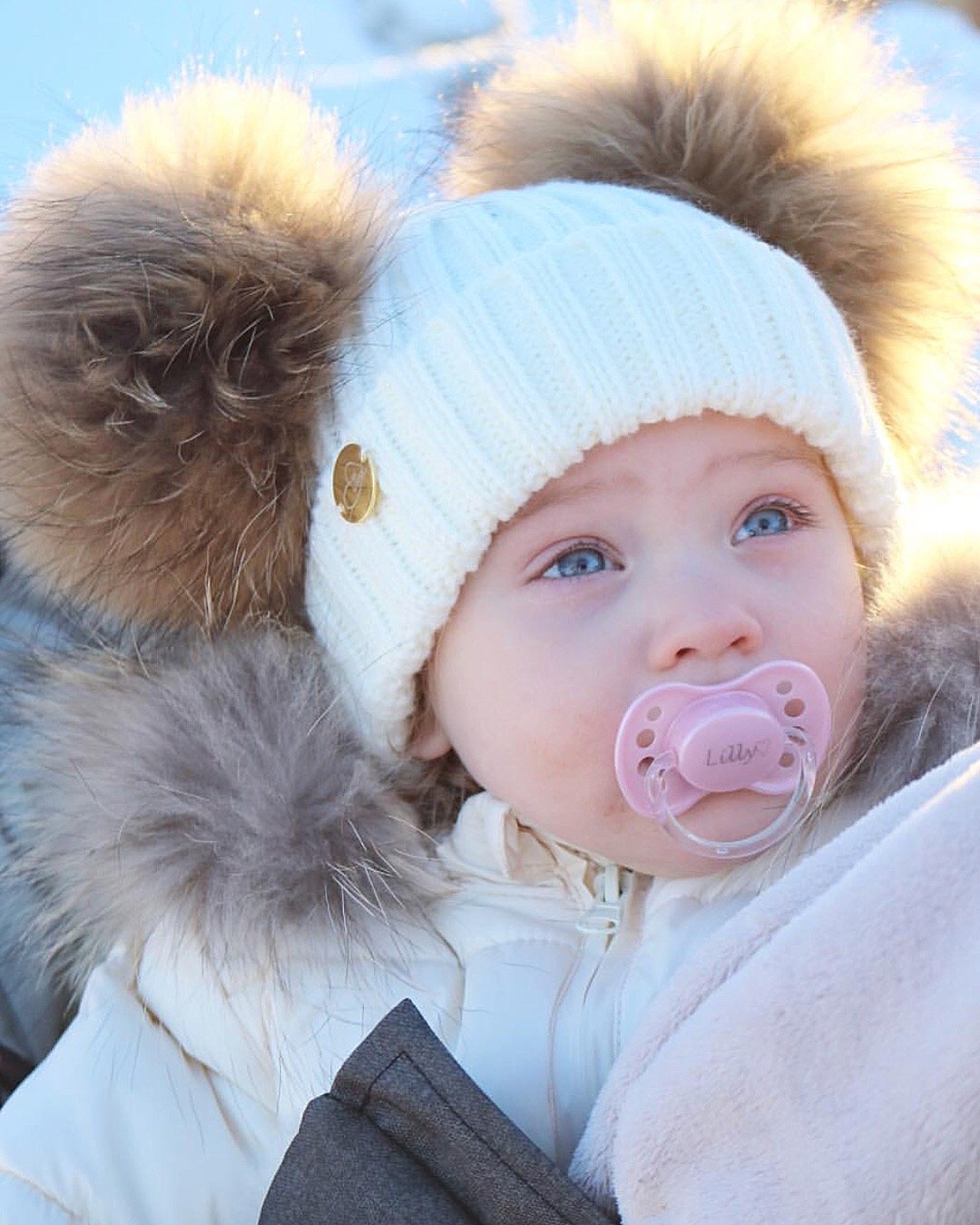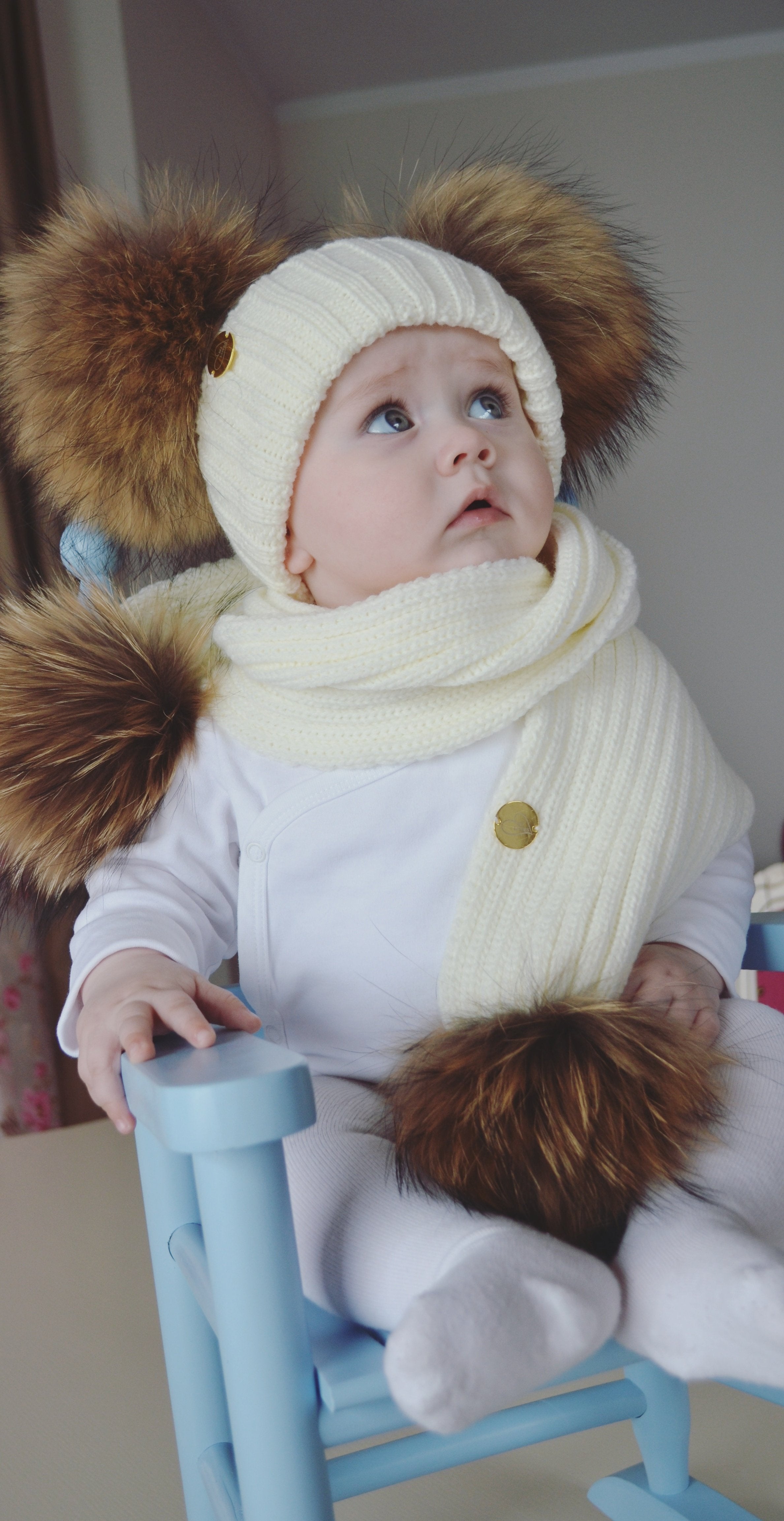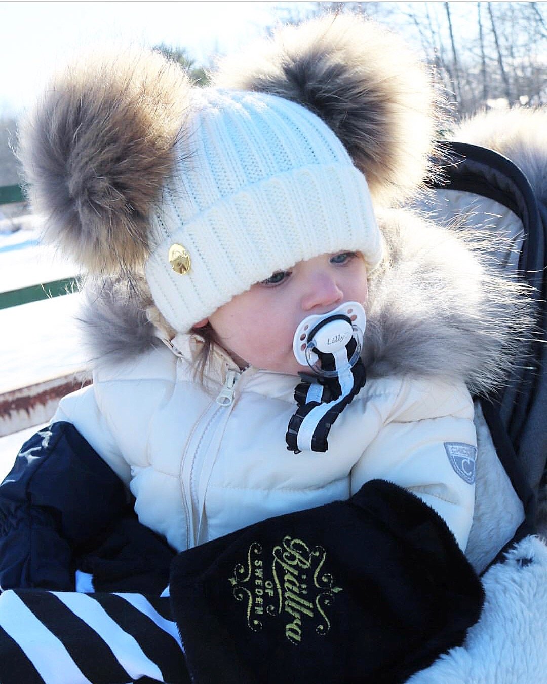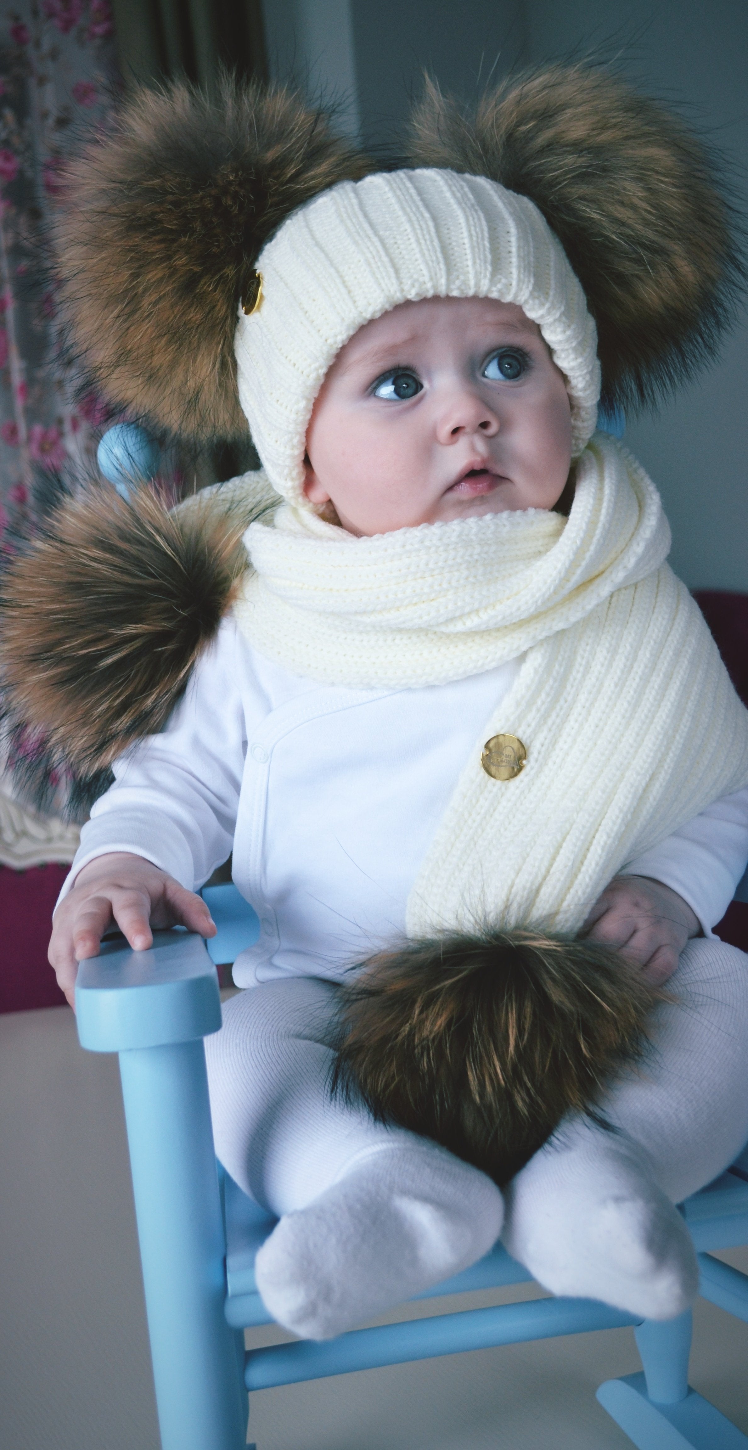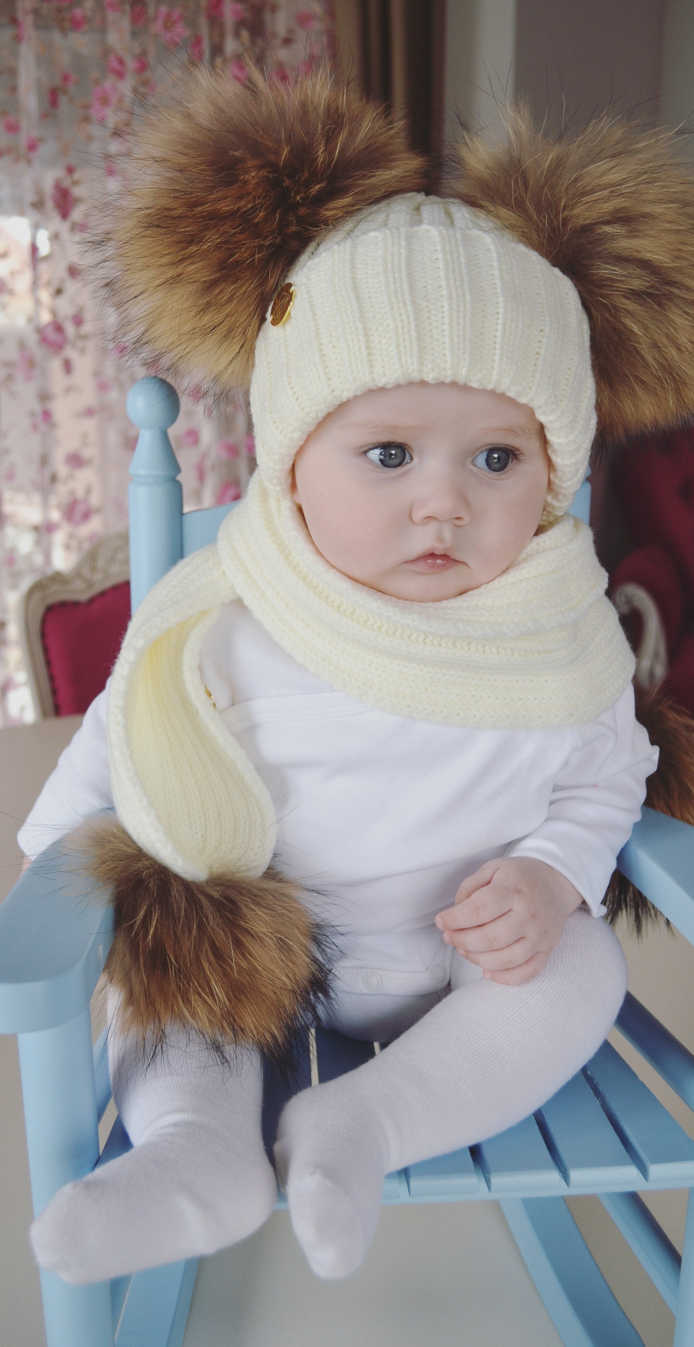 White custome made hat with Racoon PomPoms (huge 14cm PomPoms)