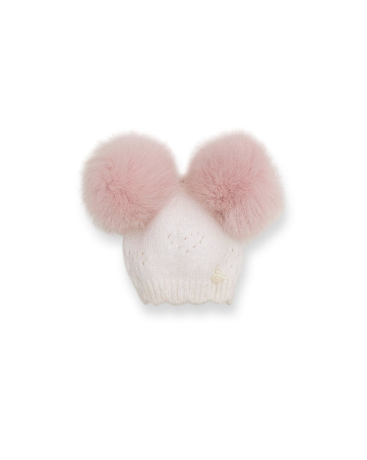 Ivory MI LOVES SIGNATURE Little Hearts Double pompom hat.Ivory hat with Pink pompoms.