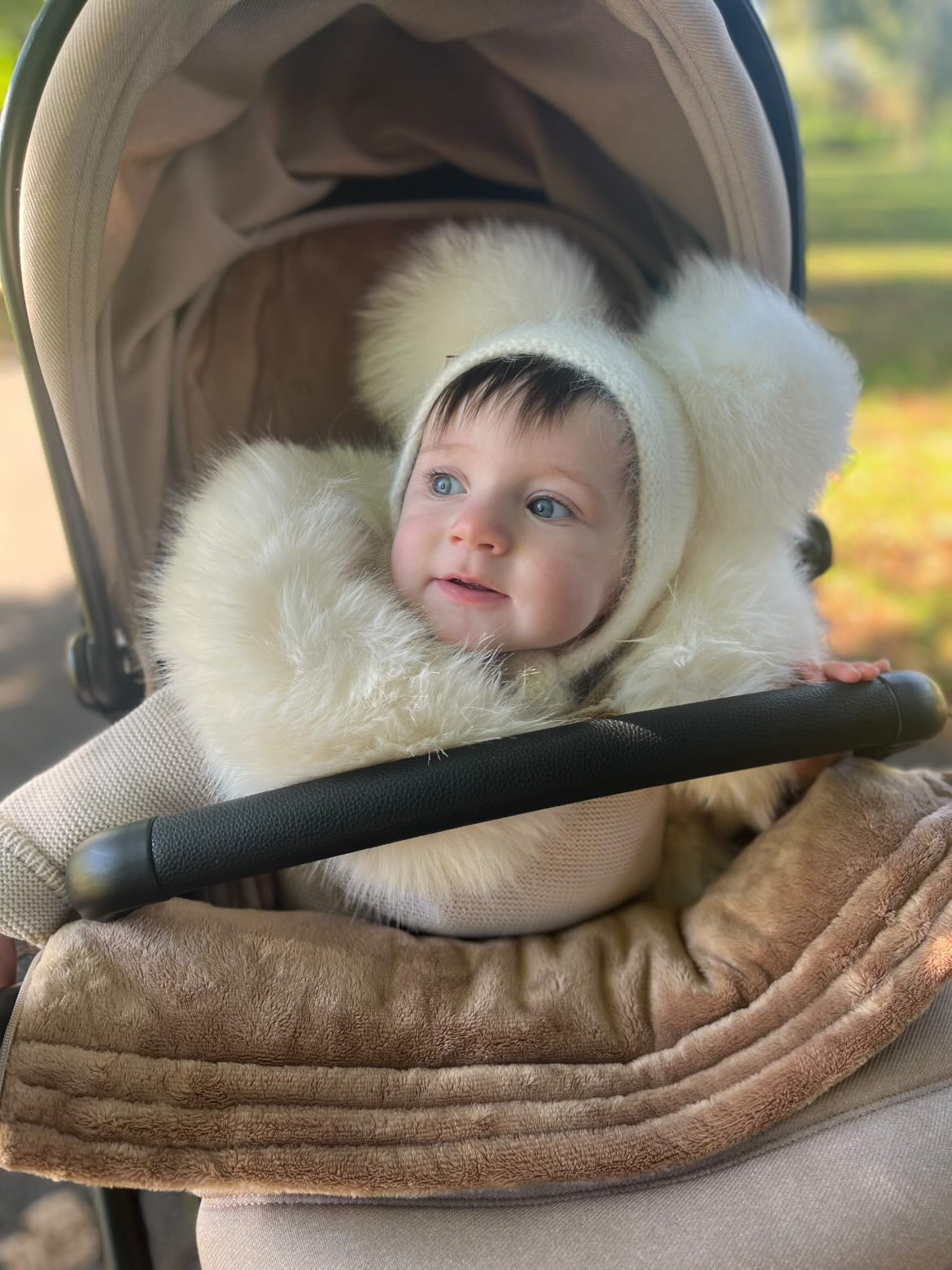 Matching knitted pompom booties (Sold Separately)also available on the website.